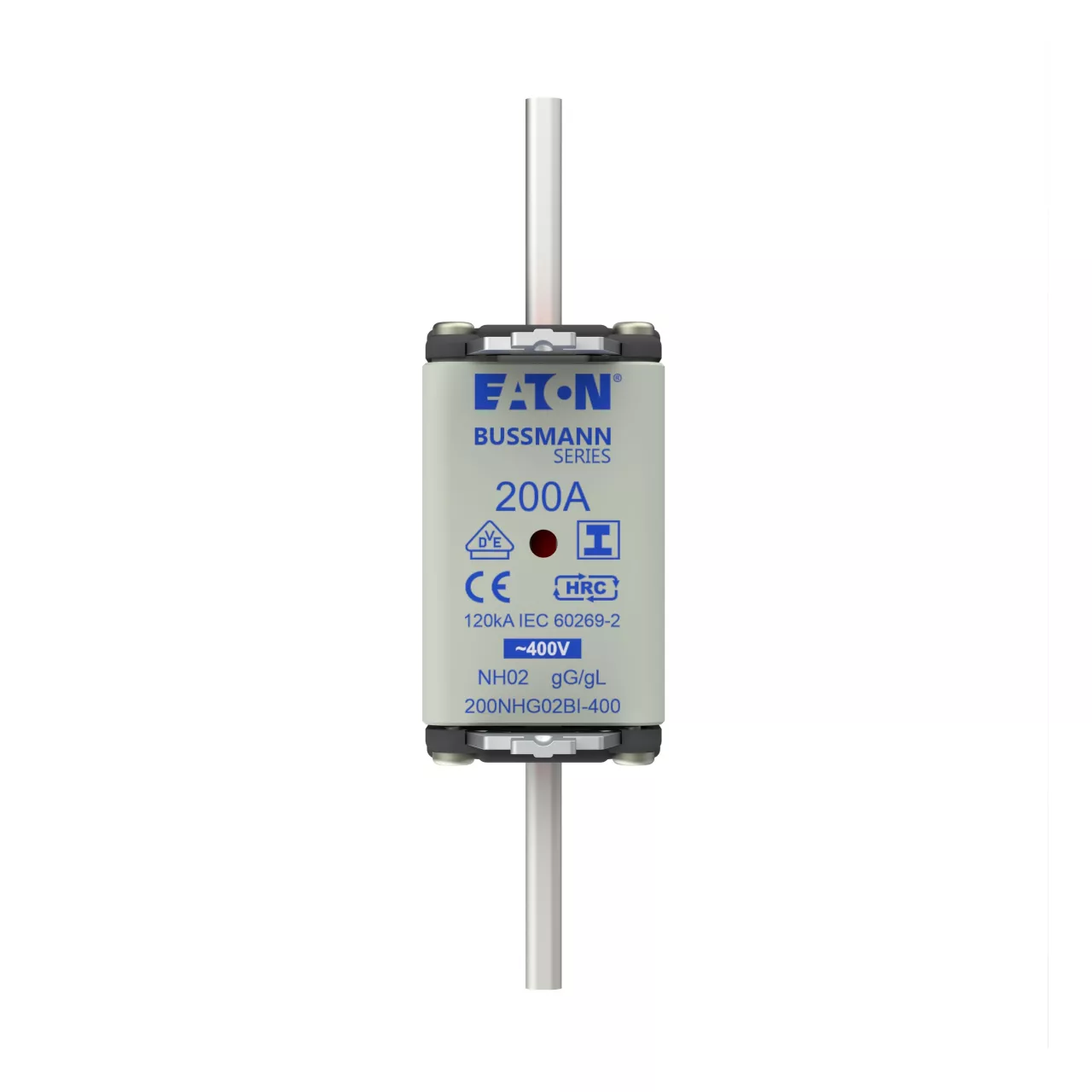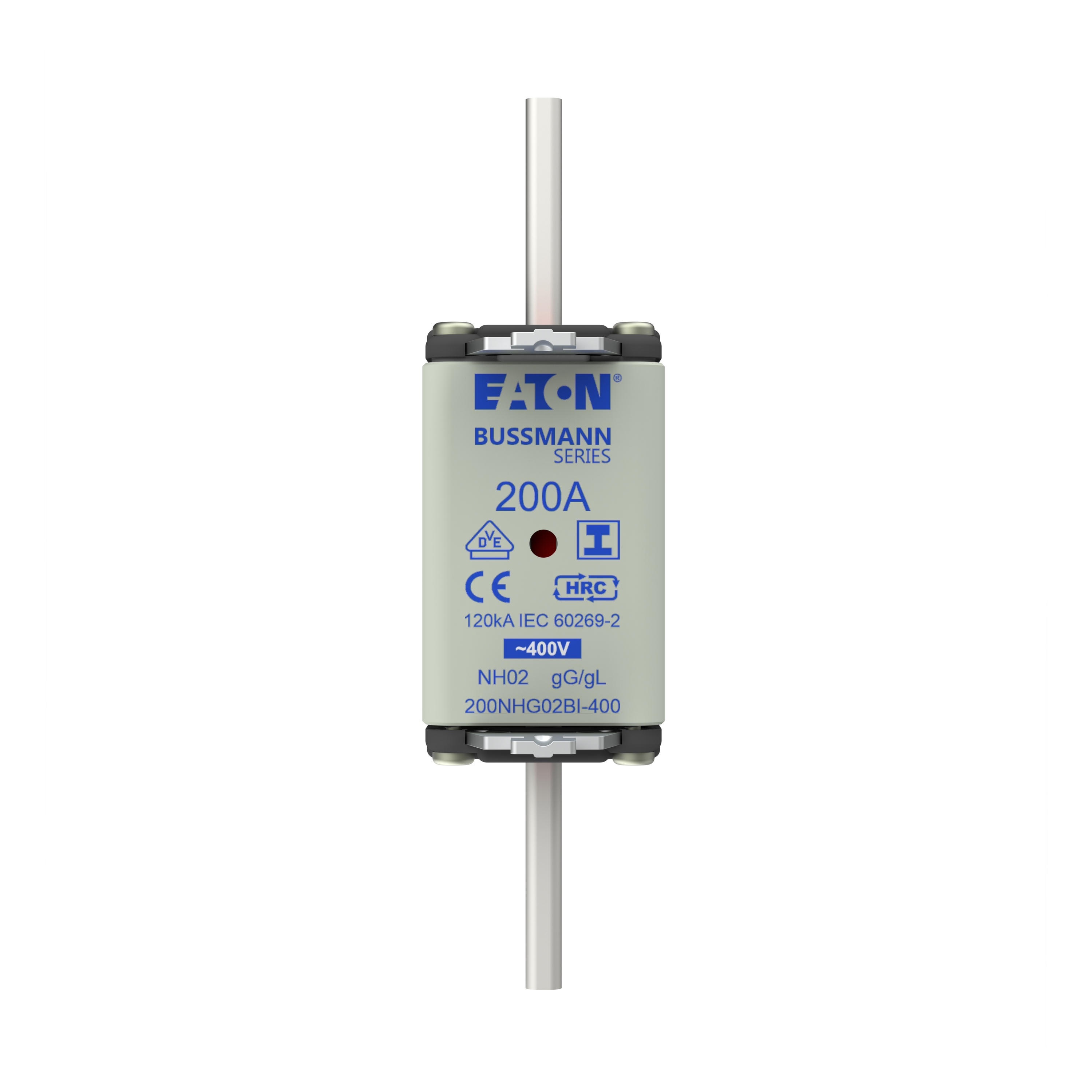 zekering, zekeringelement, Lage spanning, 200 A, AC 400 V, NH02, gL/gG, IEC, dubbel (combinatie-) meldersysteem, vierkant huis met mescontacten, geïsoleerde grepen, IEC 60269-2 zekeringsysteem A, DIN 43620, VDE 0636-2. Uitschakelvermogen 120 kA