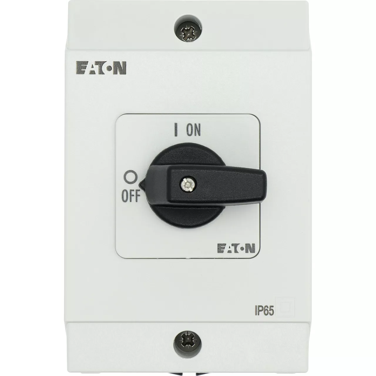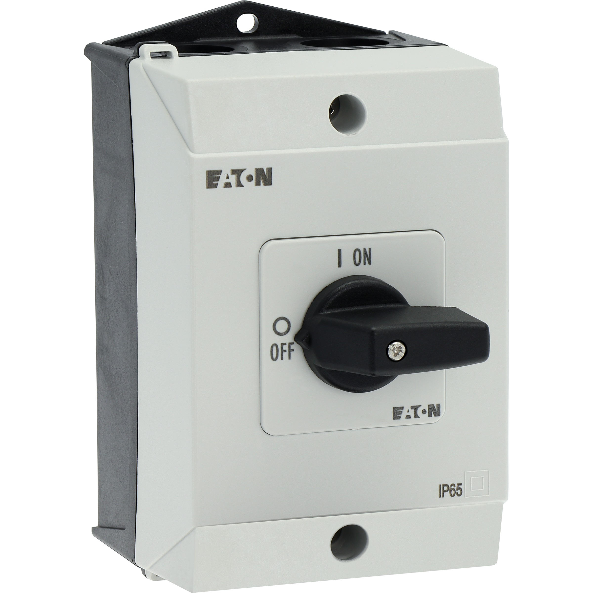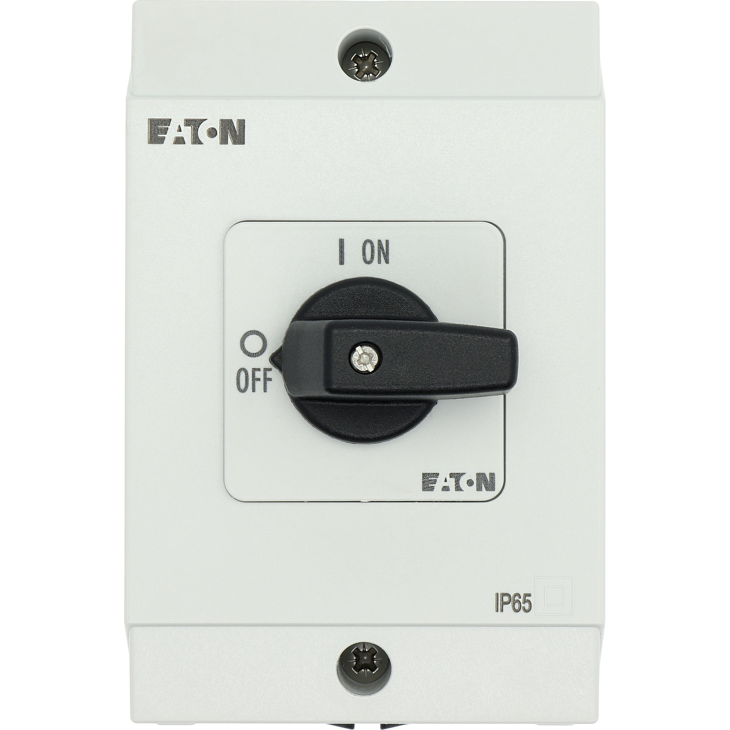 Przełącznik wł.-wył., Zacisk śrubowy: Przełącznik wł.-wył., Odniesienie grupy części T0, z czarnym pokrętłem z tabliczką czołową, 3-biegunowy + N, Stopień ochrony: IP65, Projekt: montaż powierzchniowy, Kąt przełączania: 90°, Przebieg łączenia: bez samopowrotu, tabliczka czołowa: 0-1, Moc znamionowa AC-23A, 50 - 60 Hz 400 V: P = 5,5 kW, Znamionowy prąd ciągły: Iu = 20 A, 2 zespoł montażowy, Normy: IEC/EN 60947, VDE 0660, IEC/EN 60204, Rozłącznik izolacyjny zgodnie z normą IEC/EN 60947-3