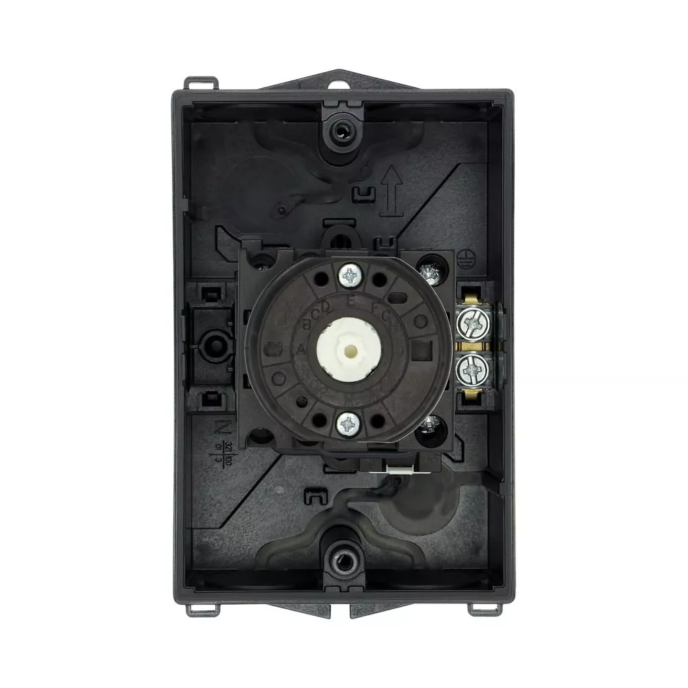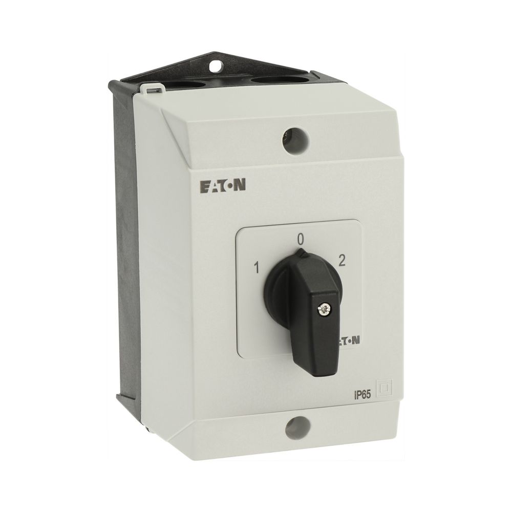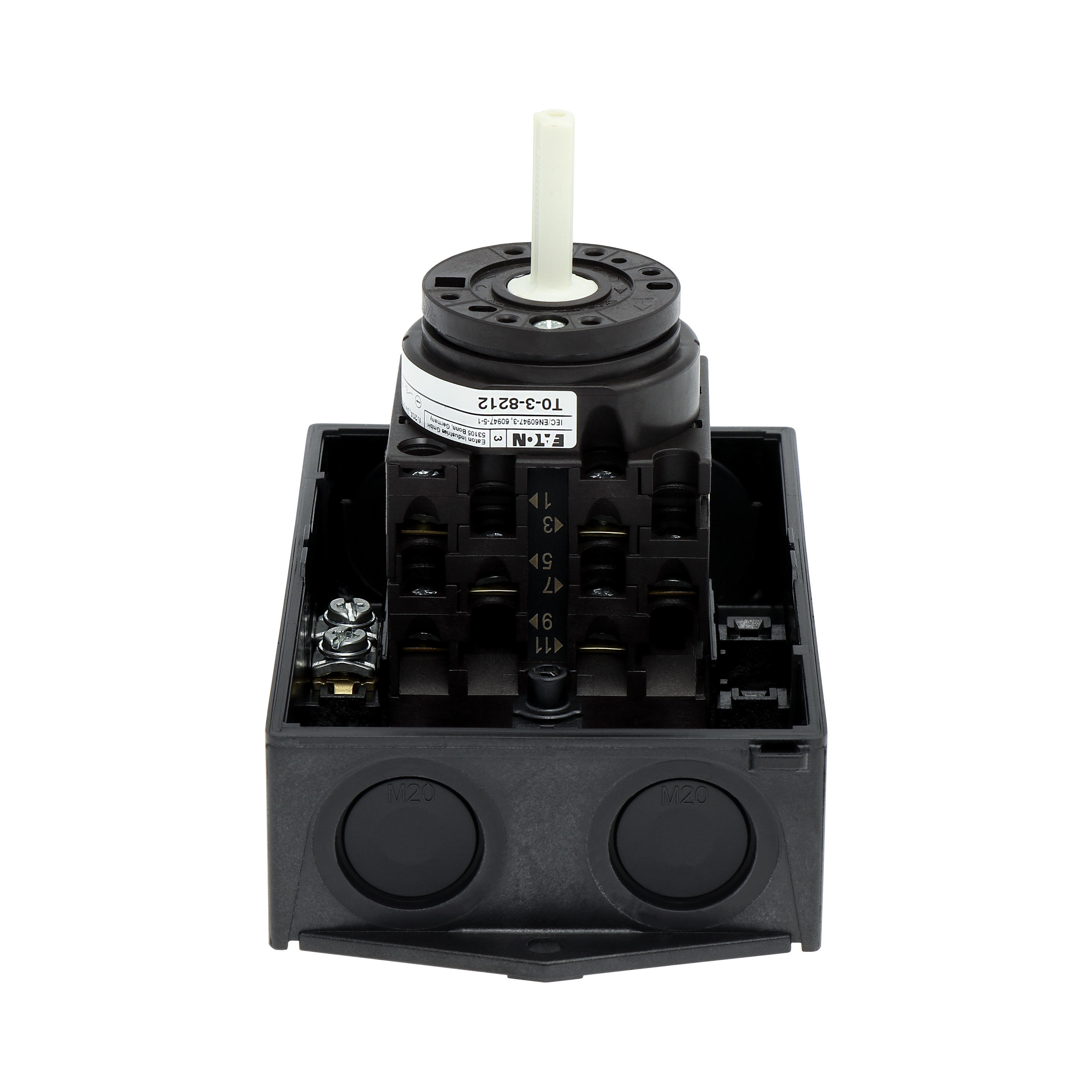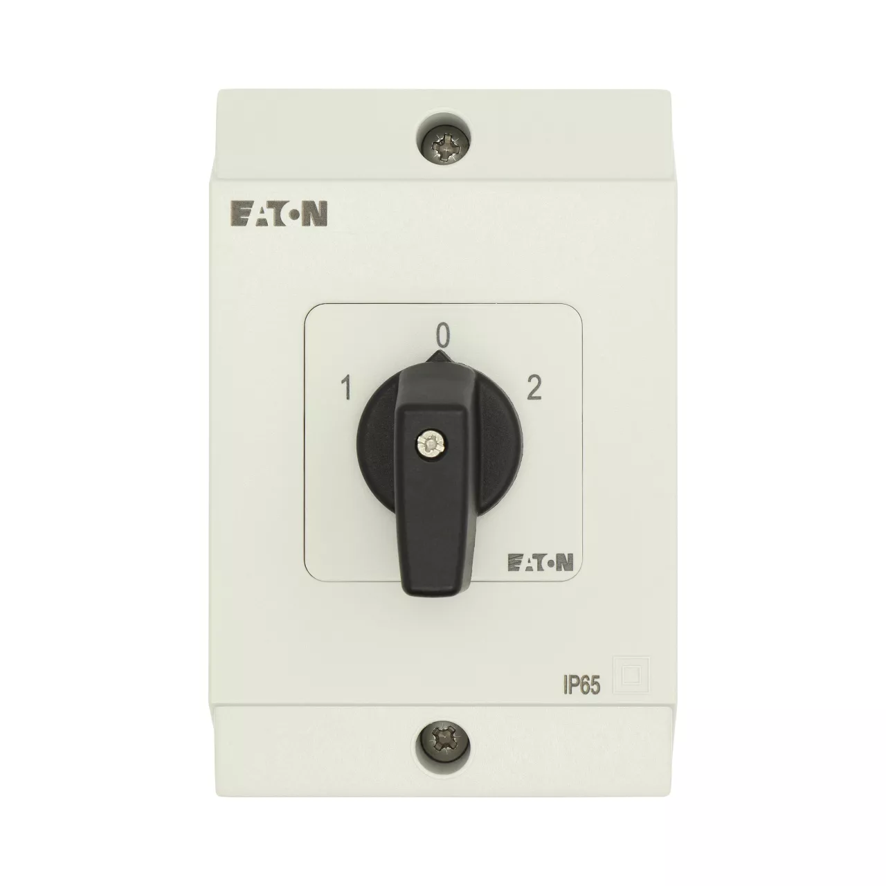 T0-3-8212/I1 Przełącznik zasilania, Styki: 6, 20 A, tabliczka: 1-0-2, 60 °, bez samopowrotu, w obudowie IP65, pokrętło czarne bez możliwości blokady