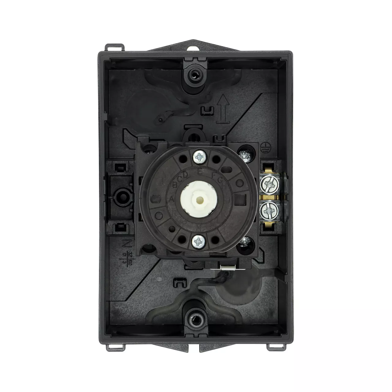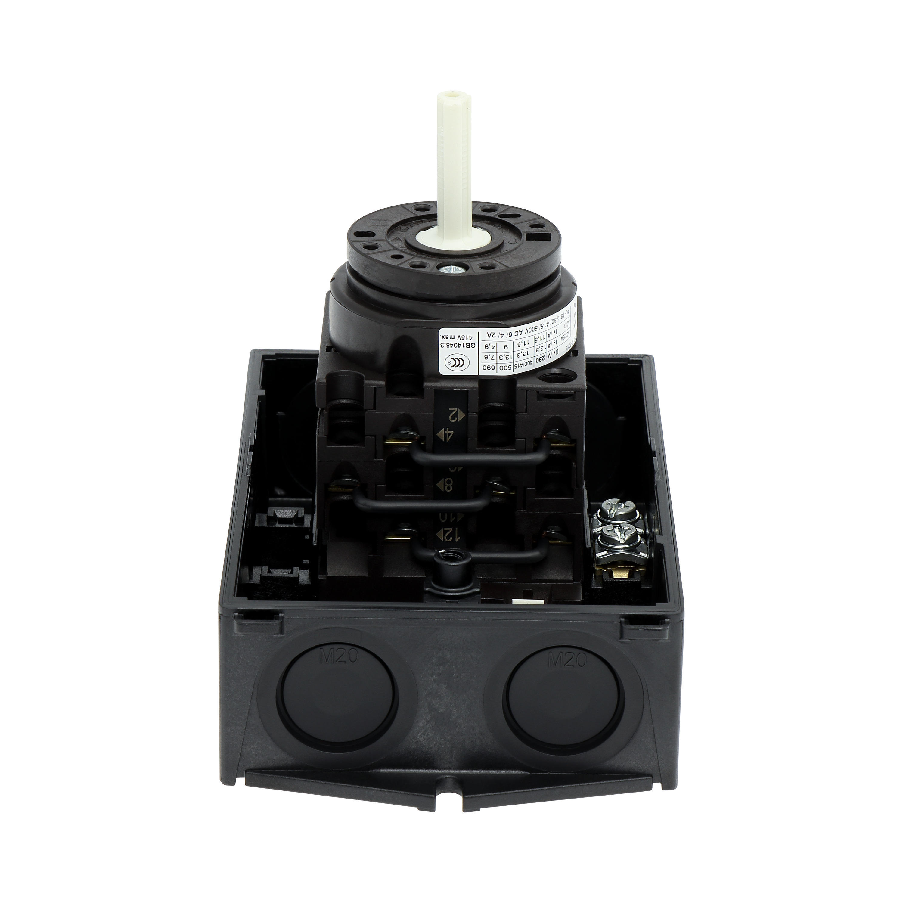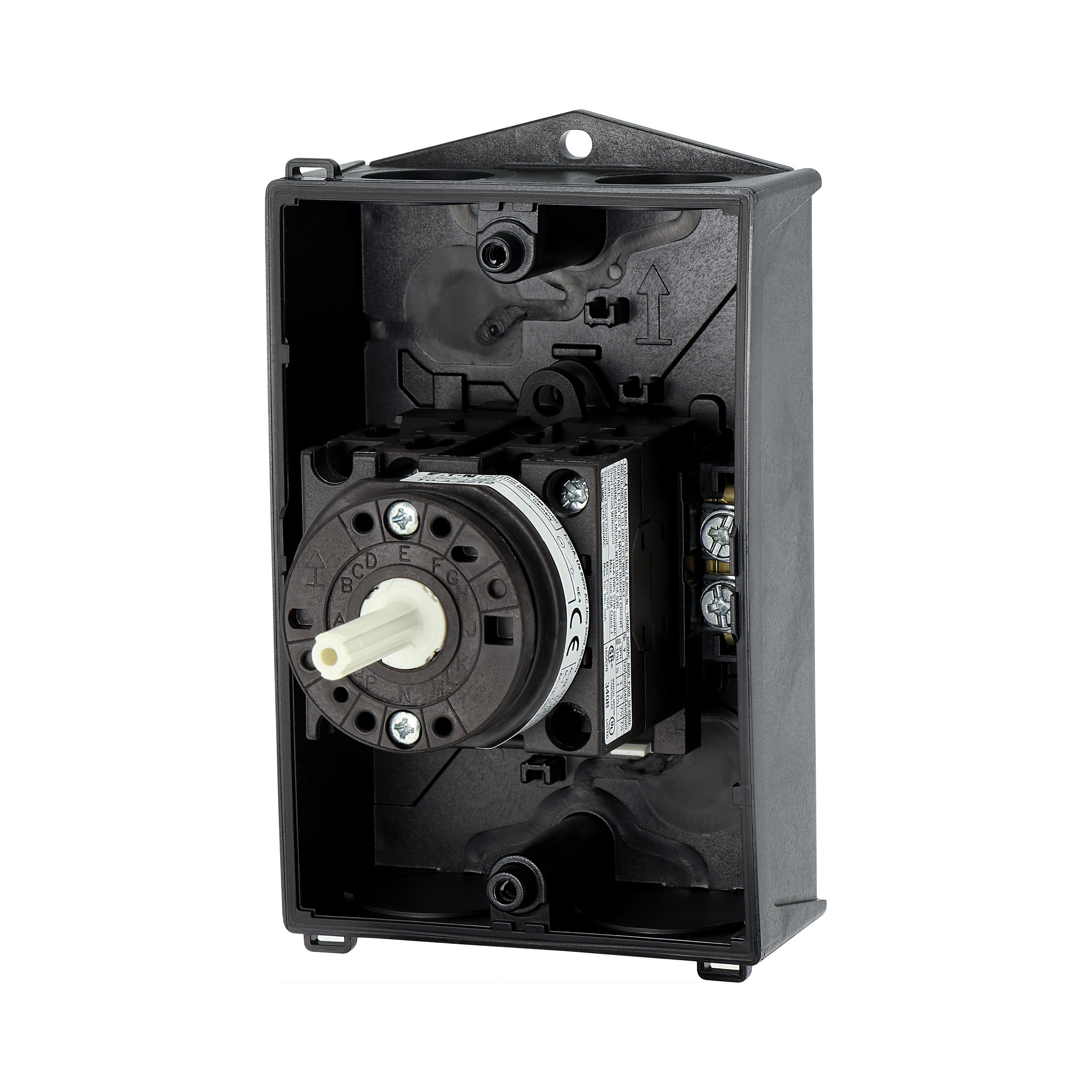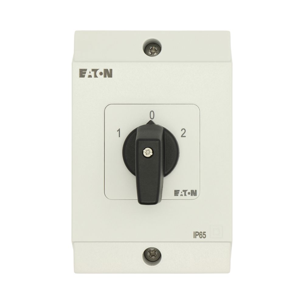 Przełącznik, Zacisk śrubowy: Łączniki sterownicze, Odniesienie grupy części T0, z czarnym pokrętłem z tabliczką czołową, Zestyki: 6, Stopień ochrony: IP65, Projekt: montaż powierzchniowy, Kąt przełączania: 60°, Przebieg łączenia: bez samopowrotu, Z pozycją 0 (wył.), tabliczka czołowa: 1-0-2, Moc znamionowa AC-23A, 50 - 60 Hz 400 V: P = 5,5 kW, Znamionowy prąd ciągły: Iu = 20 A, 3 zespoł montażowy, Normy: IEC/EN 60947, VDE 0660, IEC/EN 60204, Rozłącznik izolacyjny zgodnie z normą IEC/EN 60947-3