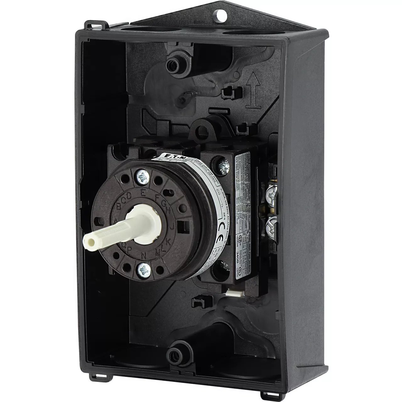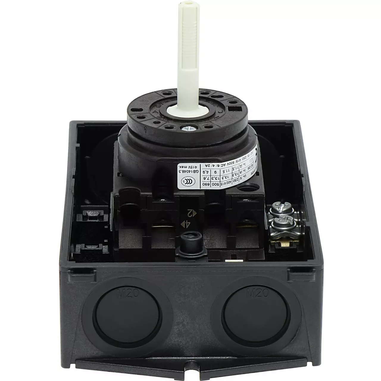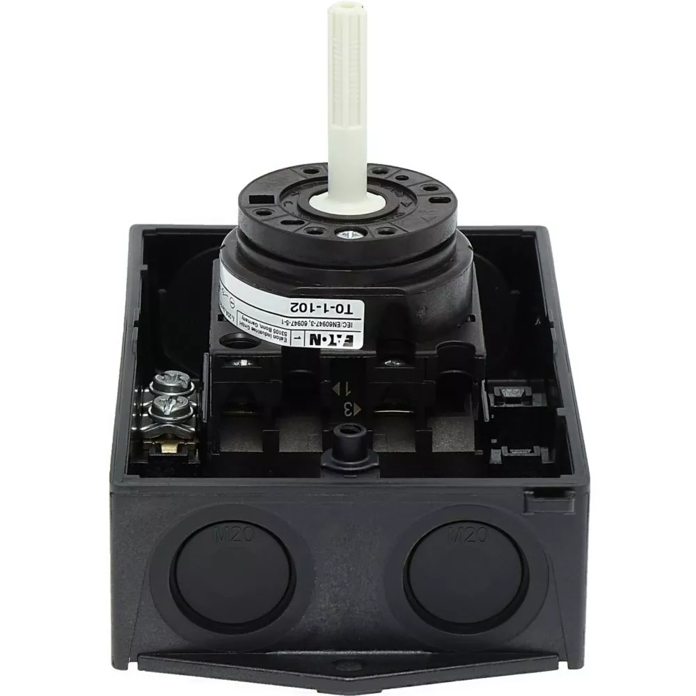 Wyłącznik główny, Zacisk śrubowy: Wyłącznik główny, wyłącznik serwisowy, Wyłącznik naprawczy, Odniesienie grupy części T0, Funkcja zatrzymania: Funkcja wyłączania awaryjnego, z czerwonym uchwytem obrotowym i żółtym pierścieniem blokującym, 2-biegunowy, Element blokujący: Możliwość zablokowania w położeniu 0 (Wył.), Stopień ochrony: IP65, Projekt: montaż powierzchniowy, Kąt przełączania: 90°, Moc znamionowa AC-23A, 50 - 60 Hz 400 V: P = 5,5 kW, Znamionowy prąd ciągły: Iu = 20 A, 1 zespoł montażowy, Normy: IEC/EN 60947, VDE 0660, IEC/EN 60204, Rozłącznik izolacyjny zgodnie z normą IEC/EN 60947-3