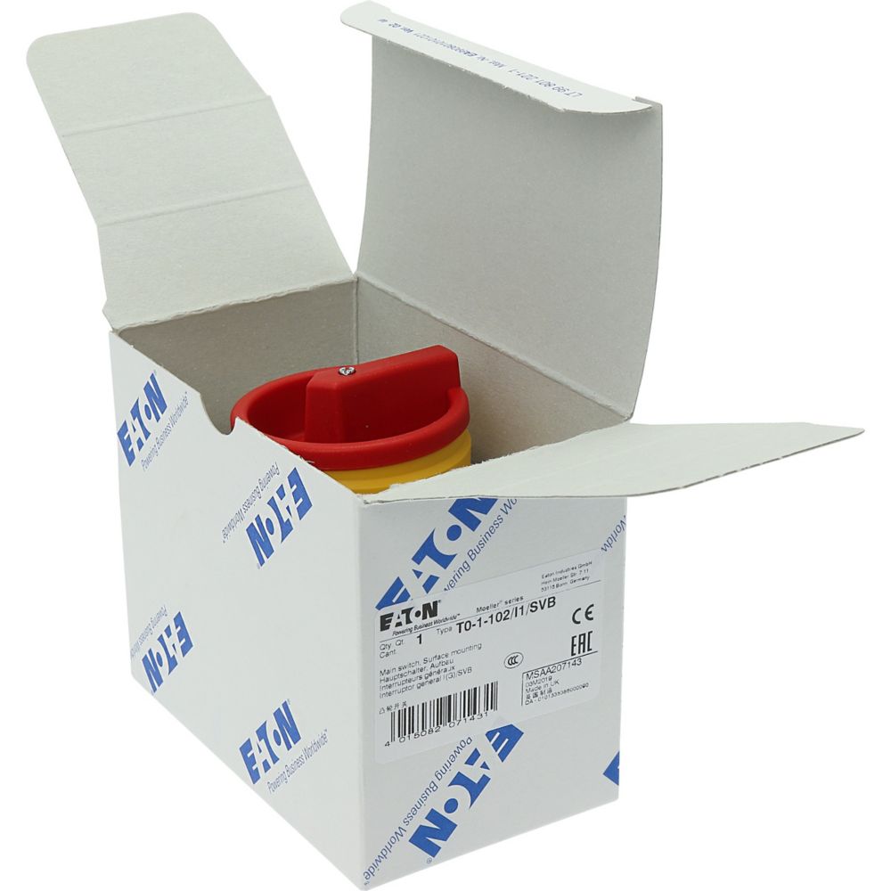 T0-1-102/I1/SVB Przełącznik Zał.-Wył., 2 bieg., 20 A, 90 °, w obudowie IP65, pokrętło czerwono-żółte z blokadą na kłódkę