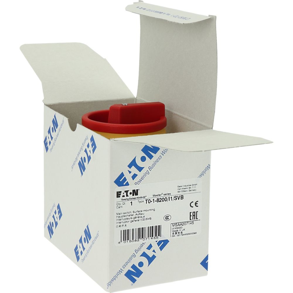 T0-1-8200/I1/SVB Przełącznik Zał.-Wył., 1 bieg., 20 A, 90 °, w obudowie IP65, pokrętło czerwono-żółte z blokadą na kłódkę