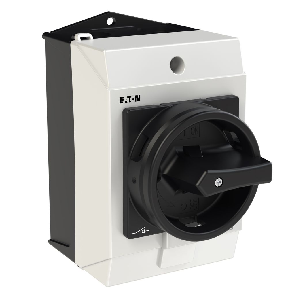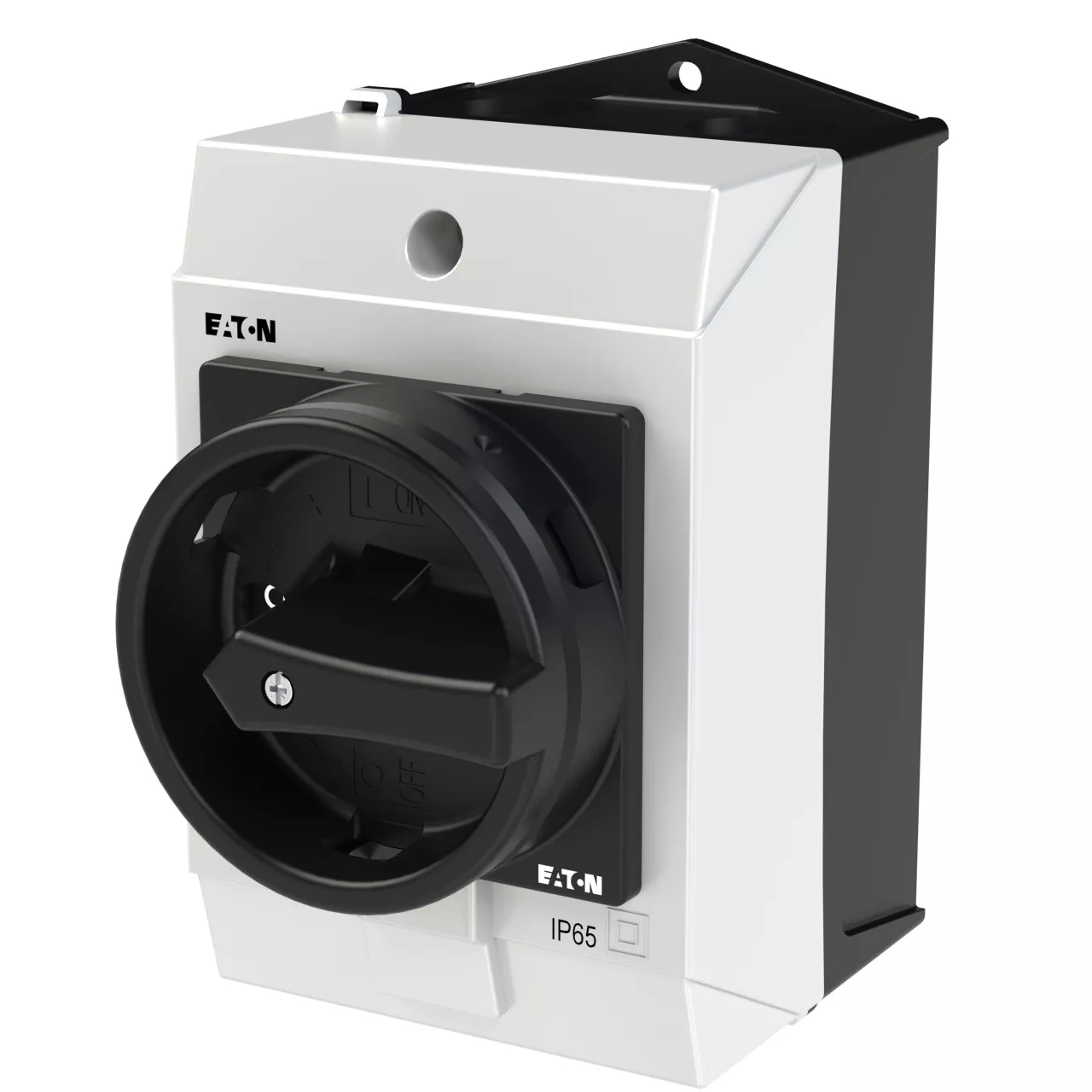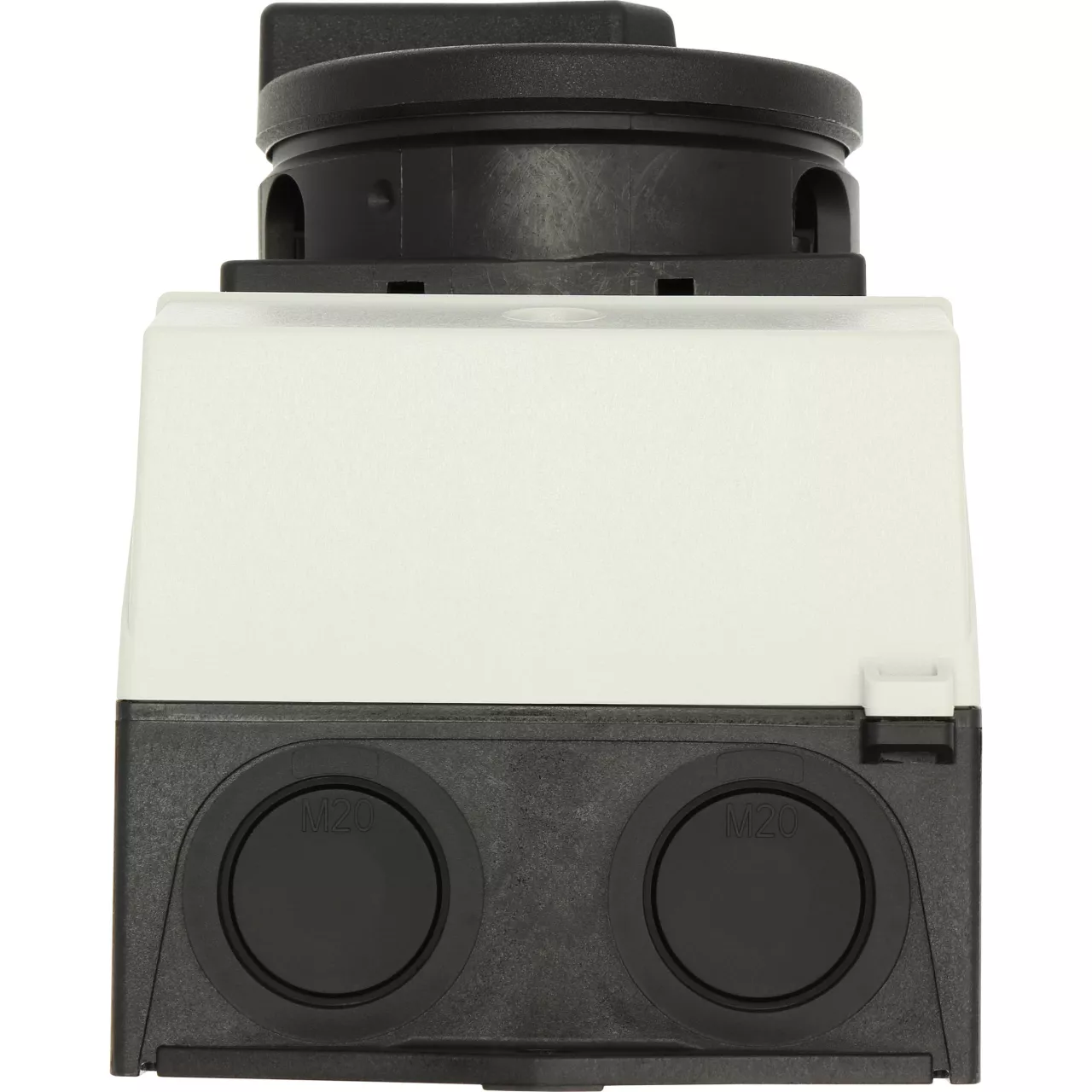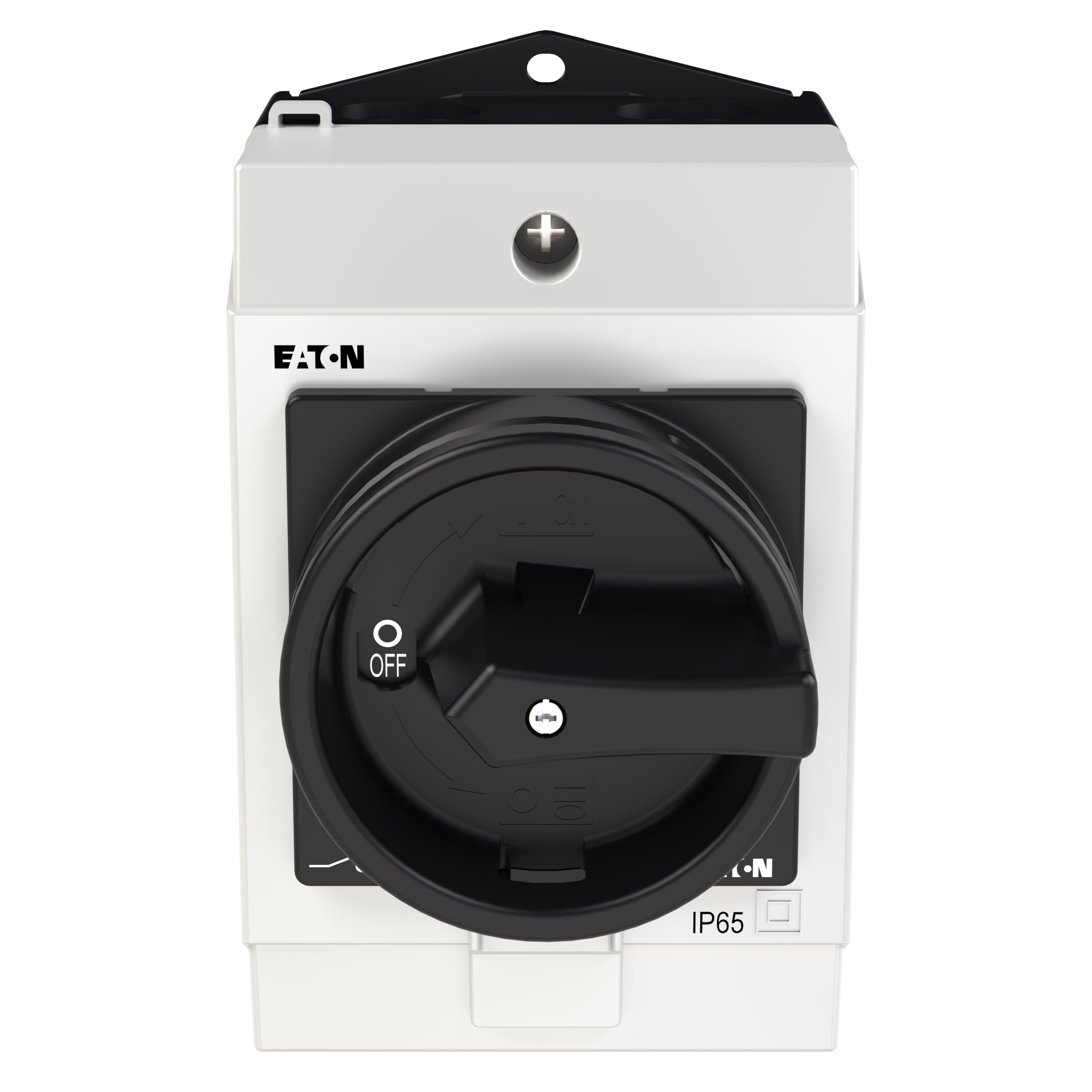 Wyłącznik główny, Zacisk śrubowy: Wyłącznik główny, wyłącznik serwisowy, Wyłącznik naprawczy, Odniesienie grupy części T0, Funkcja zatrzymania: Funkcja STOP, Z czarnym uchwytem obrotowym i pierścieniem blokującym, 3-biegunowy, Element blokujący: Możliwość zablokowania w położeniu 0 (Wył.), Stopień ochrony: IP65, Projekt: montaż powierzchniowy, Kąt przełączania: 90°, Moc znamionowa AC-23A, 50 - 60 Hz 400 V: P = 5,5 kW, Znamionowy prąd ciągły: Iu = 20 A, 2 zespoł montażowy, Normy: IEC/EN 60947, VDE 0660, IEC/EN 60204, Rozłącznik izolacyjny zgodnie z normą IEC/EN 60947-3