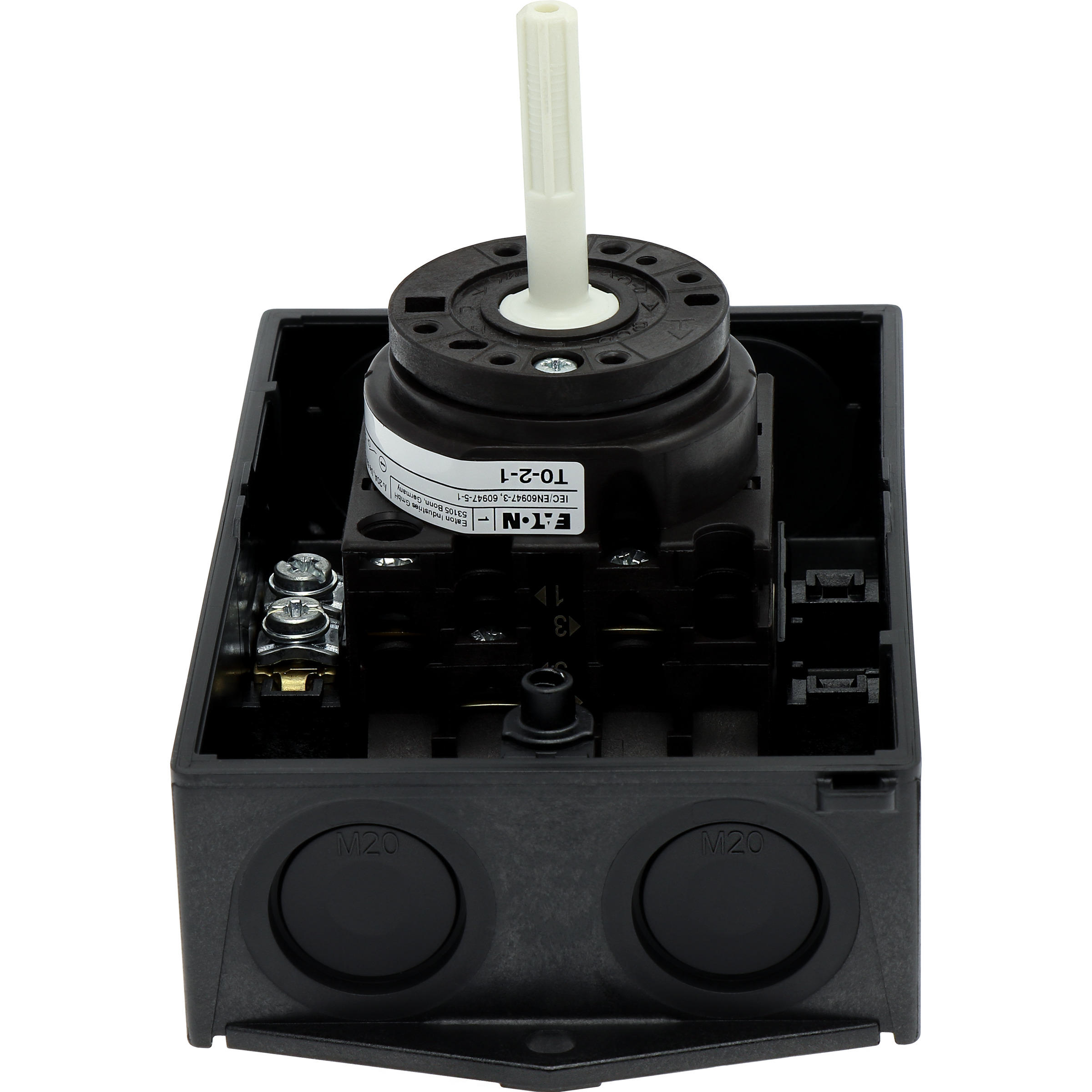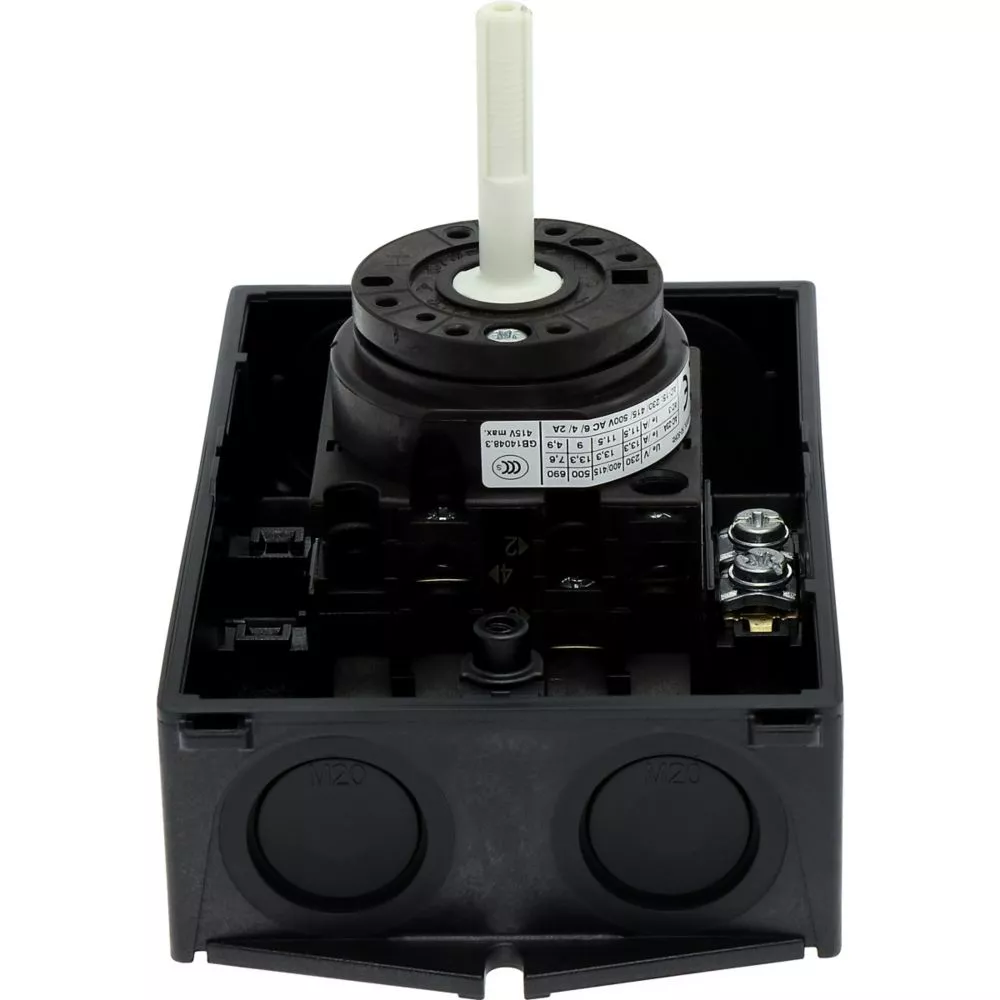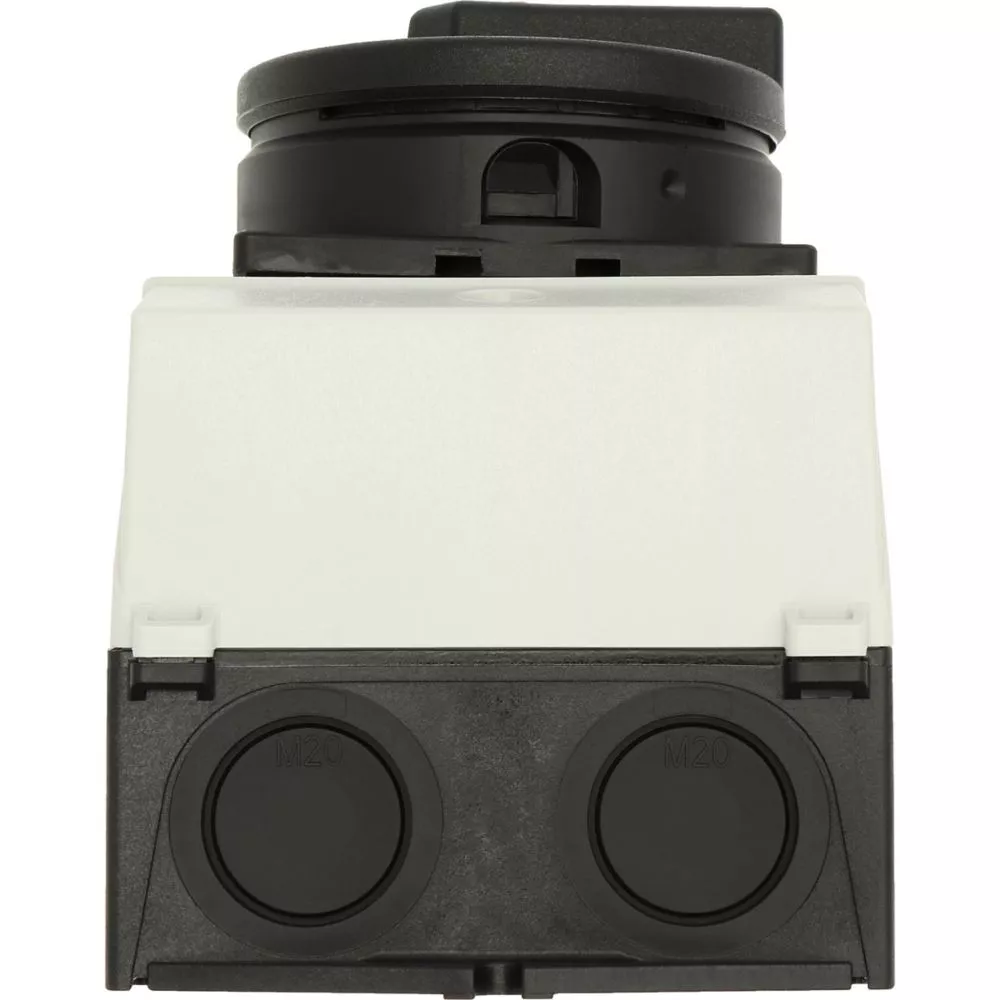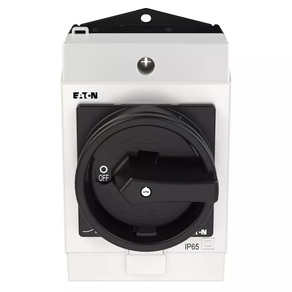 Wyłącznik główny, Zacisk śrubowy: Wyłącznik główny, wyłącznik serwisowy, Wyłącznik naprawczy, Odniesienie grupy części T0, Funkcja zatrzymania: Funkcja STOP, Z czarnym uchwytem obrotowym i pierścieniem blokującym, 3-biegunowy, Element blokujący: Możliwość zablokowania w położeniu 0 (Wył.), Stopień ochrony: IP65, Projekt: montaż powierzchniowy, Kąt przełączania: 90°, Moc znamionowa AC-23A, 50 - 60 Hz 400 V: P = 5,5 kW, Znamionowy prąd ciągły: Iu = 20 A, 2 zespoł montażowy, Normy: IEC/EN 60947, VDE 0660, IEC/EN 60204, Rozłącznik izolacyjny zgodnie z normą IEC/EN 60947-3