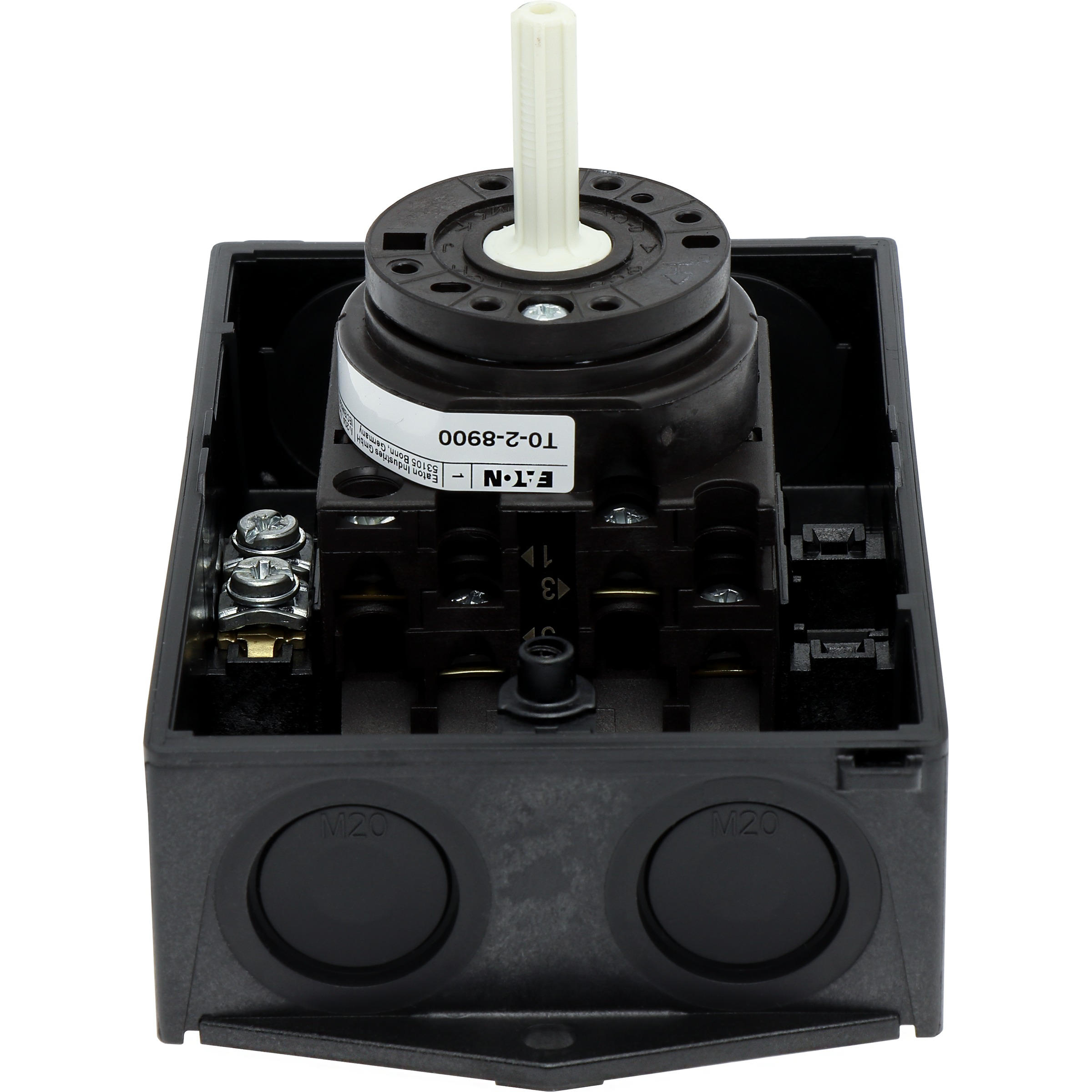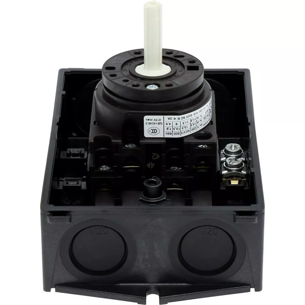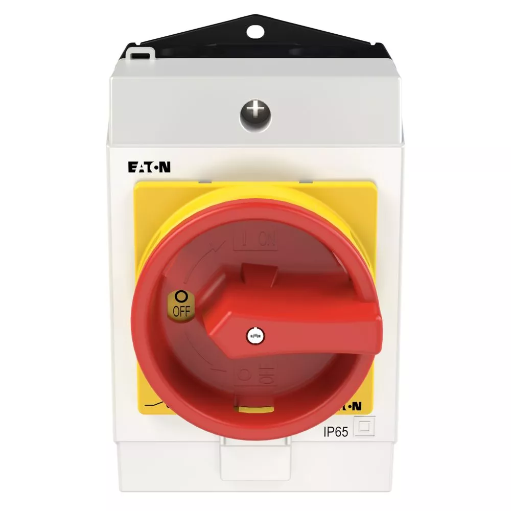 Hoofdschakelaar, Assortiment: hoofdschakelaar, onderhoudsschakelaar, Werkschakelaar, Familie type: T0, Stopfunctie: nooduitfunctie, Met rode draaigreep en gele borgring, 3-polig, Vergrendelingsmogelijkheid: Vergrendelbaar in de stand 0 (Uit), Beschermingsgraad: IP65, Uitvoering: opbouwmontage, Schakelhoek: 90 °, Motorvermogen AC-23A, 50 - 60 Hz 400 V: P = 5,5 kW, Nominale ononderbroken stroom: Iu = 20 A, 2 schakelkamer(s), Normen en bepalingen: IEC/EN 60947, VDE 0660, IEC/EN 60204, Lastscheider conform IEC/EN 60947-3