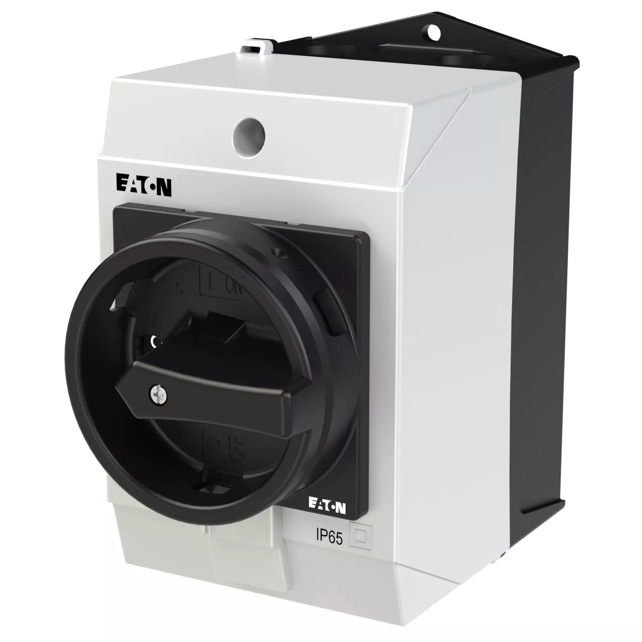 Wyłącznik główny, Zacisk śrubowy: Wyłącznik główny, wyłącznik serwisowy, Wyłącznik naprawczy, Odniesienie grupy części T0, Funkcja zatrzymania: Funkcja STOP, Z czarnym uchwytem obrotowym i pierścieniem blokującym, 6-biegunowy, Element blokujący: Możliwość zablokowania w położeniu 0 (Wył.), Stopień ochrony: IP65, Projekt: montaż powierzchniowy, Kąt przełączania: 90°, Moc znamionowa AC-23A, 50 - 60 Hz 400 V: P = 5,5 kW, Znamionowy prąd ciągły: Iu = 20 A, 4 zespoł montażowy, Normy: IEC/EN 60947, VDE 0660, IEC/EN 60204, Rozłącznik izolacyjny zgodnie z normą IEC/EN 60947-3