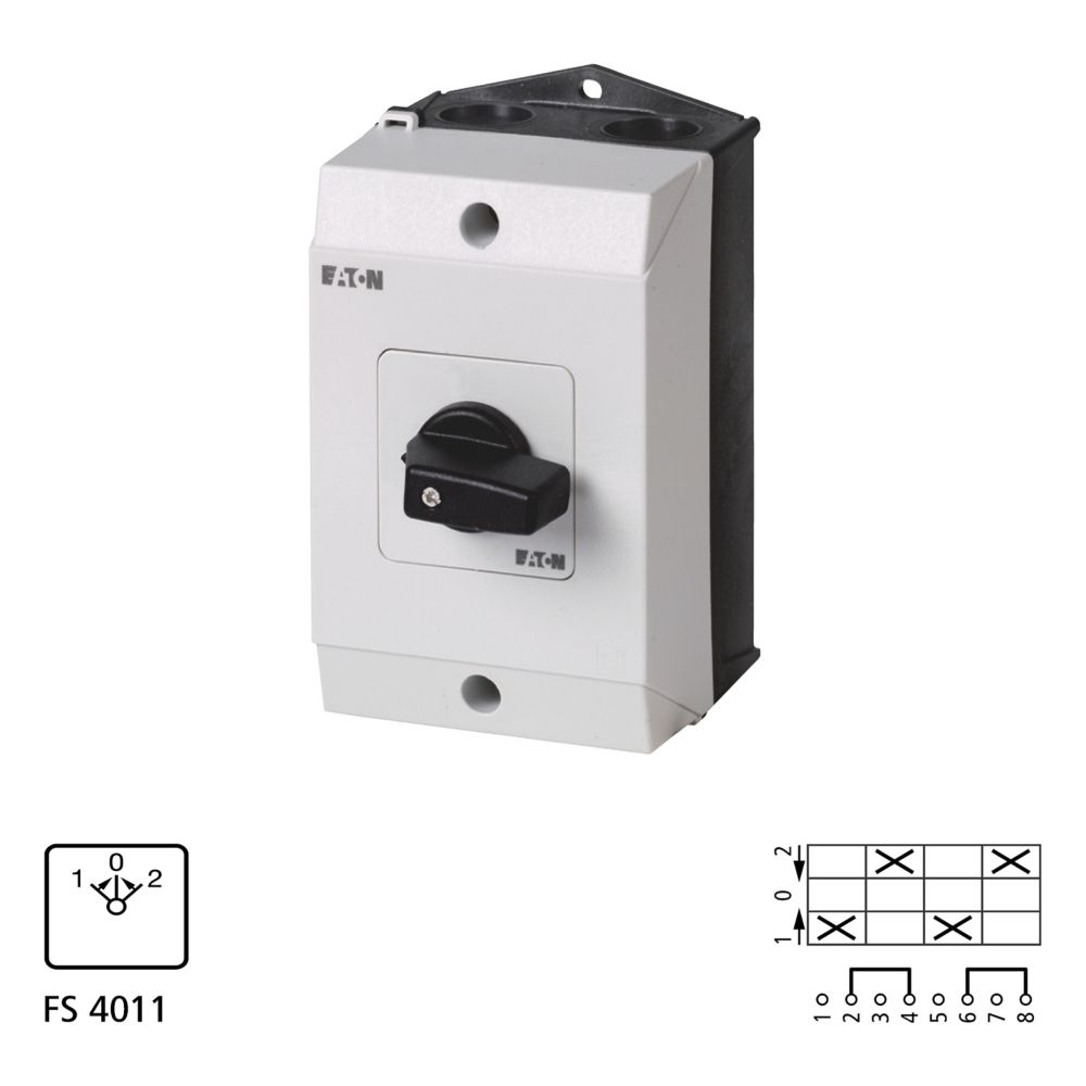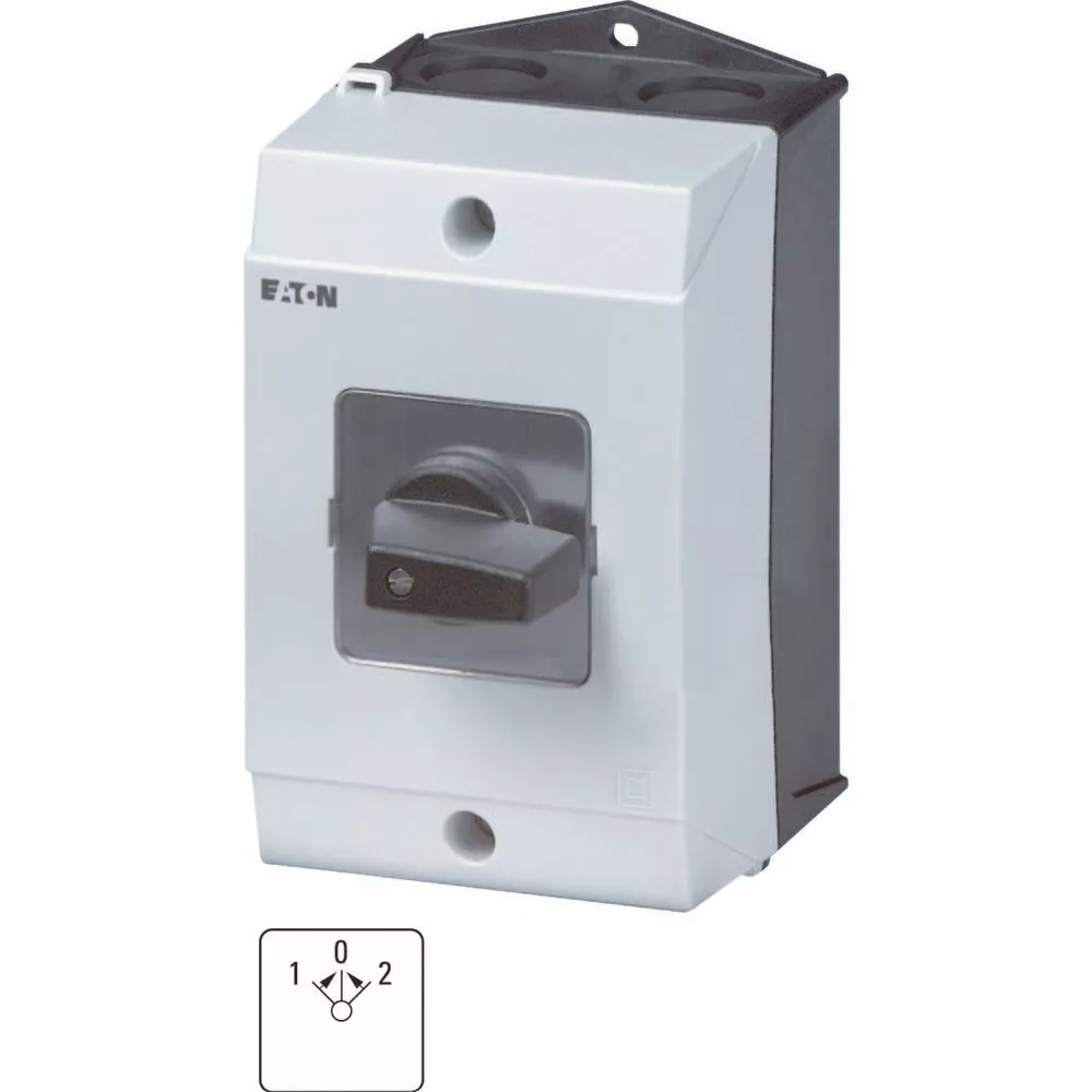 Przełącznik, Zacisk śrubowy: Łączniki sterownicze, Odniesienie grupy części T3, z czarnym pokrętłem z tabliczką czołową, Zestyki: 4, Stopień ochrony: IP65, Projekt: montaż powierzchniowy, Kąt przełączania: 45°, Przebieg łączenia: z samopowrotem, Z pozycją 0 (wył.), z samopowrotem z obu kierunków do pozycji 0, tabliczka czołowa: 2>0<1, Moc znamionowa AC-23A, 50 - 60 Hz 400 V: P = 15 kW, Znamionowy prąd ciągły: Iu = 32 A, 2 zespoł montażowy, Normy: IEC/EN 60947, VDE 0660, IEC/EN 60204, CSA, UL, Rozłącznik izolacyjny zgodnie z normą IEC/EN 60947-3