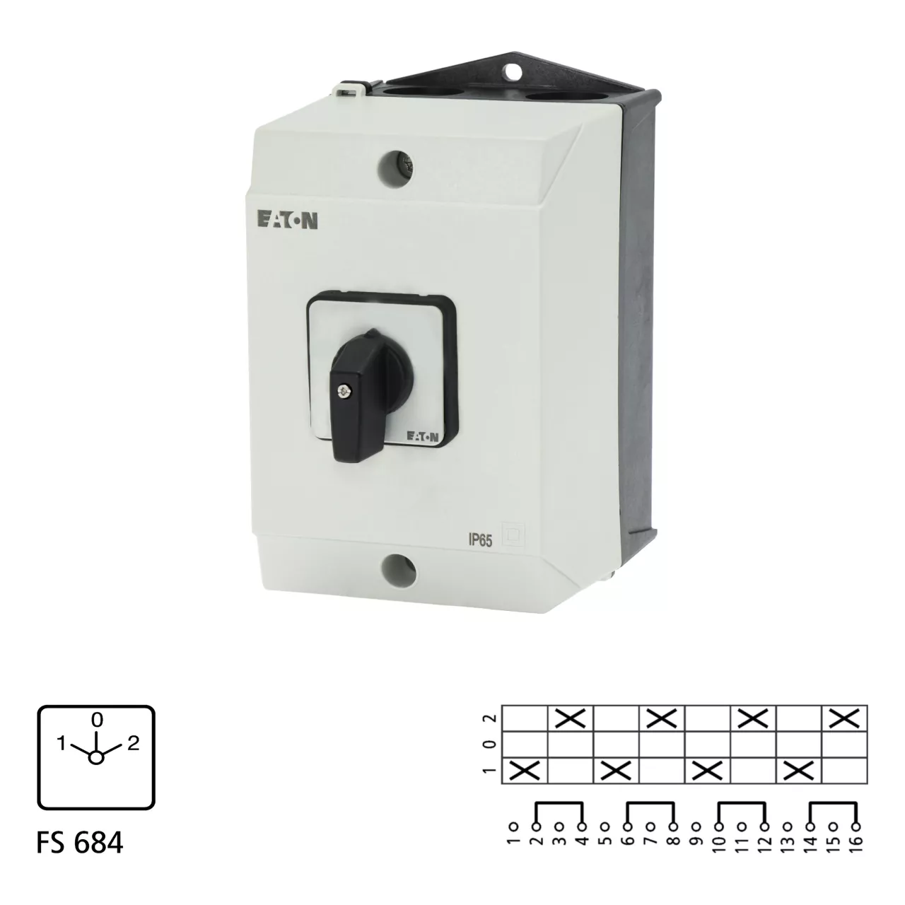 Przełącznik, Zacisk śrubowy: Łączniki sterownicze, Odniesienie grupy części T3, z czarnym pokrętłem z tabliczką czołową, Zestyki: 8, Stopień ochrony: IP65, Projekt: montaż powierzchniowy, Kąt przełączania: 60°, Przebieg łączenia: bez samopowrotu, Z pozycją 0 (wył.), tabliczka czołowa: 1-0-2, Moc znamionowa AC-23A, 50 - 60 Hz 400 V: P = 15 kW, Znamionowy prąd ciągły: Iu = 32 A, 4 zespoł montażowy, Normy: IEC/EN 60947, VDE 0660, IEC/EN 60204, CSA, UL, Rozłącznik izolacyjny zgodnie z normą IEC/EN 60947-3