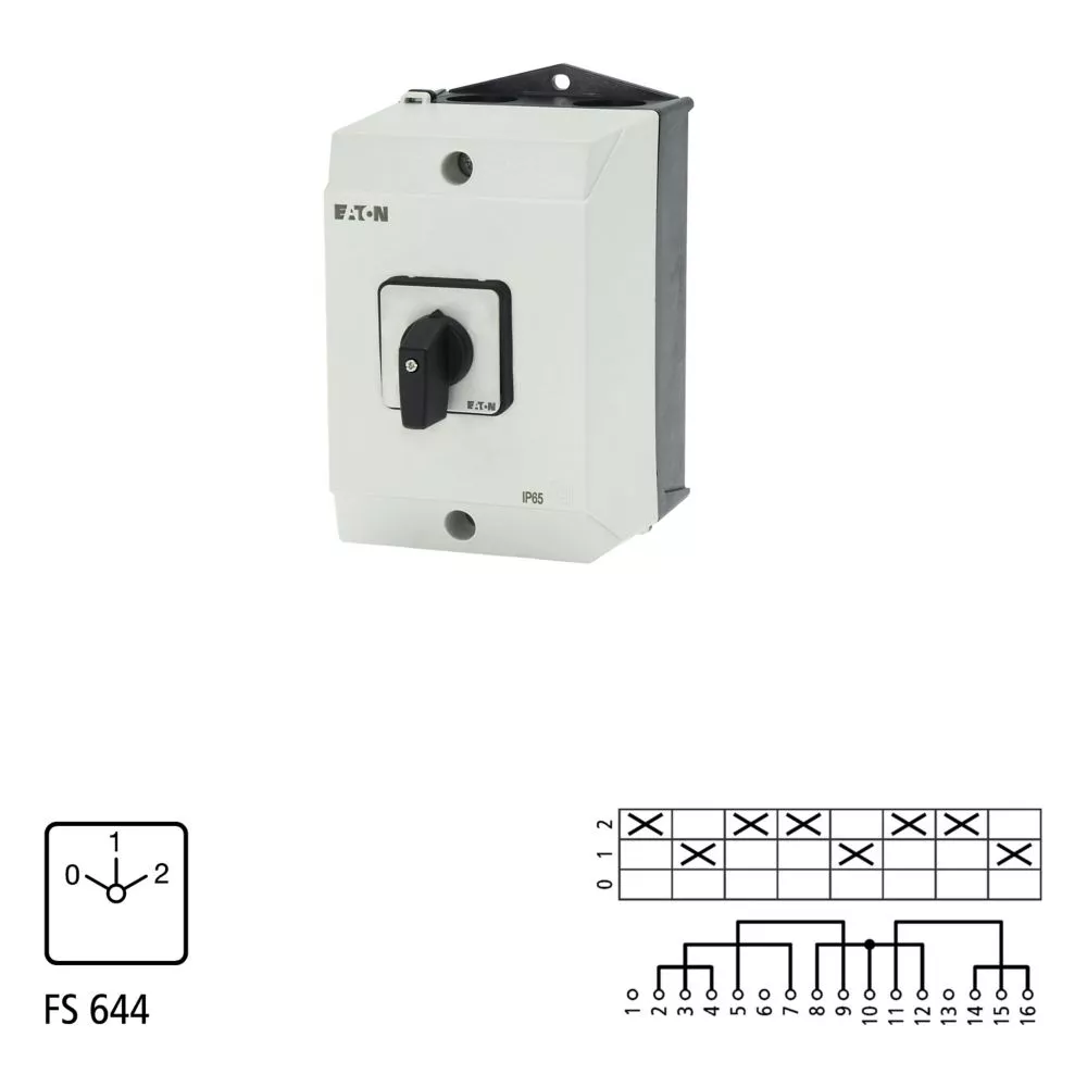 T3-4-8440/I2 Przełącznik liczby biegunów, Styki: 8, 32 A, układ Dahlandera, 2 prędkości, tabliczka: 0-1-2, 60 °, bez samopowrotu, w obudowie IP65, pokrętło czarne bez możliwości blokady