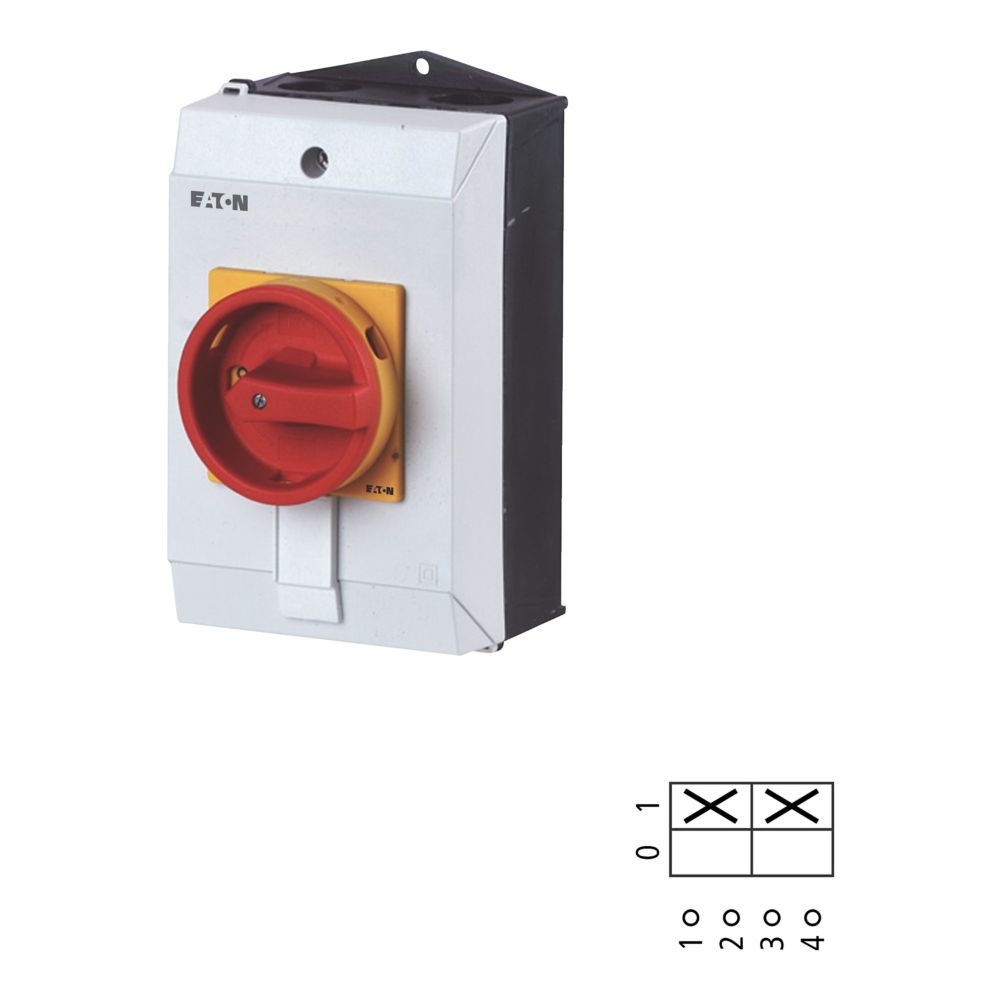 Wyłącznik główny, Zacisk śrubowy: Wyłącznik główny, wyłącznik serwisowy, Wyłącznik naprawczy, Odniesienie grupy części T3, Funkcja zatrzymania: Funkcja wyłączania awaryjnego, z czerwonym uchwytem obrotowym i żółtym pierścieniem blokującym, 2-biegunowy, Element blokujący: Możliwość zablokowania w położeniu 0 (Wył.), Stopień ochrony: IP65, Projekt: montaż powierzchniowy, Kąt przełączania: 90°, Moc znamionowa AC-23A, 50 - 60 Hz 400 V: P = 15 kW, Znamionowy prąd ciągły: Iu = 32 A, 1 zespoł montażowy, Normy: IEC/EN 60947, VDE 0660, IEC/EN 60204, Rozłącznik izolacyjny zgodnie z normą IEC/EN 60947-3