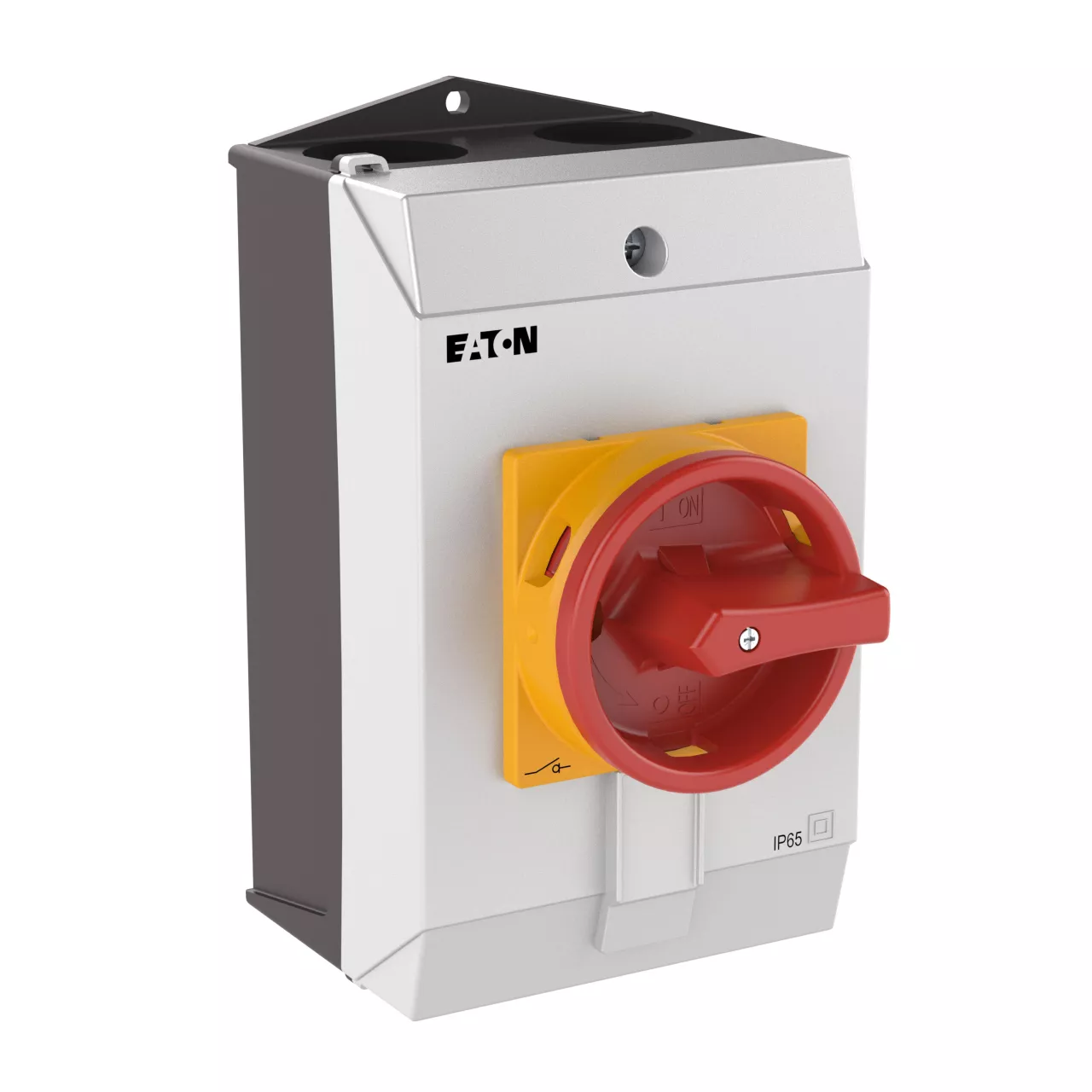 T3-1-102/I2/SVB Przełącznik Zał.-Wył., 2 bieg., 32 A, 90 °, w obudowie IP65, pokrętło czerwono-żółte z blokadą na kłódkę