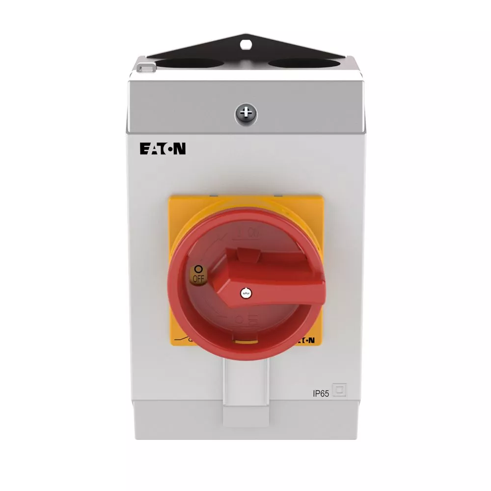 T3-1-8200/I2/SVB Przełącznik Zał.-Wył., Styki: 2, 32A, tabliczka: 0-1, 90°, bez samopowrotu, w obudowie IP65, pokrętło czerwono-żółte z blokadą na kłódkę