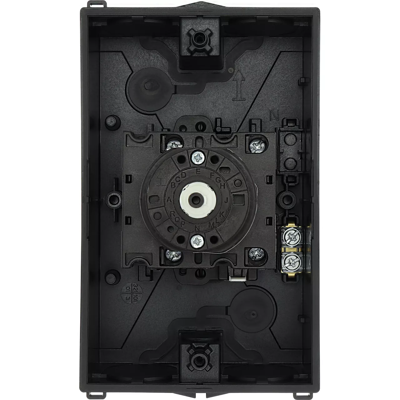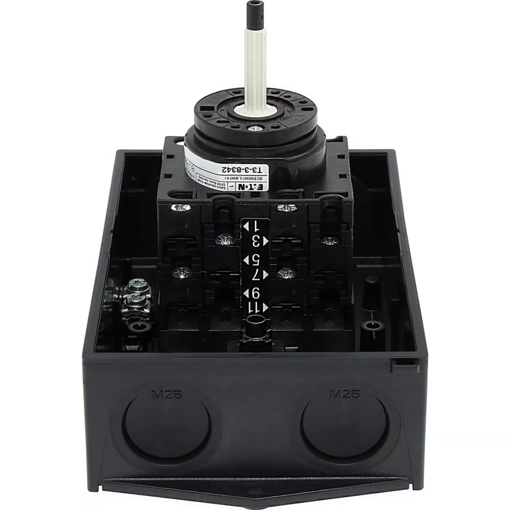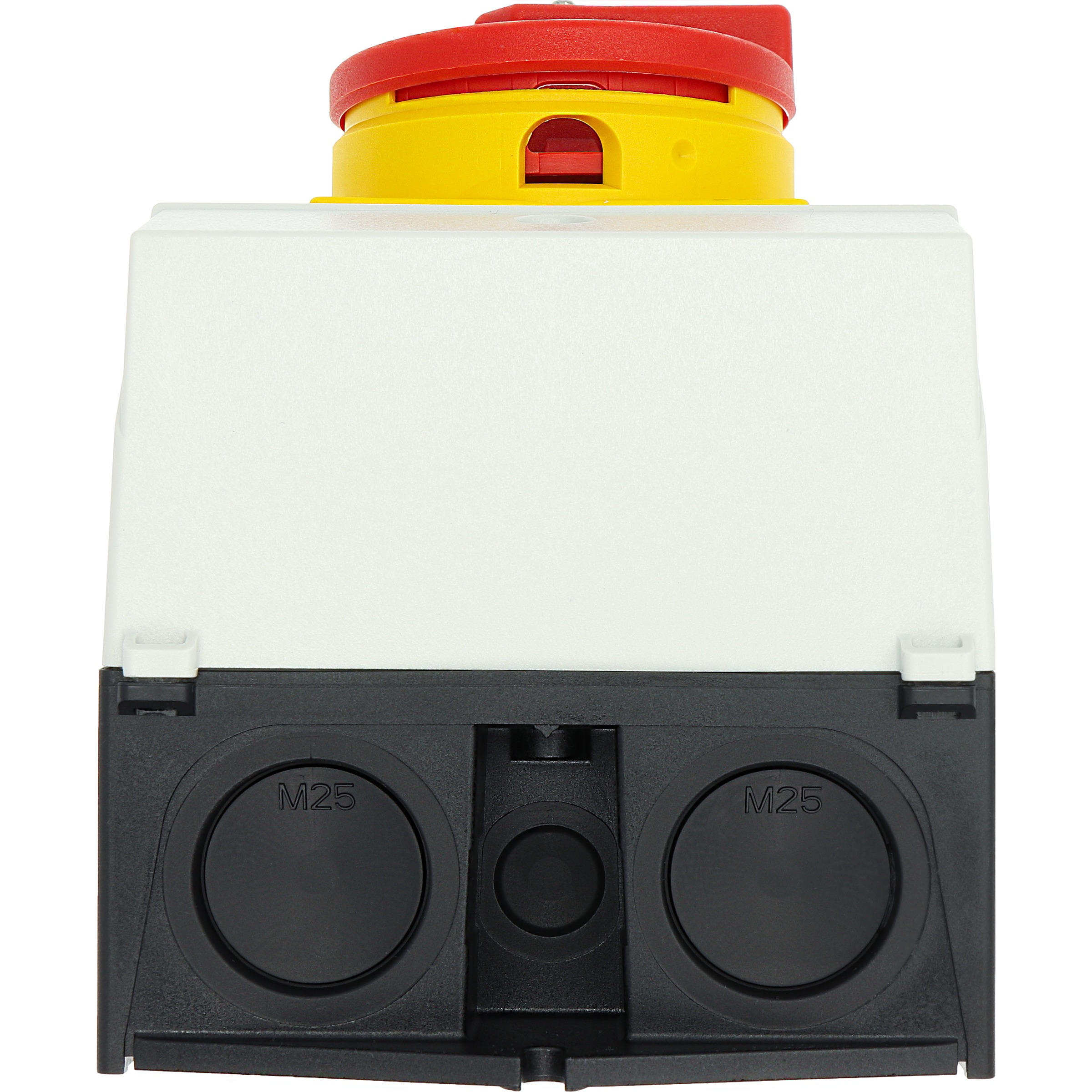 Wyłącznik główny, Zacisk śrubowy: Wyłącznik główny, wyłącznik serwisowy, Wyłącznik naprawczy, Odniesienie grupy części T3, Funkcja zatrzymania: Funkcja wyłączania awaryjnego, z czerwonym uchwytem obrotowym i żółtym pierścieniem blokującym, 6-biegunowy, Element blokujący: Możliwość zablokowania w położeniu 0 (Wył.), Stopień ochrony: IP65, Projekt: montaż powierzchniowy, Kąt przełączania: 90°, Moc znamionowa AC-23A, 50 - 60 Hz 400 V: P = 15 kW, Znamionowy prąd ciągły: Iu = 32 A, 3 zespoł montażowy, Normy: IEC/EN 60947, VDE 0660, IEC/EN 60204, Rozłącznik izolacyjny zgodnie z normą IEC/EN 60947-3