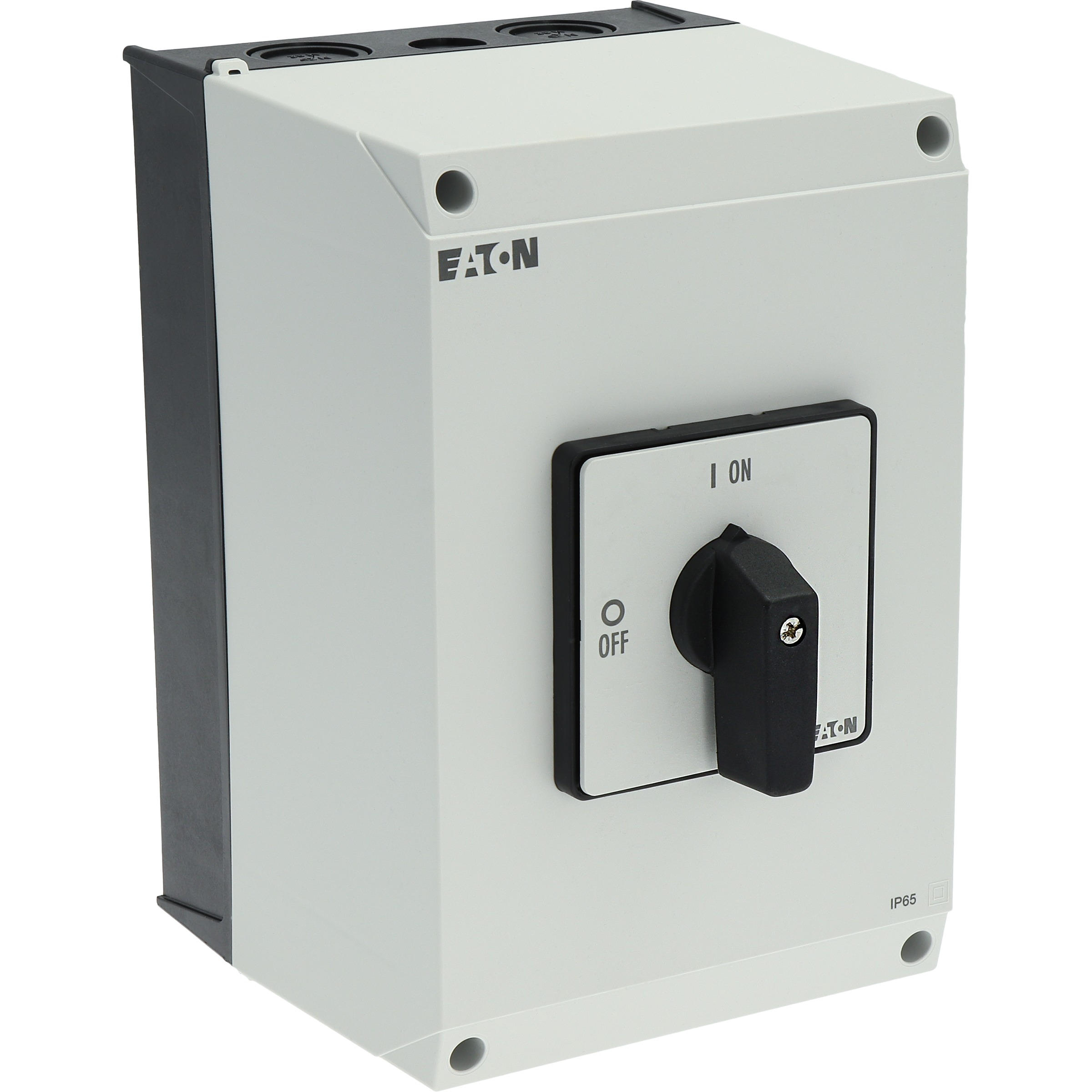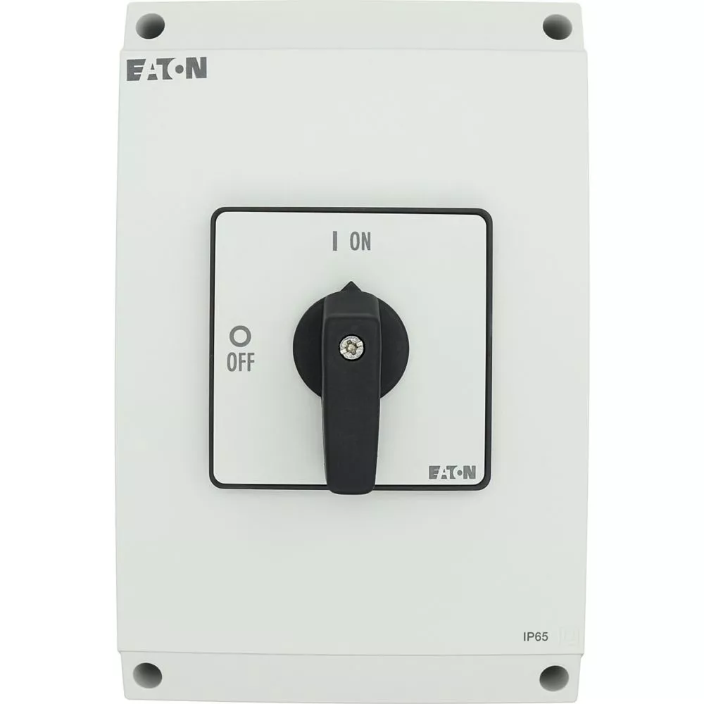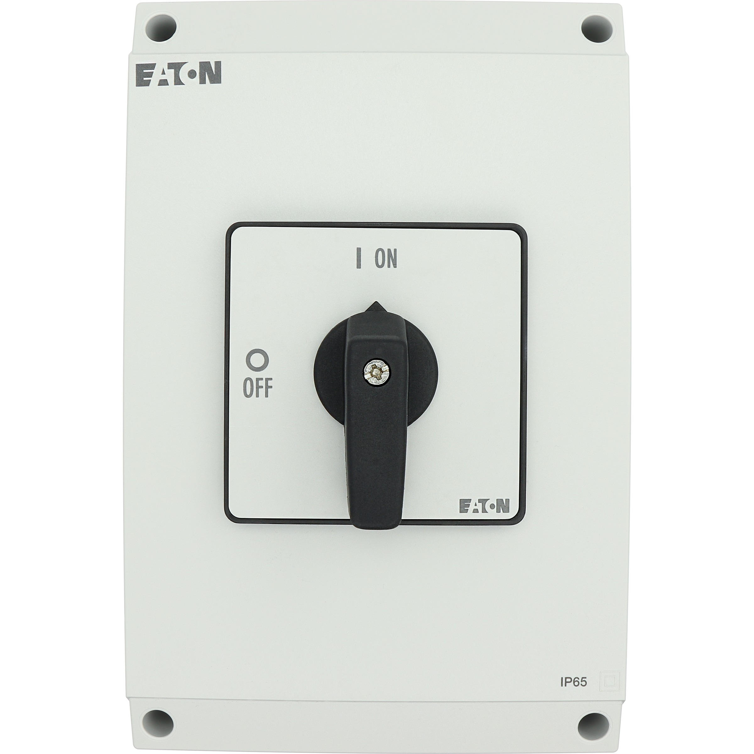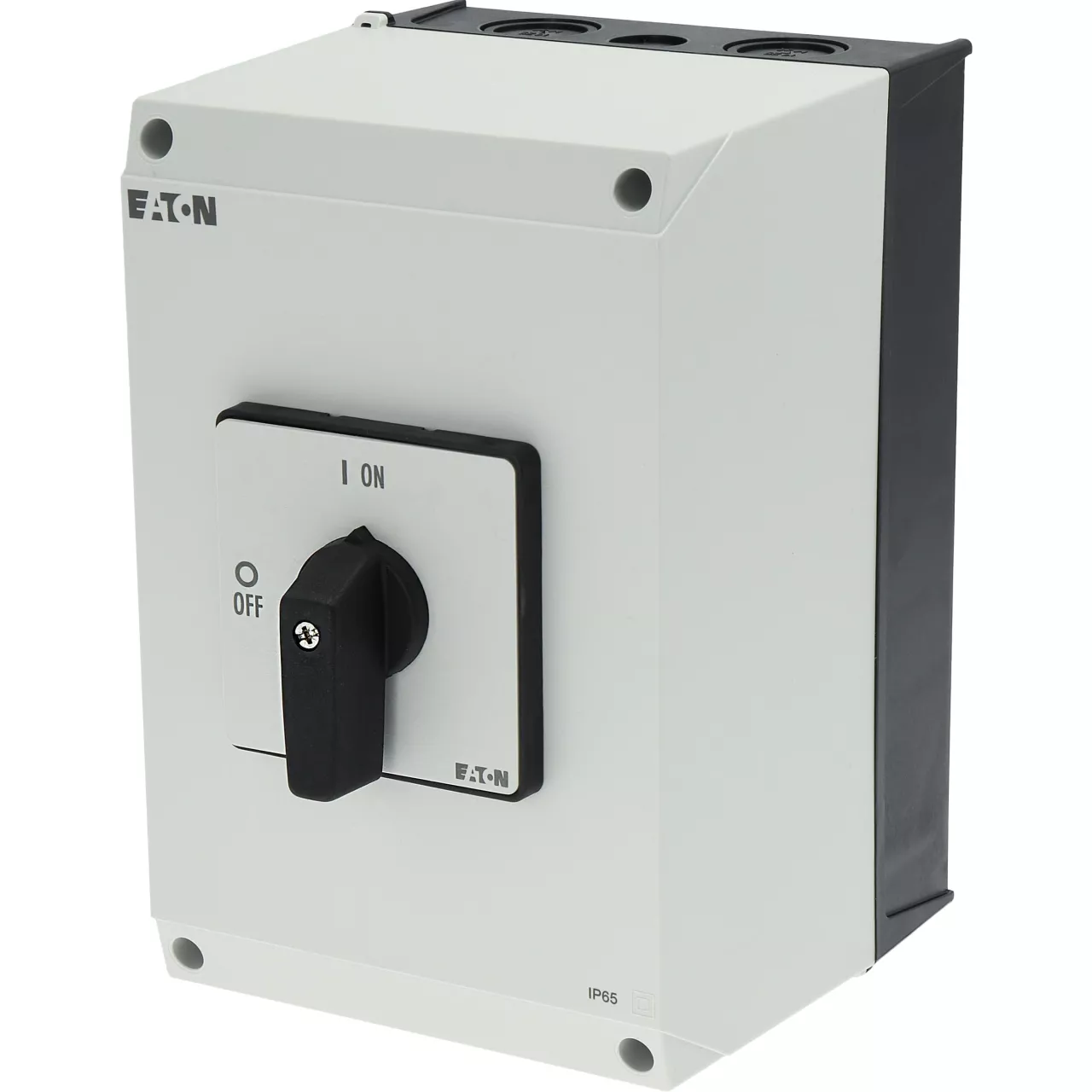 Przełącznik wł.-wył., Zacisk śrubowy: Przełącznik wł.-wył., Odniesienie grupy części T5B, z czarnym pokrętłem z tabliczką czołową, 6-biegunowy, Stopień ochrony: IP65, Projekt: montaż powierzchniowy, Kąt przełączania: 90°, Przebieg łączenia: bez samopowrotu, tabliczka czołowa: 0-1, Moc znamionowa AC-23A, 50 - 60 Hz 400 V: P = 30 kW, Znamionowy prąd ciągły: Iu = 63 A, 4 zespoł montażowy, Normy: IEC/EN 60947, VDE 0660, IEC/EN 60204, CSA, UL, Rozłącznik izolacyjny zgodnie z normą IEC/EN 60947-3