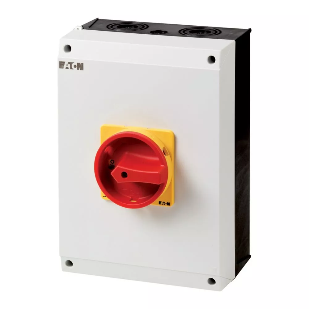 T5-4-8344/I5/SVB Rozłącznik główny, 8-bieg., 100 A, funkcja awaryjnego zatrzymania , 90 °, blok. na kłódkę w pozycji Wył., w obudowie IP65, pokrętło czerwono-żółte z blokadą na kłódkę