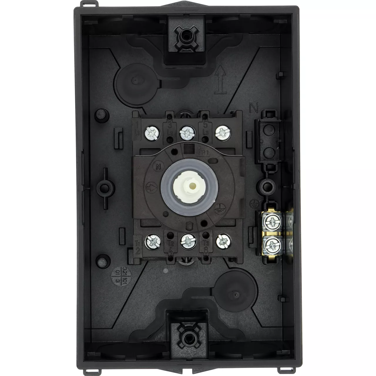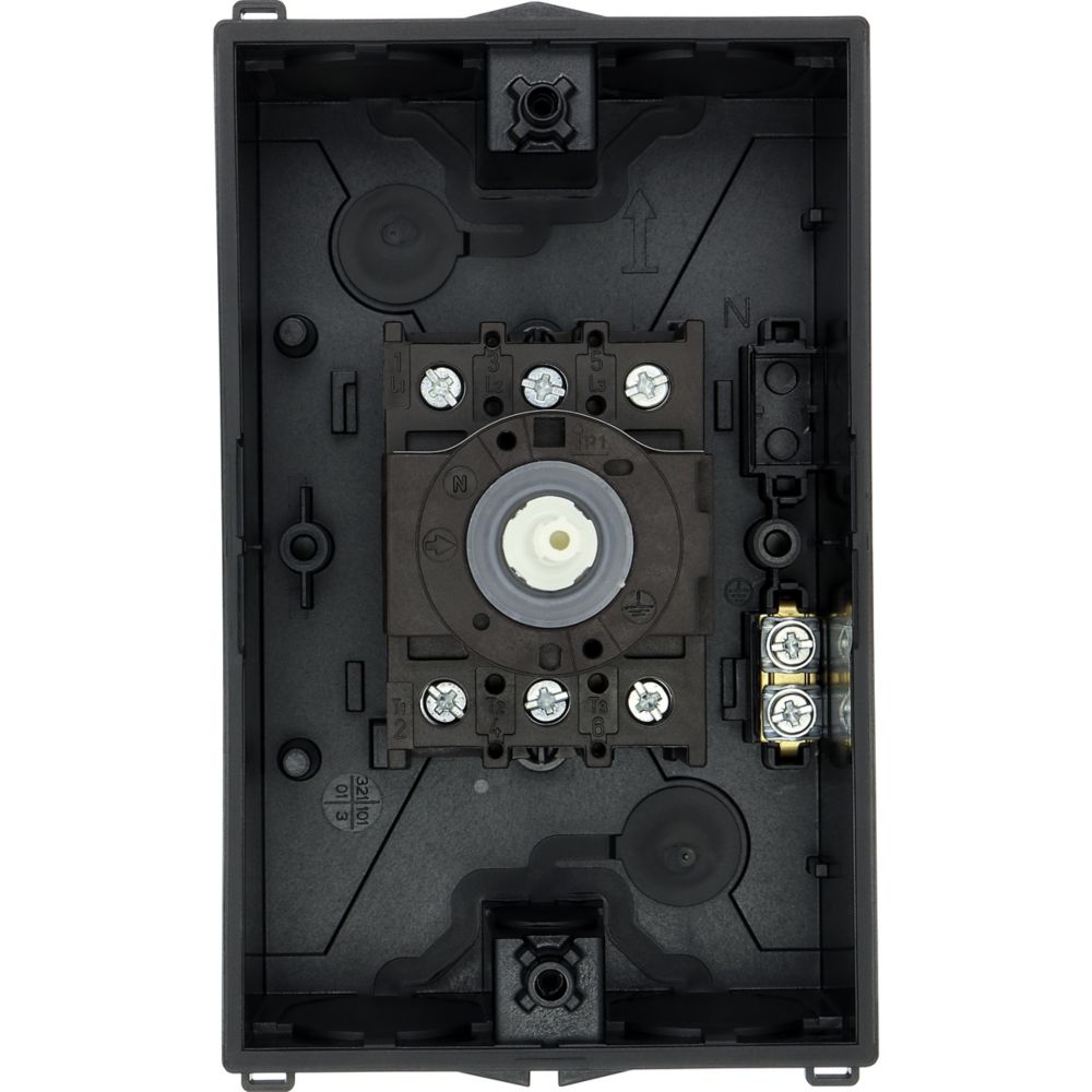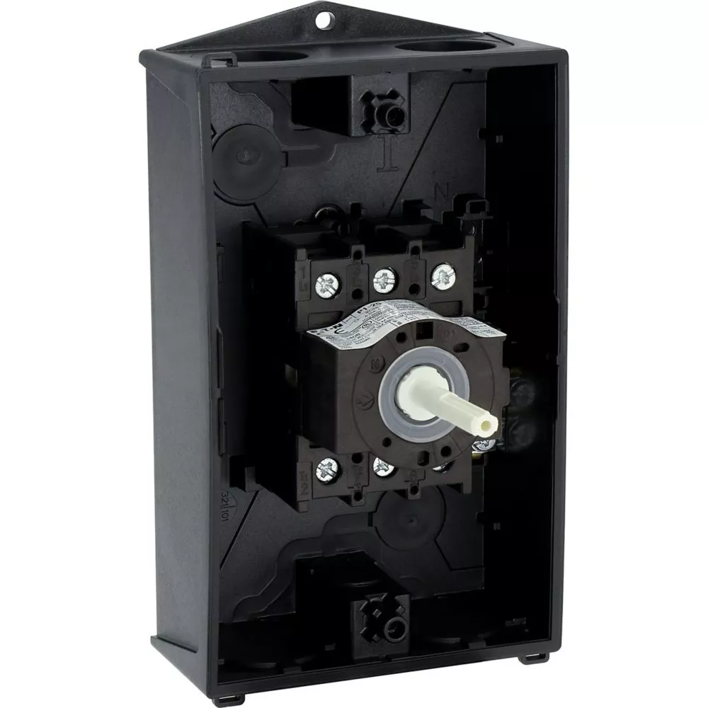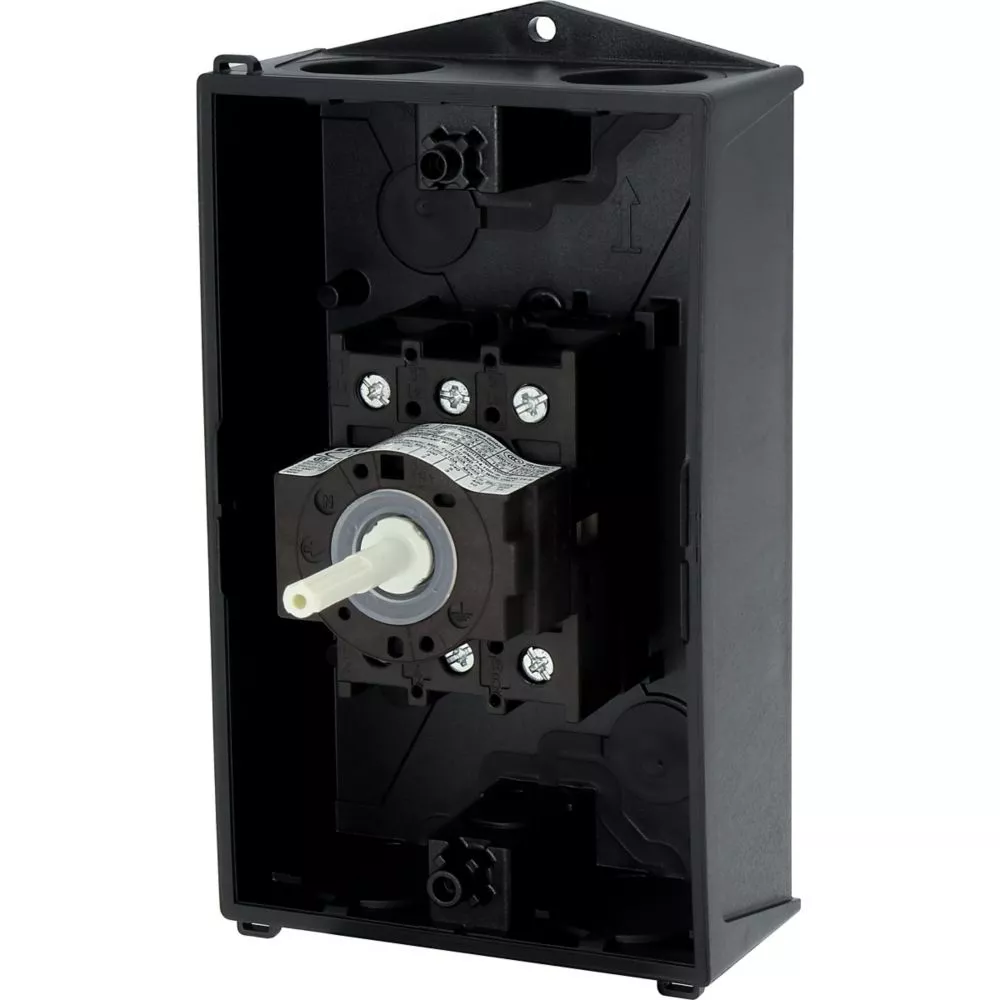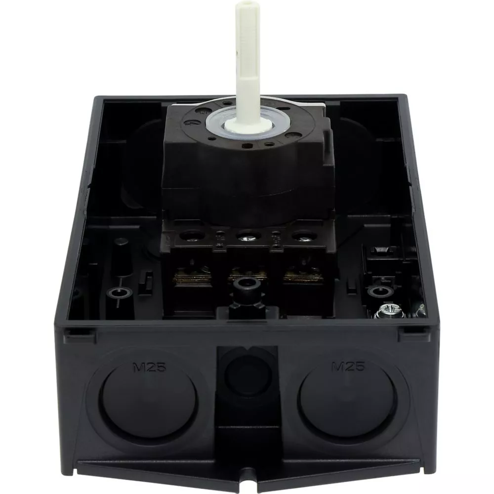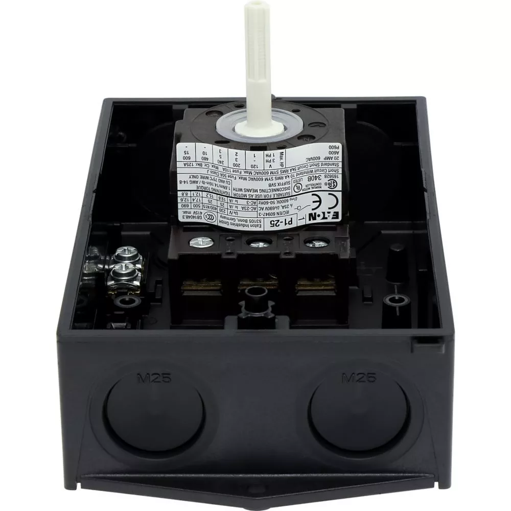 Wyłącznik główny, P1, Znamionowy prąd ciągły (Iu): 25 A, Funkcje: Funkcja STOP, Z mechanizmem ryglującym, Wyposażone w: Czarny uchwyt obrotowy i pierścień blokujący, Sposób montażu: Montaż powierzchniowy, Liczba biegunów: Trzybiegunowy, Element blokujący: Możliwość zablokowania w położeniu 0 (Wył.), Stopień ochrony: NEMA 12