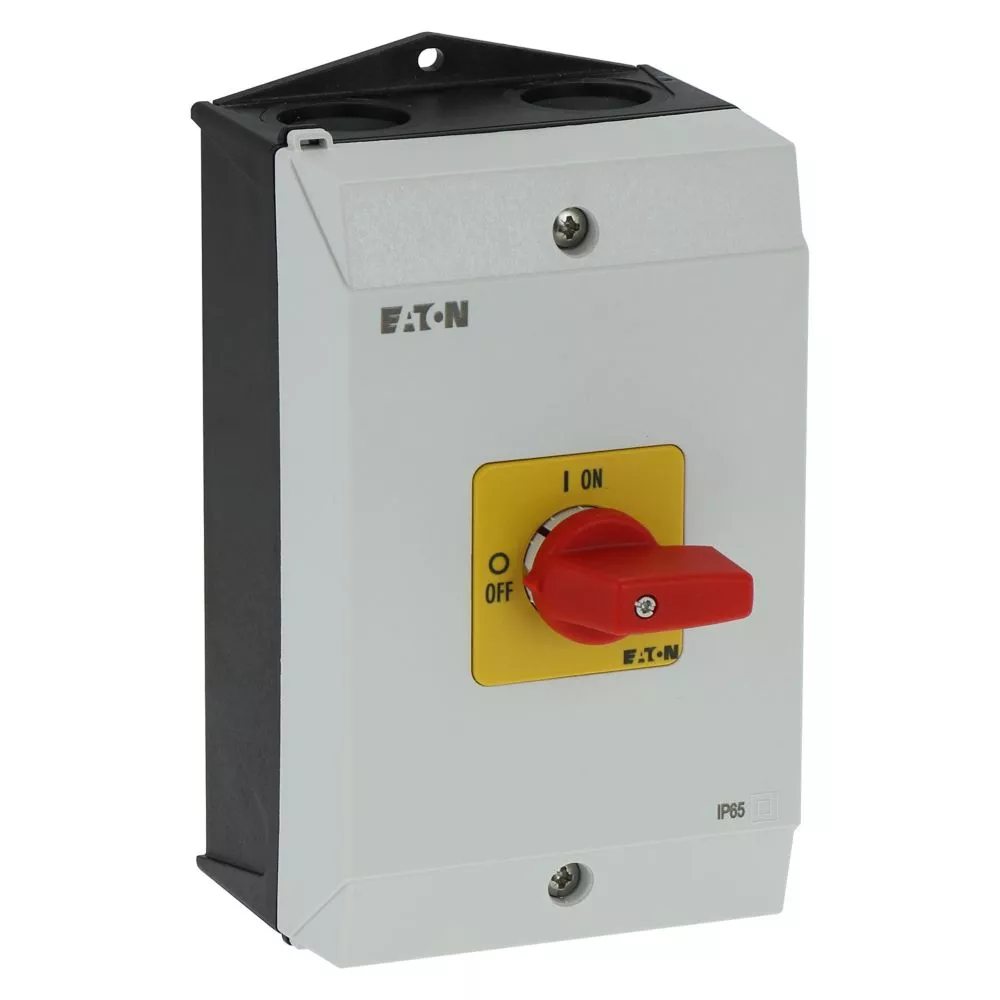 Rozłącznik ZAŁ-WYŁ, P1, Znamionowy prąd ciągły (Iu): 25 A, Funkcje: Funkcja wyłączania awaryjnego, Wyposażone w: Czerwone pokrętło z żółtą tabliczką czołową, Sposób montażu: Montaż powierzchniowy, Liczba biegunów: Trzybiegunowy, Stopień ochrony: NEMA 12