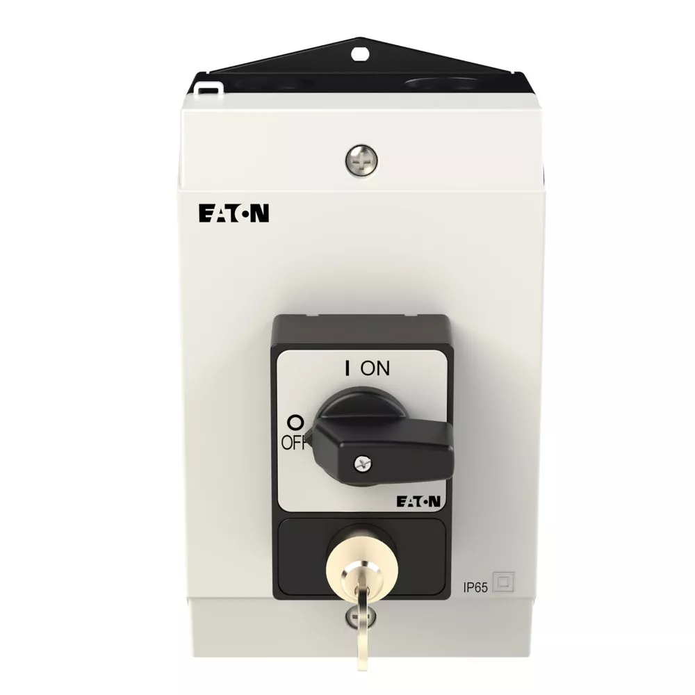 Rozłącznik panikowy, Zacisk śrubowy: Przełącznik z mechanizmem blokującym, Odniesienie grupy części P1, z czarnym pokrętłem z tabliczką czołową, Informacje dotyczące dostarczonego sprzętu: Styk pomocniczy lub przewód neutralny montowany przez użytkownika., z dwoma kluczykami, 3-biegunowy, mechanizm blokujący: Zamek cylindryczny SVA, Uwagi: Jeśli kluczyk zostanie wyjęty z wyłącznika zapłonu w położeniu 1, można go wyłączyć, ale nie można ponownie włączyć bez kluczyka., Element blokujący: możliwość zablokowania w położeniu 0 za pomocą blokady pokrywy, Stopień ochrony: IP65, Projekt: montaż powierzchniowy, Kąt przełączania: 90°, Przebieg łączenia: bez samopowrotu, tabliczka czołowa: 0-1, Moc znamionowa AC-23A, 50 - 60 Hz 400 V: P = 11 kW