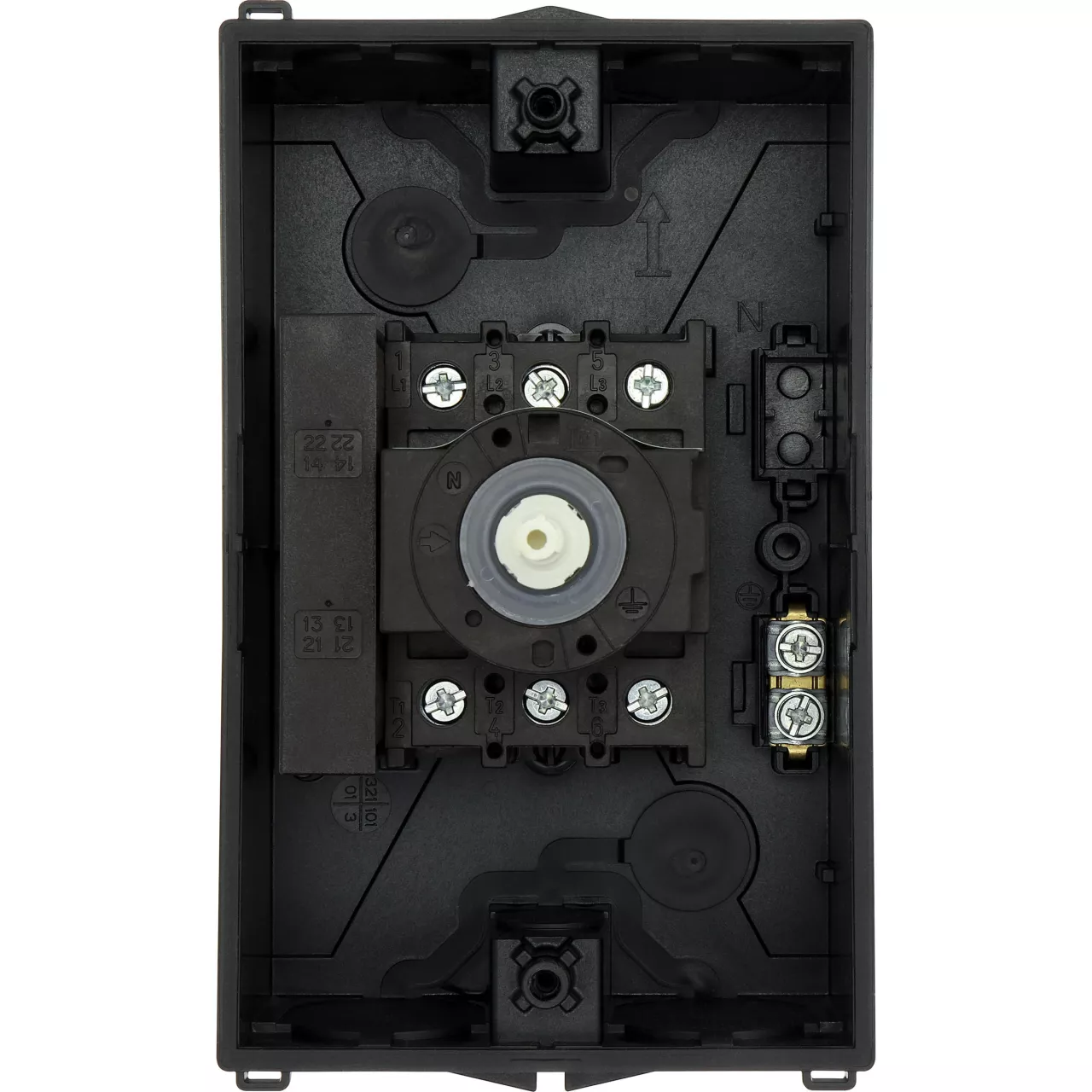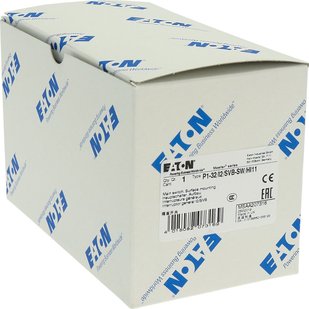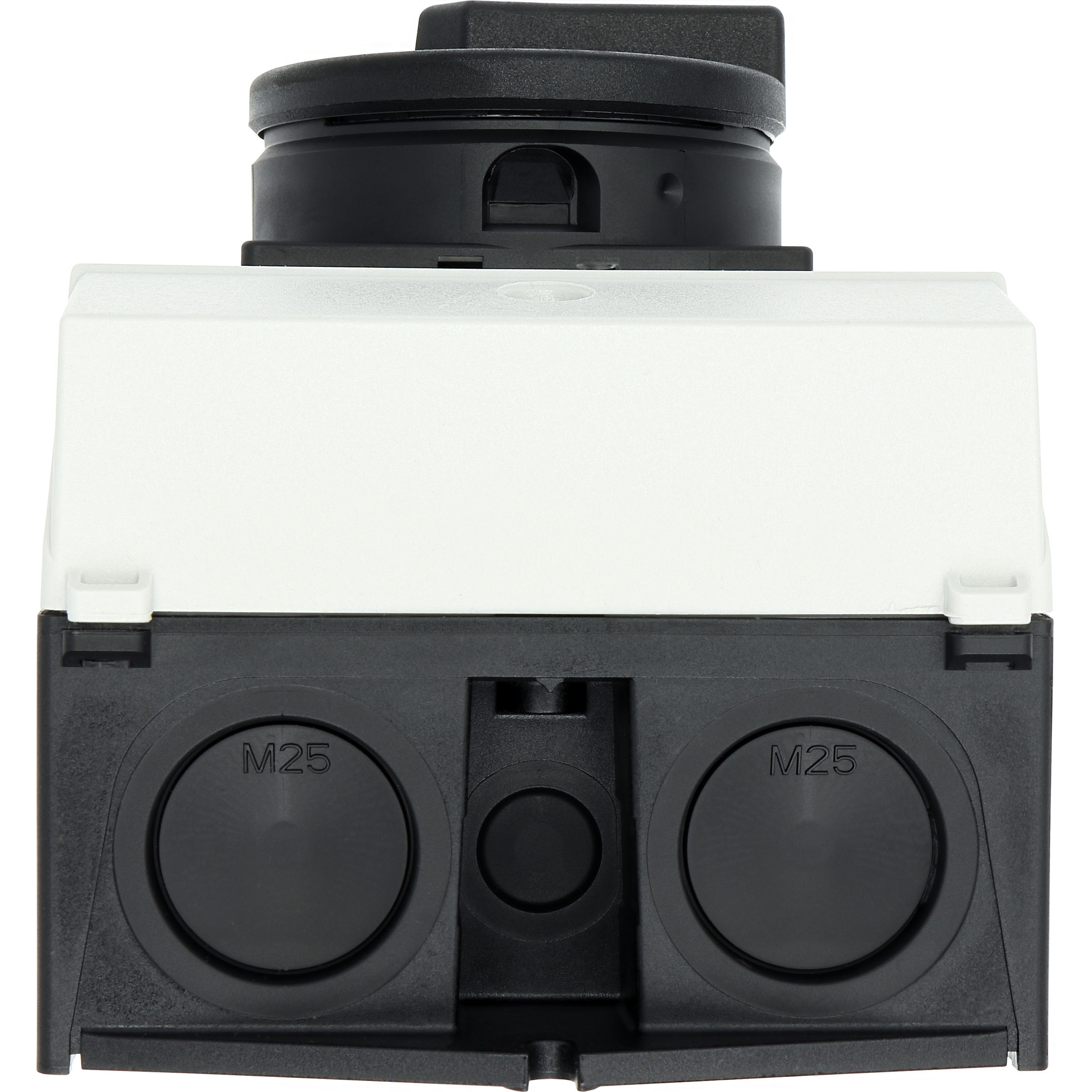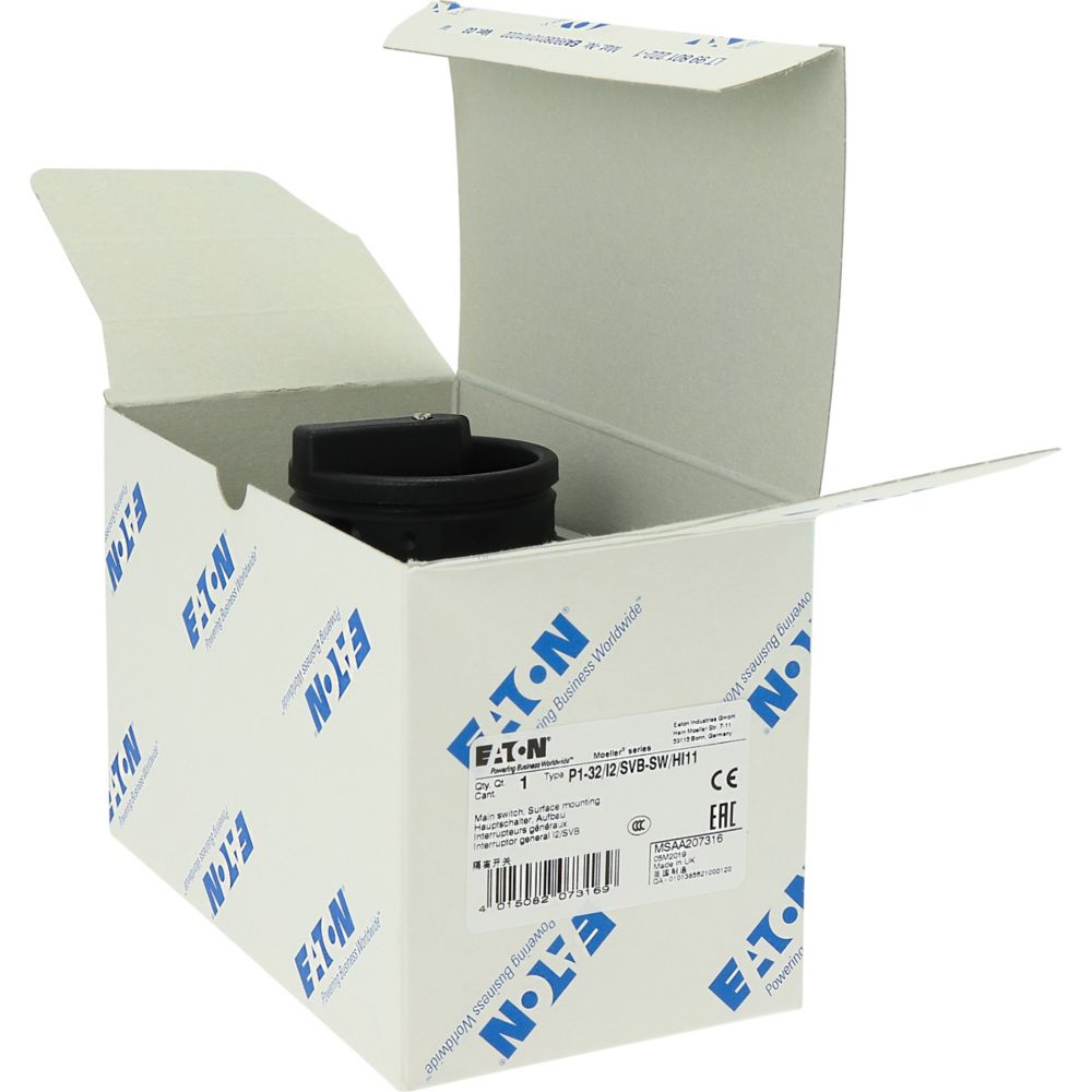 Wyłącznik główny, P1, Znamionowy prąd ciągły (Iu): 32 A, Funkcje: Z mechanizmem ryglującym, Funkcja STOP, Wyposażone w: Czarny uchwyt obrotowy i pierścień blokujący, Sposób montażu: Montaż powierzchniowy, Liczba biegunów: Trzybiegunowy, Element blokujący: Możliwość zablokowania w położeniu 0 (Wył.), Stopień ochrony: NEMA 12