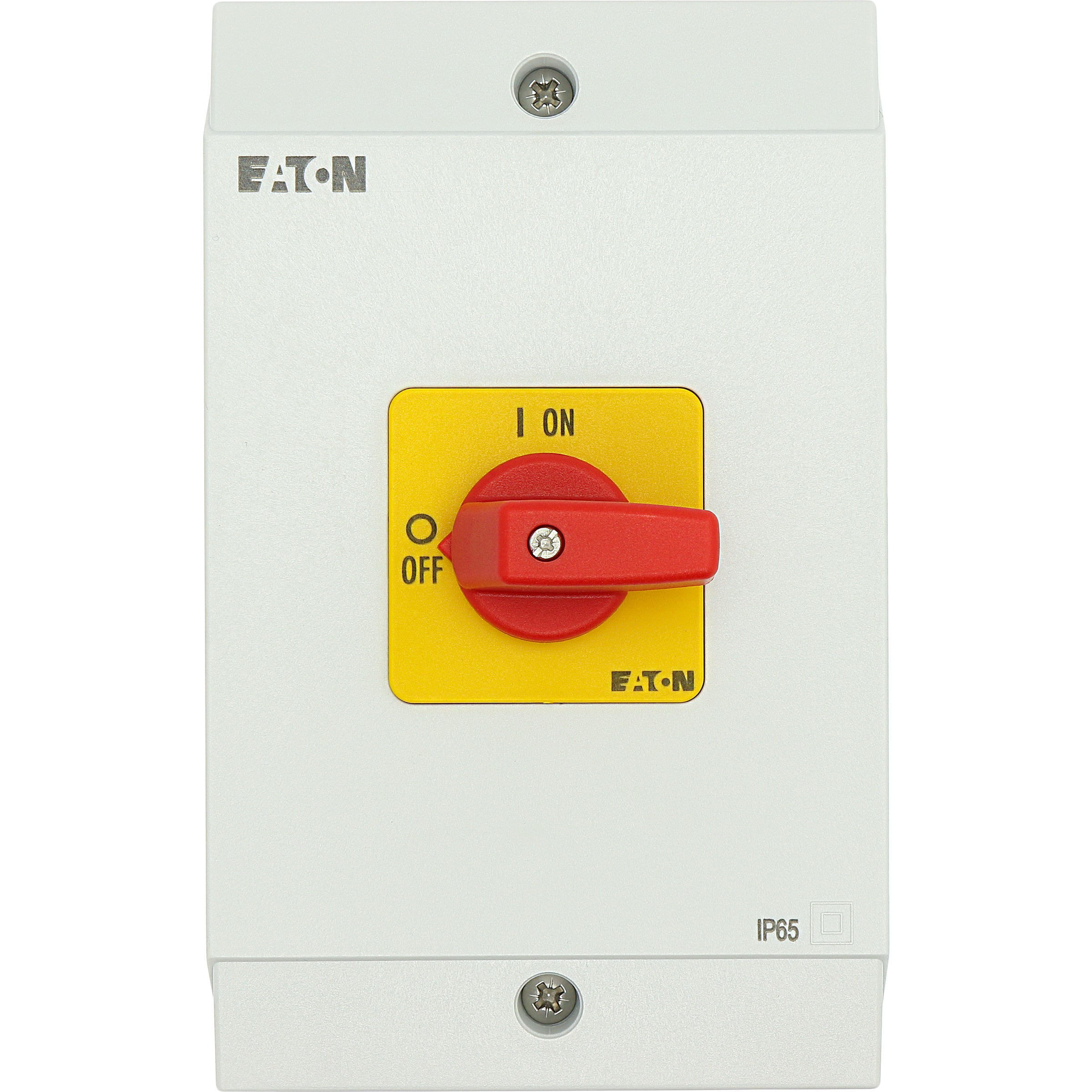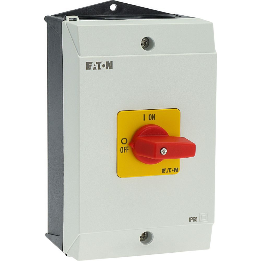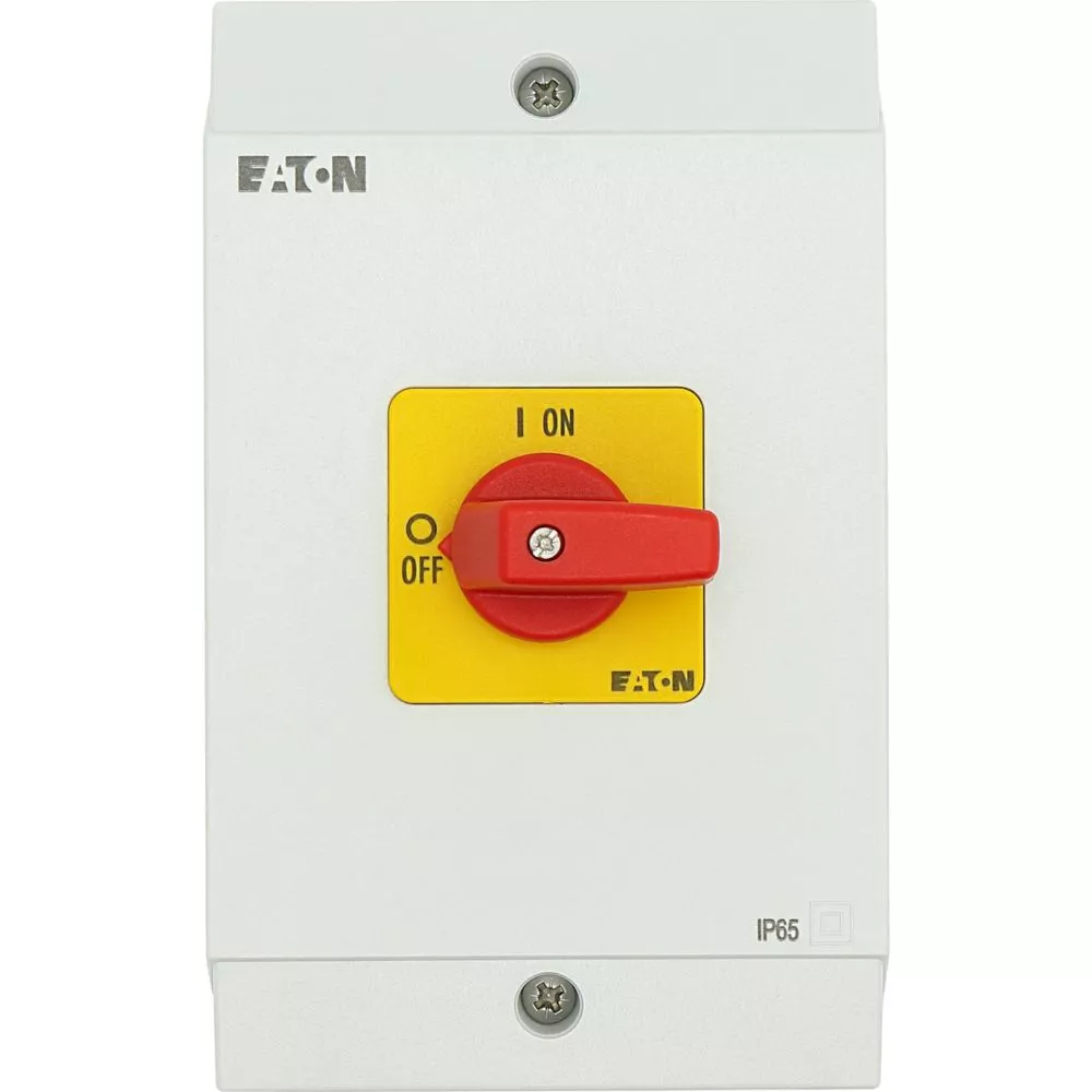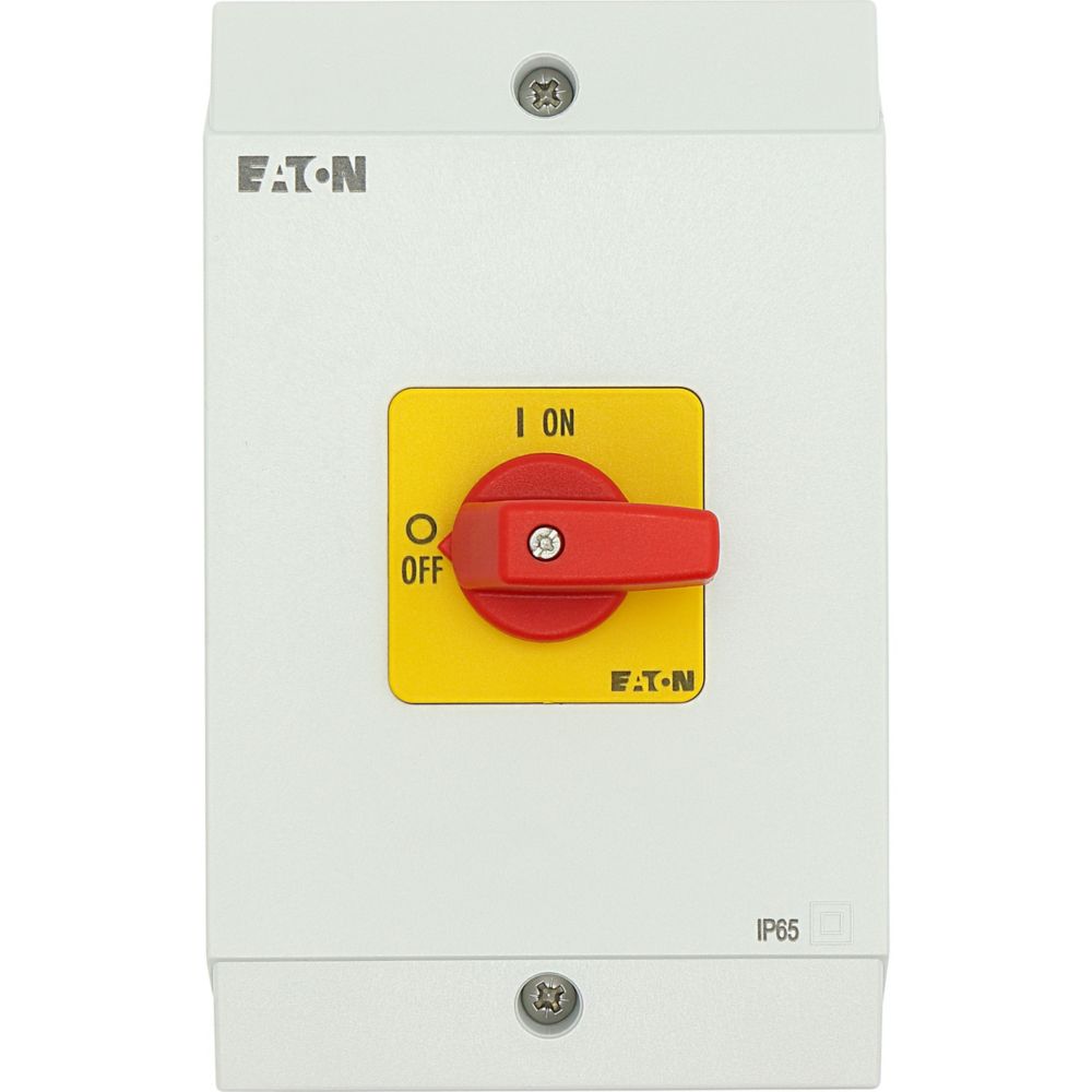Rozłącznik ZAŁ-WYŁ, P1, Znamionowy prąd ciągły (Iu): 32 A, Funkcje: Funkcja wyłączania awaryjnego, Wyposażone w: Czerwone pokrętło z żółtą tabliczką czołową, Sposób montażu: Montaż powierzchniowy, Liczba biegunów: Trzybiegunowy, Stopień ochrony: NEMA 12