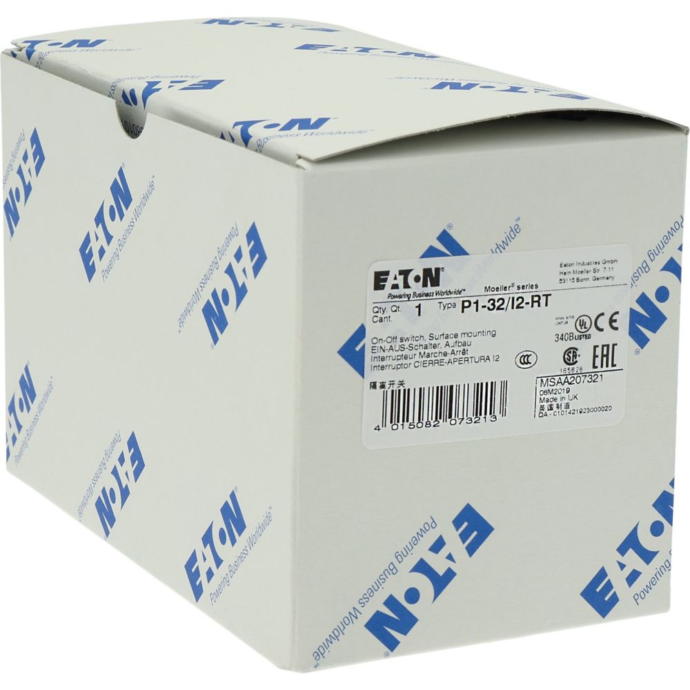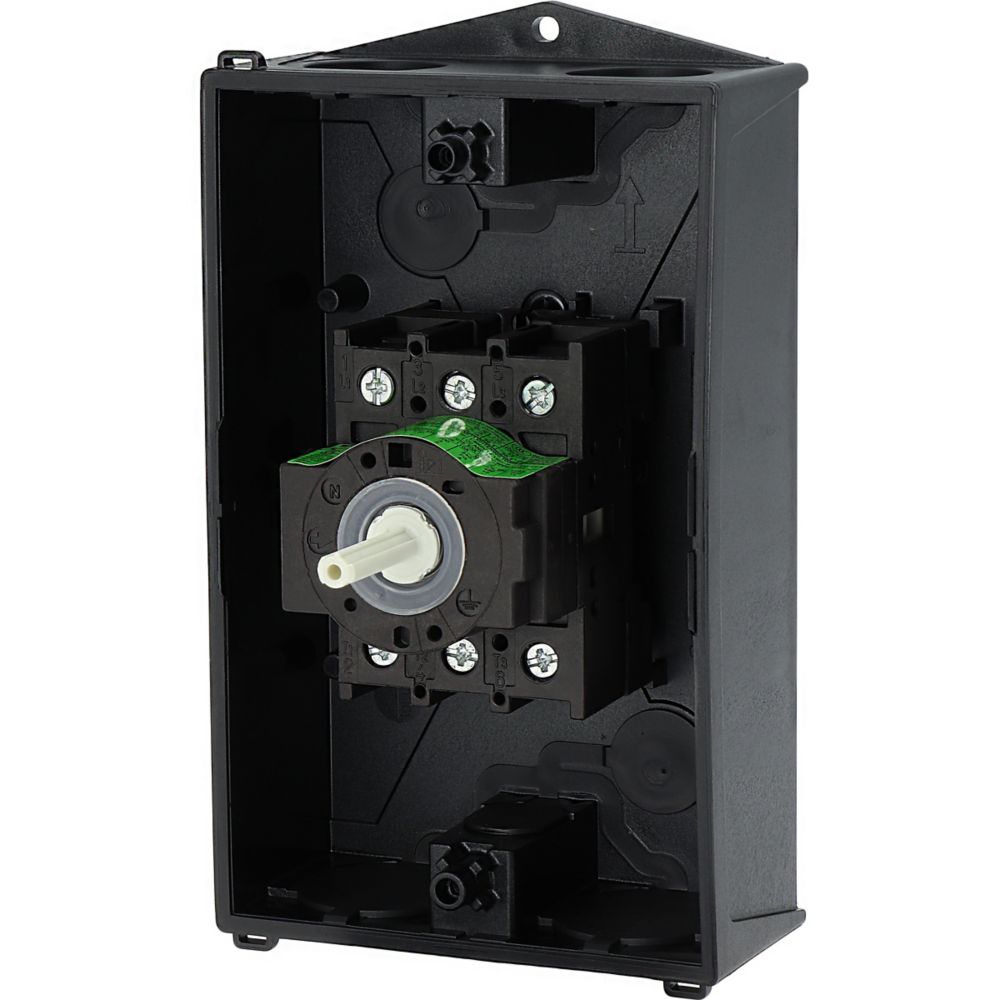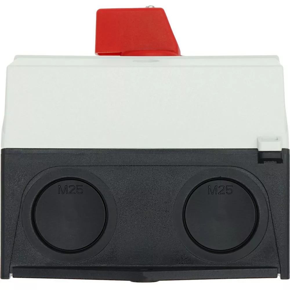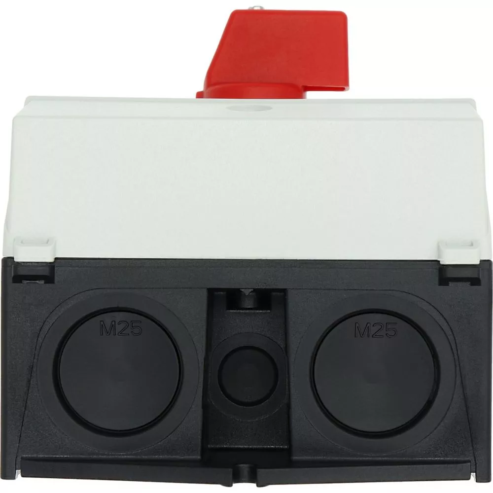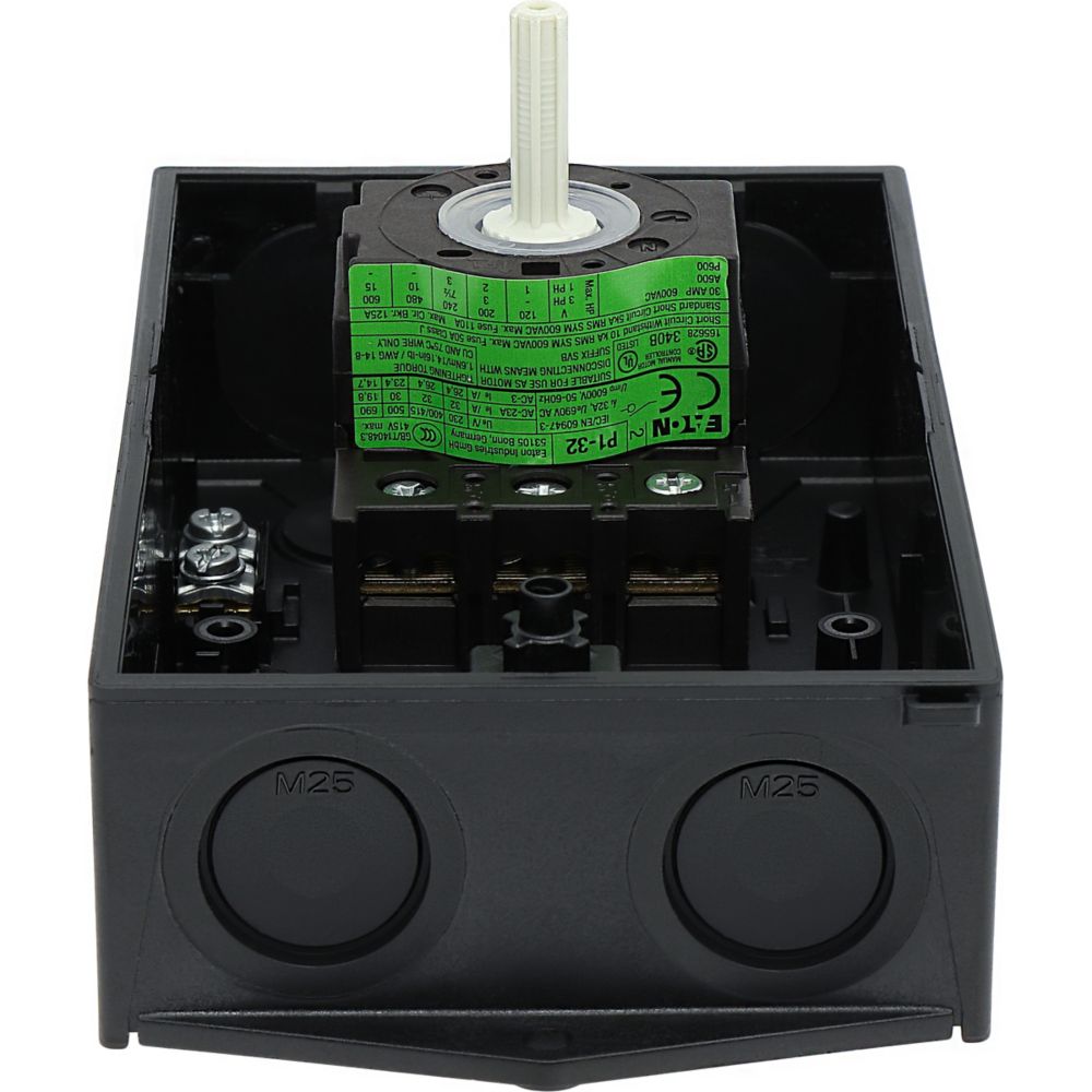 Rozłącznik ZAŁ-WYŁ, P1, Znamionowy prąd ciągły (Iu): 32 A, Funkcje: Funkcja wyłączania awaryjnego, Wyposażone w: Czerwone pokrętło z żółtą tabliczką czołową, Sposób montażu: Montaż powierzchniowy, Liczba biegunów: Trzybiegunowy, Stopień ochrony: NEMA 12