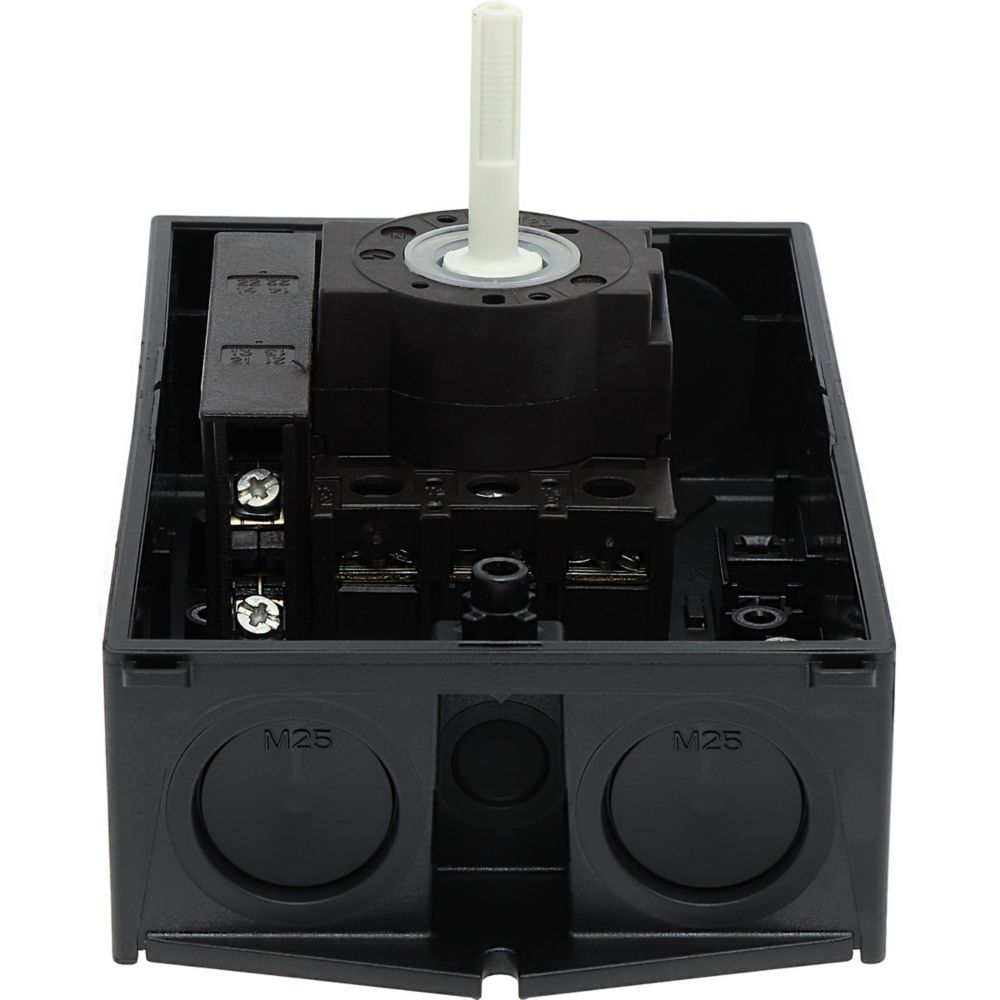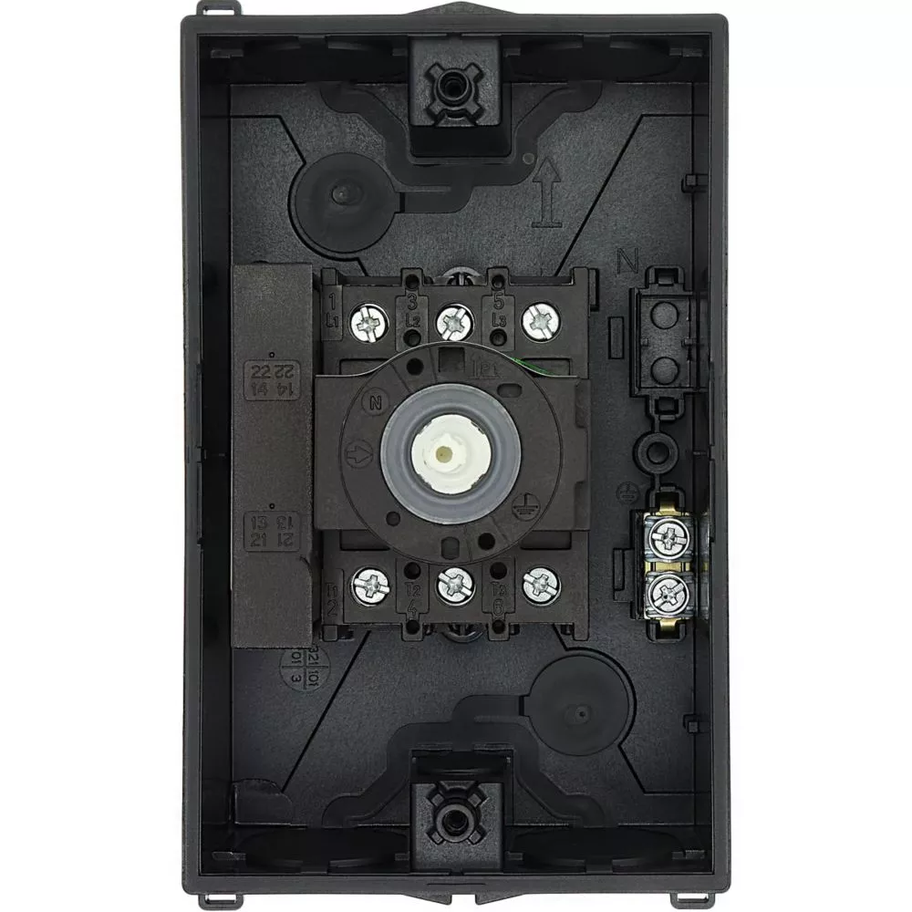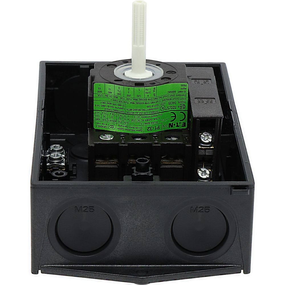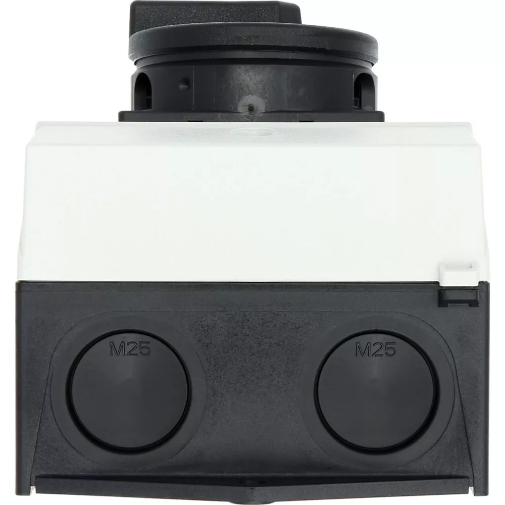 Rozłącznik bezpieczeństwa, Zacisk śrubowy: rozłącznik bezpieczeństwa, Odniesienie grupy części P1, Funkcja zatrzymania: Funkcja STOP, Z czarnym uchwytem obrotowym i pierścieniem blokującym, Uwagi: z etykietą ostrzegawczą „rozłącznik bezpieczeństwa”, Informacje dotyczące dostarczonego sprzętu: Styk pomocniczy lub przewód neutralny montowany przez użytkownika., 3-biegunowy, Element blokujący: możliwość zablokowania w położeniu 0 za pomocą blokady pokrywy, Stopień ochrony: IP65, Projekt: montaż powierzchniowy, Moc znamionowa AC-23A, 50 - 60 Hz 400 V: P = 15 kW, Znamionowy prąd ciągły: Iu = 32 A, Normy: IEC/EN 60947, VDE 0660, IEC/EN 60204, Rozłącznik izolacyjny zgodnie z normą IEC/EN 60947-3