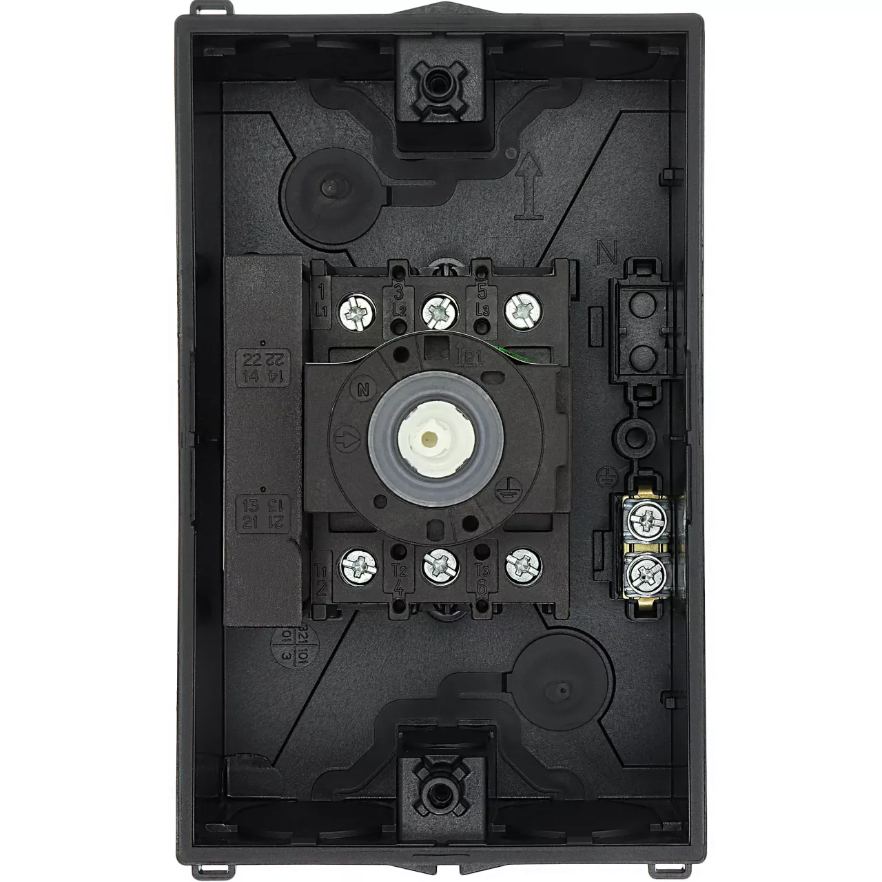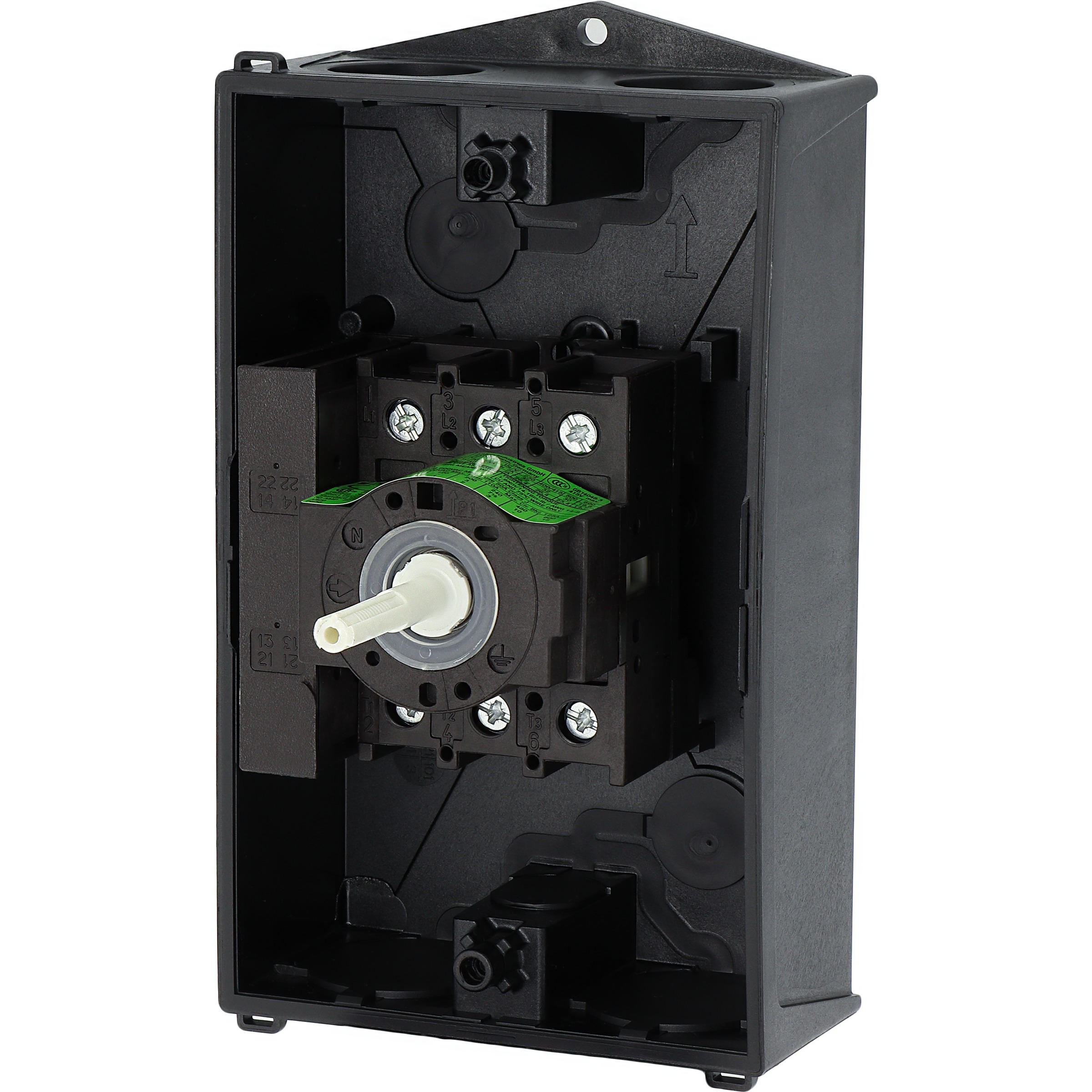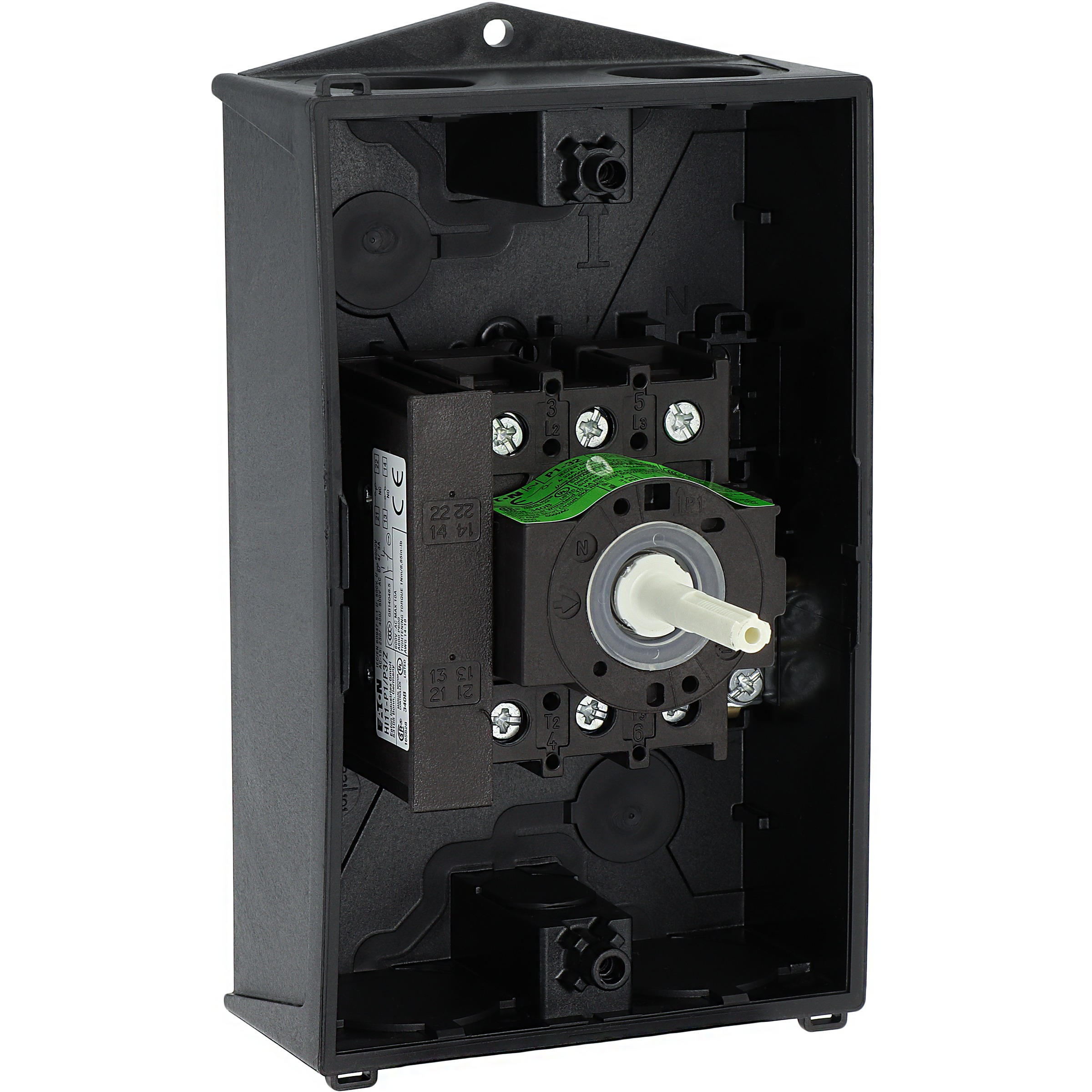 Rozłącznik bezpieczeństwa, Zacisk śrubowy: rozłącznik bezpieczeństwa, Odniesienie grupy części P1, Funkcja zatrzymania: Funkcja STOP, Z czarnym uchwytem obrotowym i pierścieniem blokującym, Uwagi: z etykietą ostrzegawczą „rozłącznik bezpieczeństwa”, Informacje dotyczące dostarczonego sprzętu: Styk pomocniczy lub przewód neutralny montowany przez użytkownika., 3-biegunowy, Element blokujący: możliwość zablokowania w położeniu 0 za pomocą blokady pokrywy, Stopień ochrony: IP65, Projekt: montaż powierzchniowy, Moc znamionowa AC-23A, 50 - 60 Hz 400 V: P = 15 kW, Znamionowy prąd ciągły: Iu = 32 A, Normy: IEC/EN 60947, VDE 0660, IEC/EN 60204, Rozłącznik izolacyjny zgodnie z normą IEC/EN 60947-3
