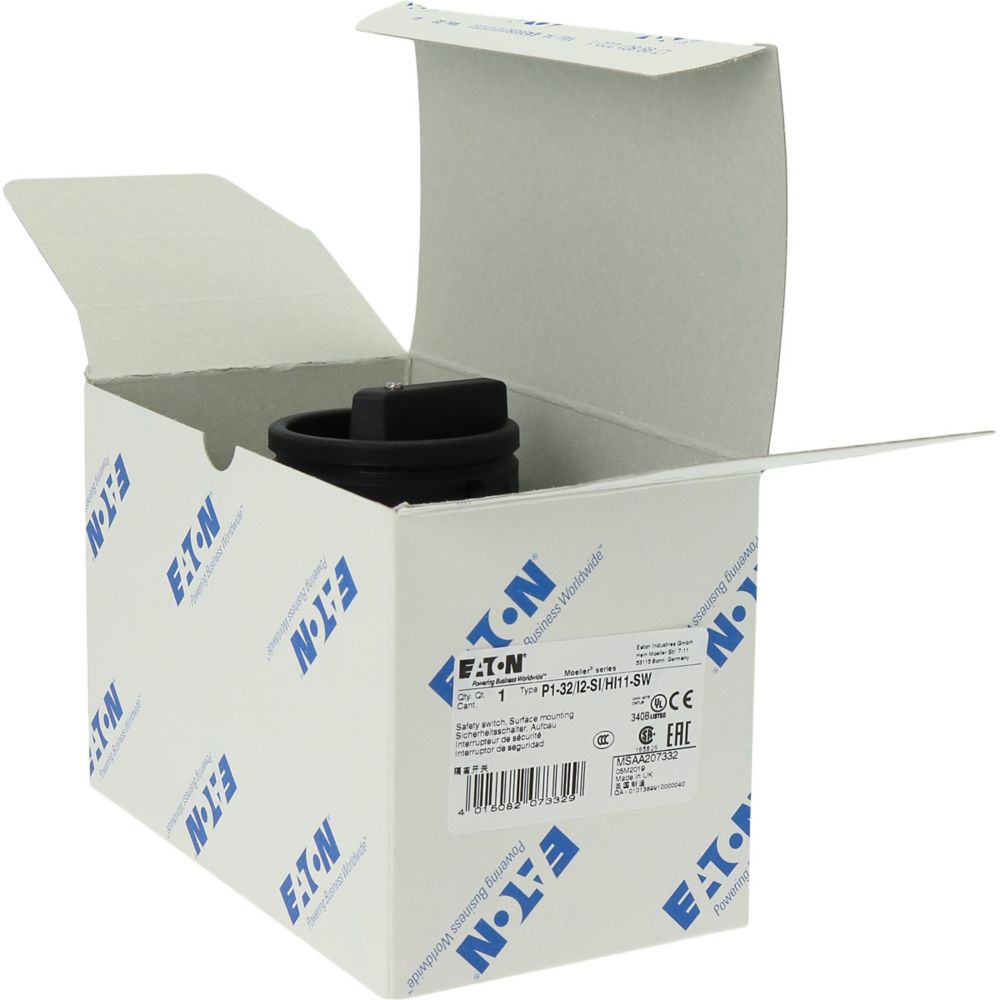 P1-32/I2-SI/HI11-SW Rozłącznik bezpieczeństwa, 3 bieg.+1NO+1NC, 32 A, funkcja awaryjnego zatrzymania, Blok. w pozycji 0 z osłoną blokady, z tabliczką ostrzegawczą "rozłącznik bezpieczeństwa", w obudowie IP65, pokrętło czarne z blokadą na kłódkę