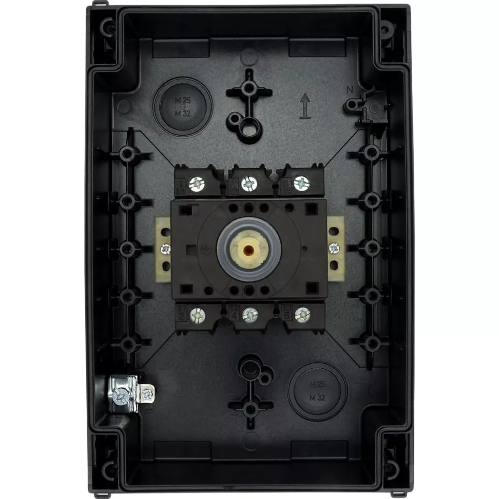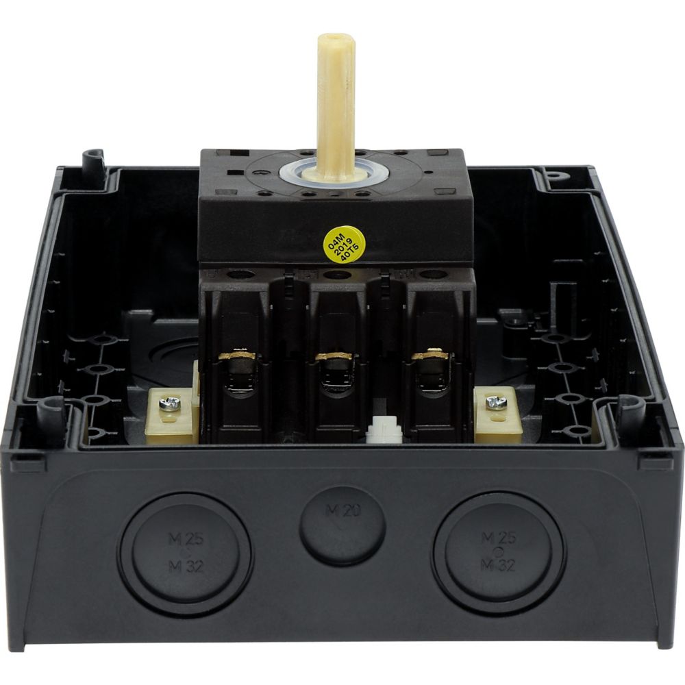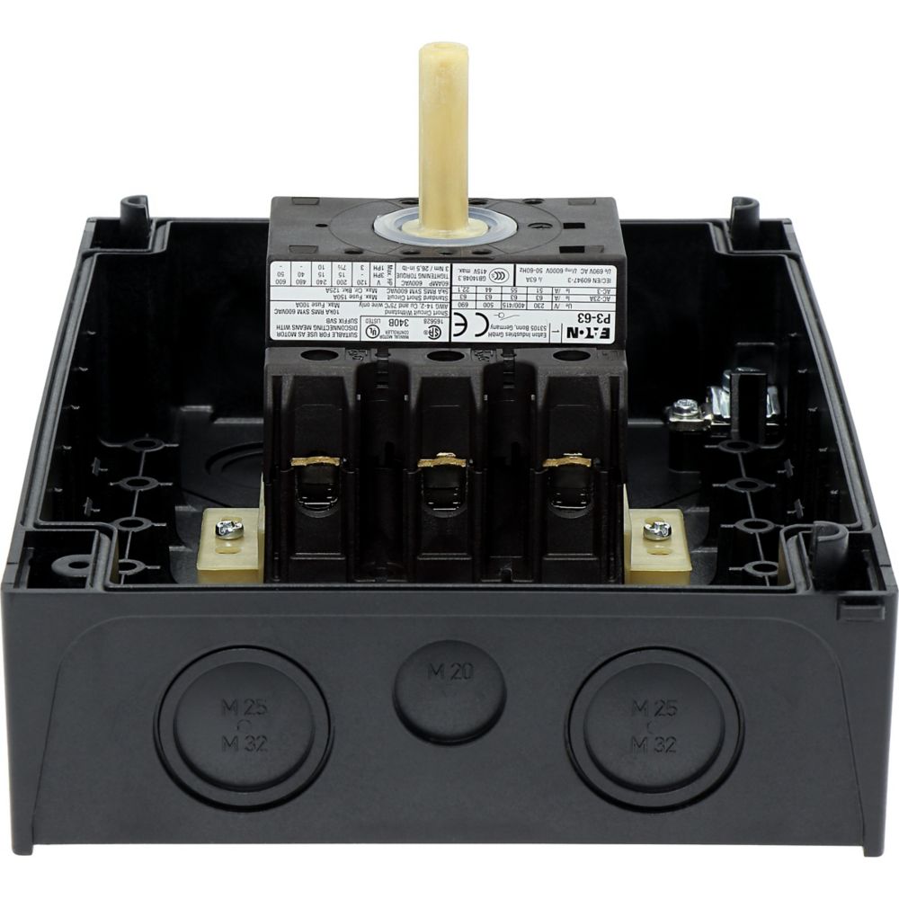 Wyłącznik główny, Zacisk śrubowy: Wyłącznik główny, wyłącznik serwisowy, Odniesienie grupy części: P3, Funkcja zatrzymania: Funkcja STOP, Z czarnym uchwytem obrotowym i pierścieniem blokującym, Informacje dotyczące dostarczonego sprzętu: Styk pomocniczy lub przewód neutralny montowany przez użytkownika., 3-biegunowy, Element blokujący: Możliwość zablokowania w położeniu 0 (Wył.), Stopień ochrony: IP65, Projekt: montaż powierzchniowy, Moc znamionowa AC-23A, 50 - 60 Hz 400 V: P = 30 kW, Znamionowy prąd ciągły: Iu = 63 A, Normy: IEC/EN 60947, VDE 0660, IEC/EN 60204, CSA, UL, Rozłącznik izolacyjny zgodnie z normą IEC/EN 60947-3