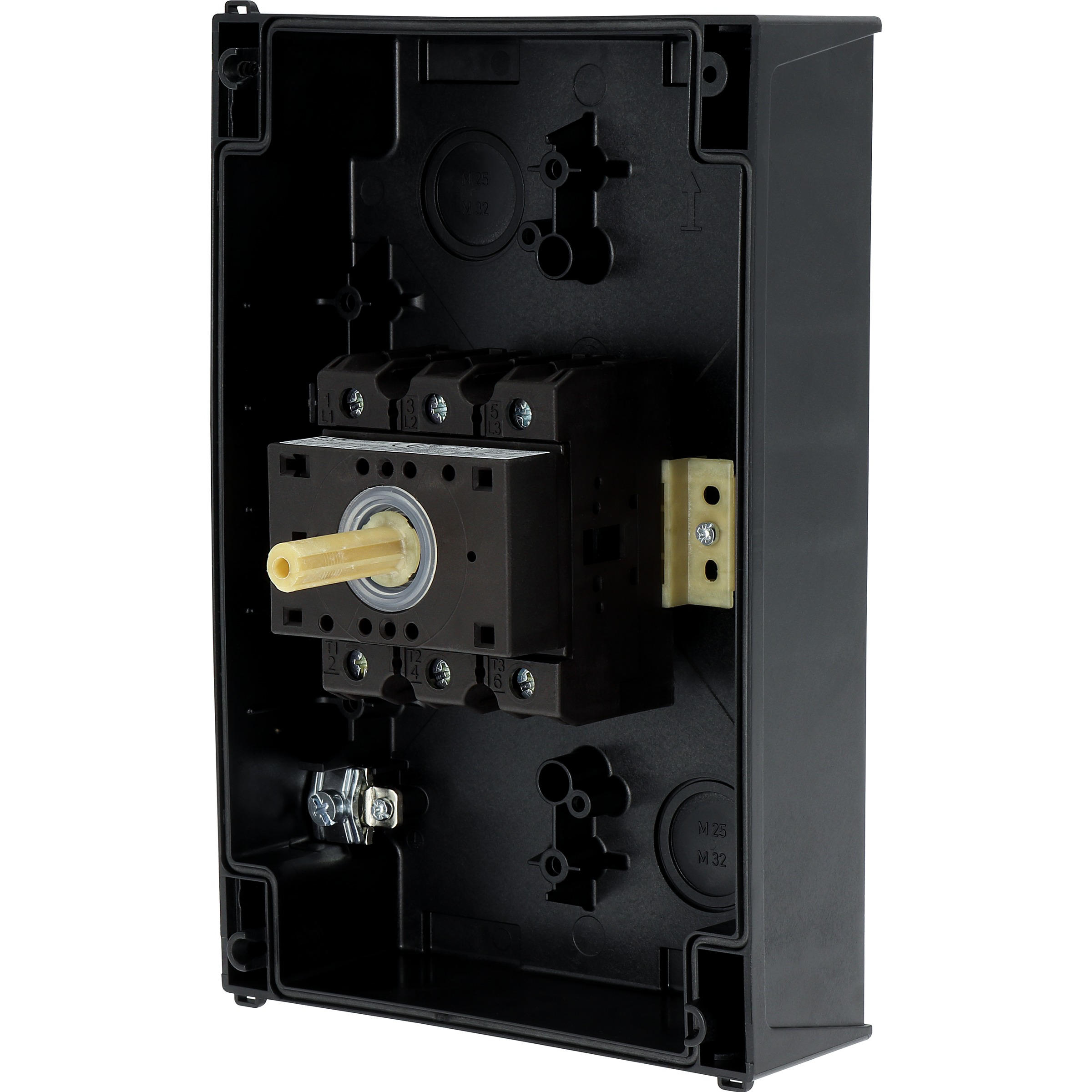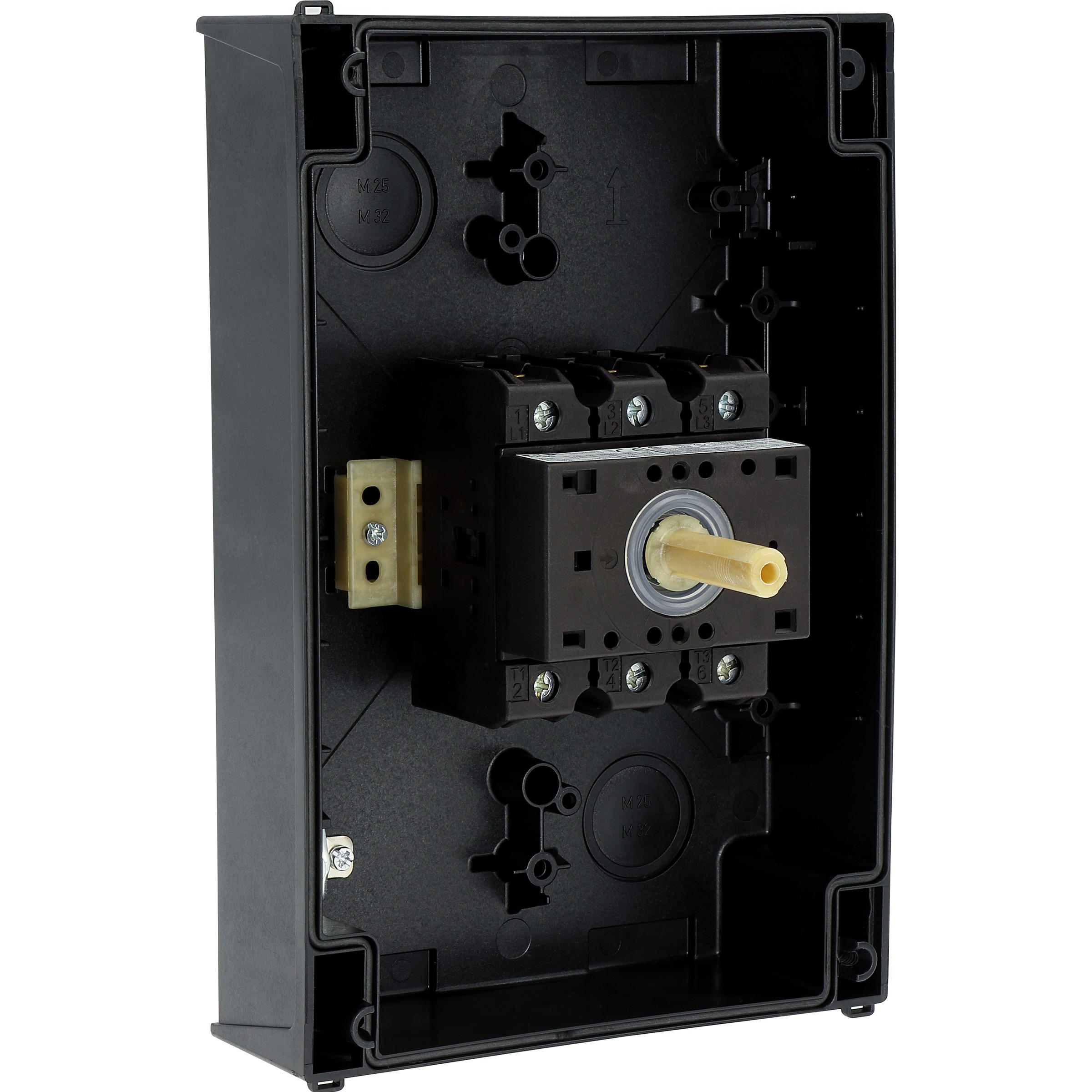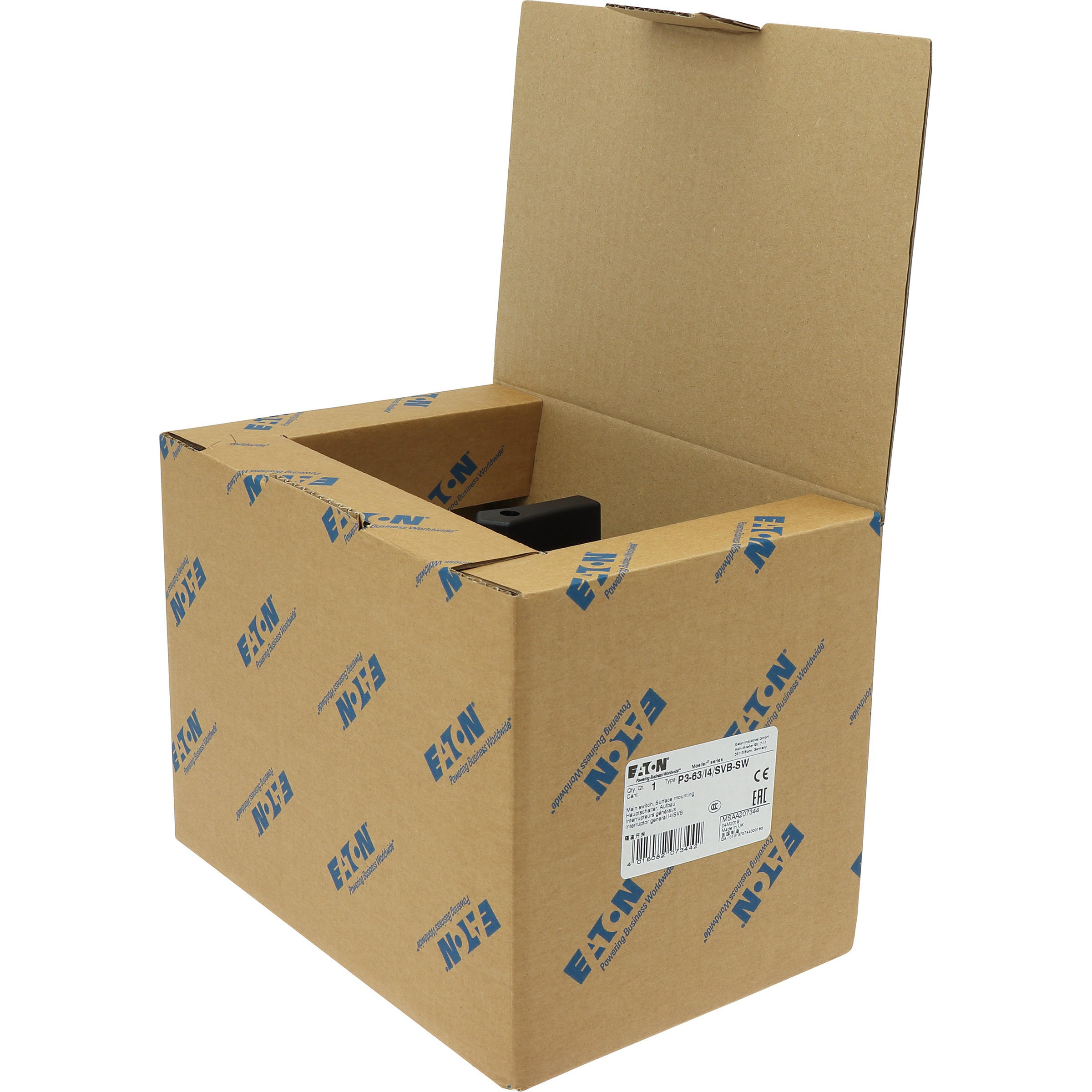 Wyłącznik główny, Zacisk śrubowy: Wyłącznik główny, wyłącznik serwisowy, Odniesienie grupy części: P3, Funkcja zatrzymania: Funkcja STOP, Z czarnym uchwytem obrotowym i pierścieniem blokującym, Informacje dotyczące dostarczonego sprzętu: Styk pomocniczy lub przewód neutralny montowany przez użytkownika., 3-biegunowy, Element blokujący: Możliwość zablokowania w położeniu 0 (Wył.), Stopień ochrony: IP65, Projekt: montaż powierzchniowy, Moc znamionowa AC-23A, 50 - 60 Hz 400 V: P = 30 kW, Znamionowy prąd ciągły: Iu = 63 A, Normy: IEC/EN 60947, VDE 0660, IEC/EN 60204, CSA, UL, Rozłącznik izolacyjny zgodnie z normą IEC/EN 60947-3