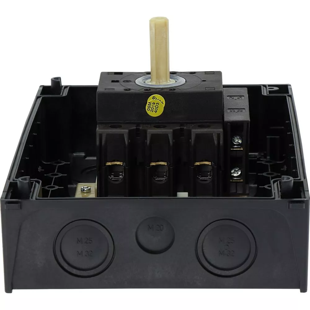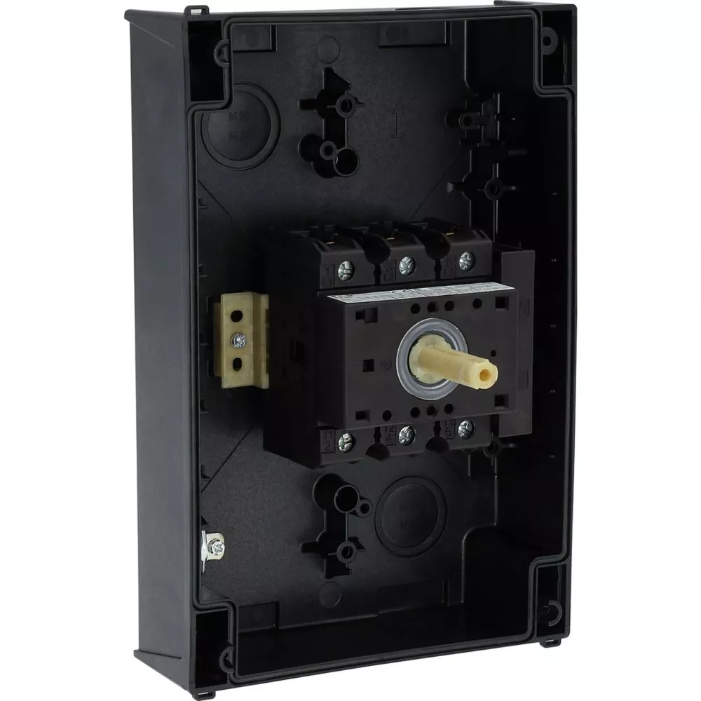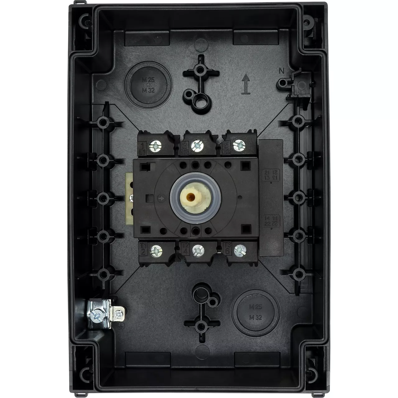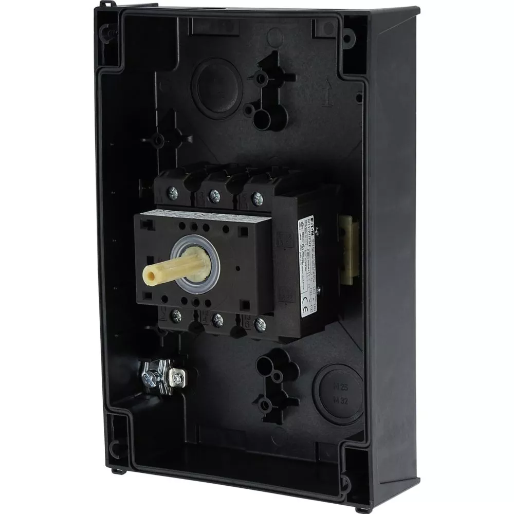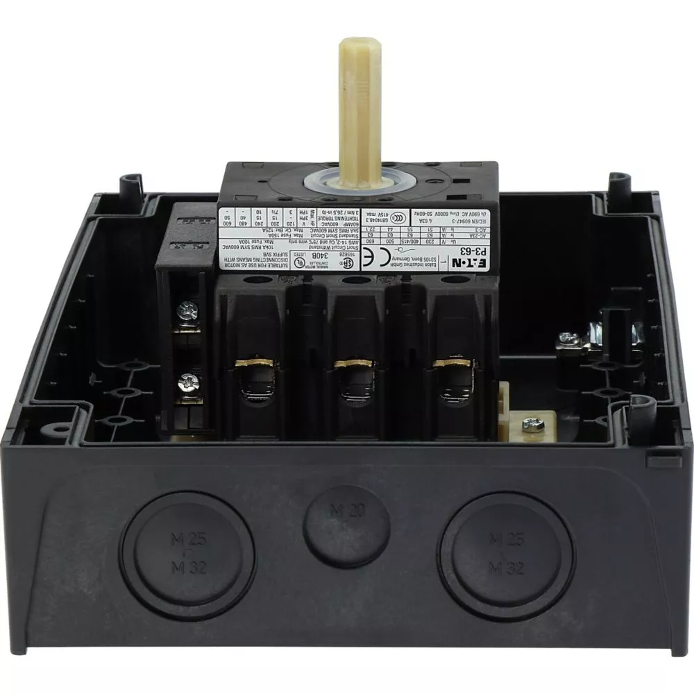 Wyłącznik główny, Zacisk śrubowy: Wyłącznik główny, wyłącznik serwisowy, Odniesienie grupy części: P3, Funkcja zatrzymania: Funkcja wyłączania awaryjnego, z czerwonym uchwytem obrotowym i żółtym pierścieniem blokującym, Informacje dotyczące dostarczonego sprzętu: Styk pomocniczy lub przewód neutralny montowany przez użytkownika., 3-biegunowy, Element blokujący: Możliwość zablokowania w położeniu 0 (Wył.), Stopień ochrony: IP65, Projekt: montaż powierzchniowy, Moc znamionowa AC-23A, 50 - 60 Hz 400 V: P = 30 kW, Znamionowy prąd ciągły: Iu = 63 A, Normy: IEC/EN 60947, VDE 0660, IEC/EN 60204, CSA, UL, Rozłącznik izolacyjny zgodnie z normą IEC/EN 60947-3