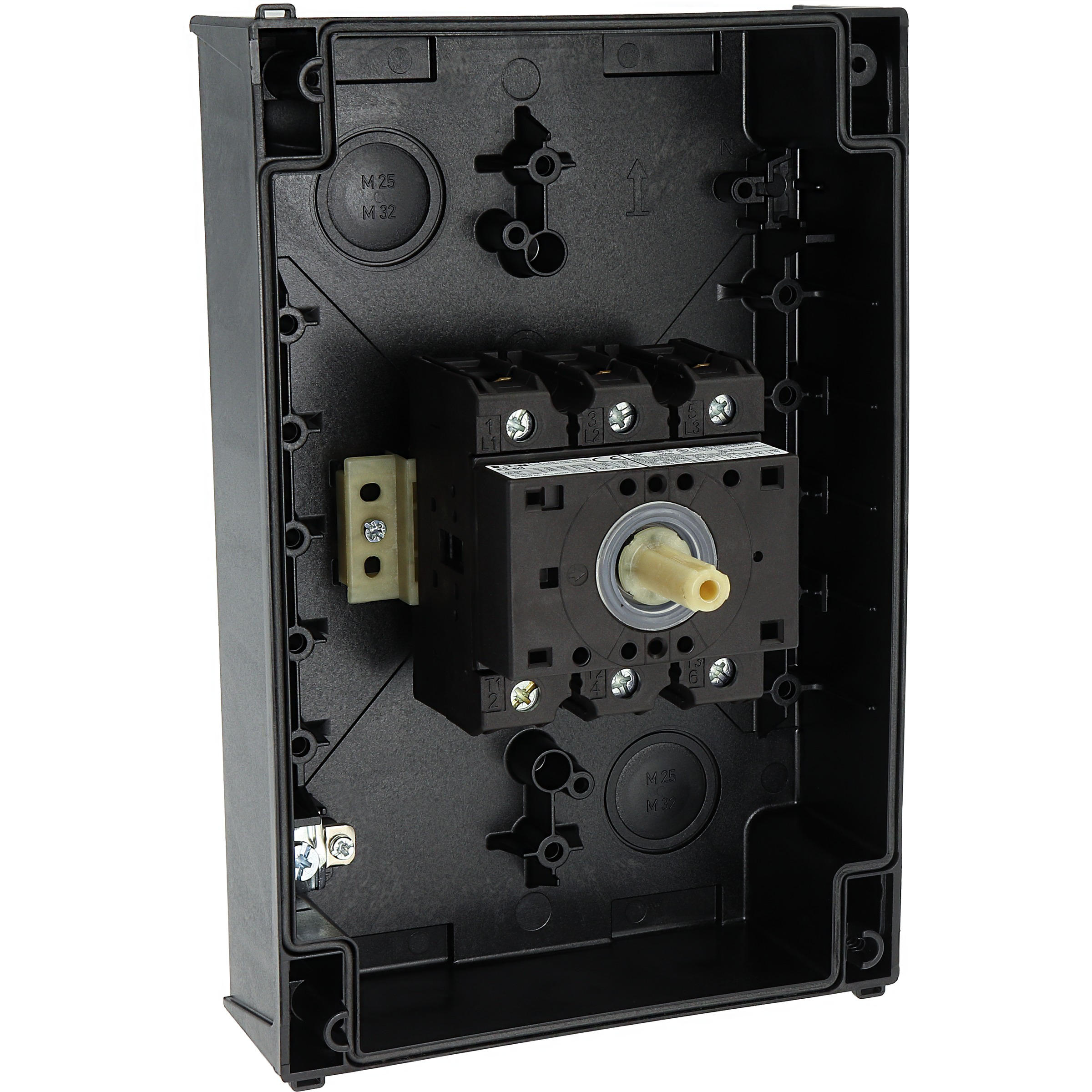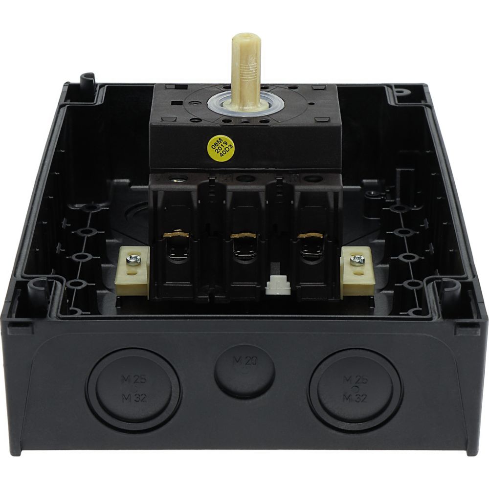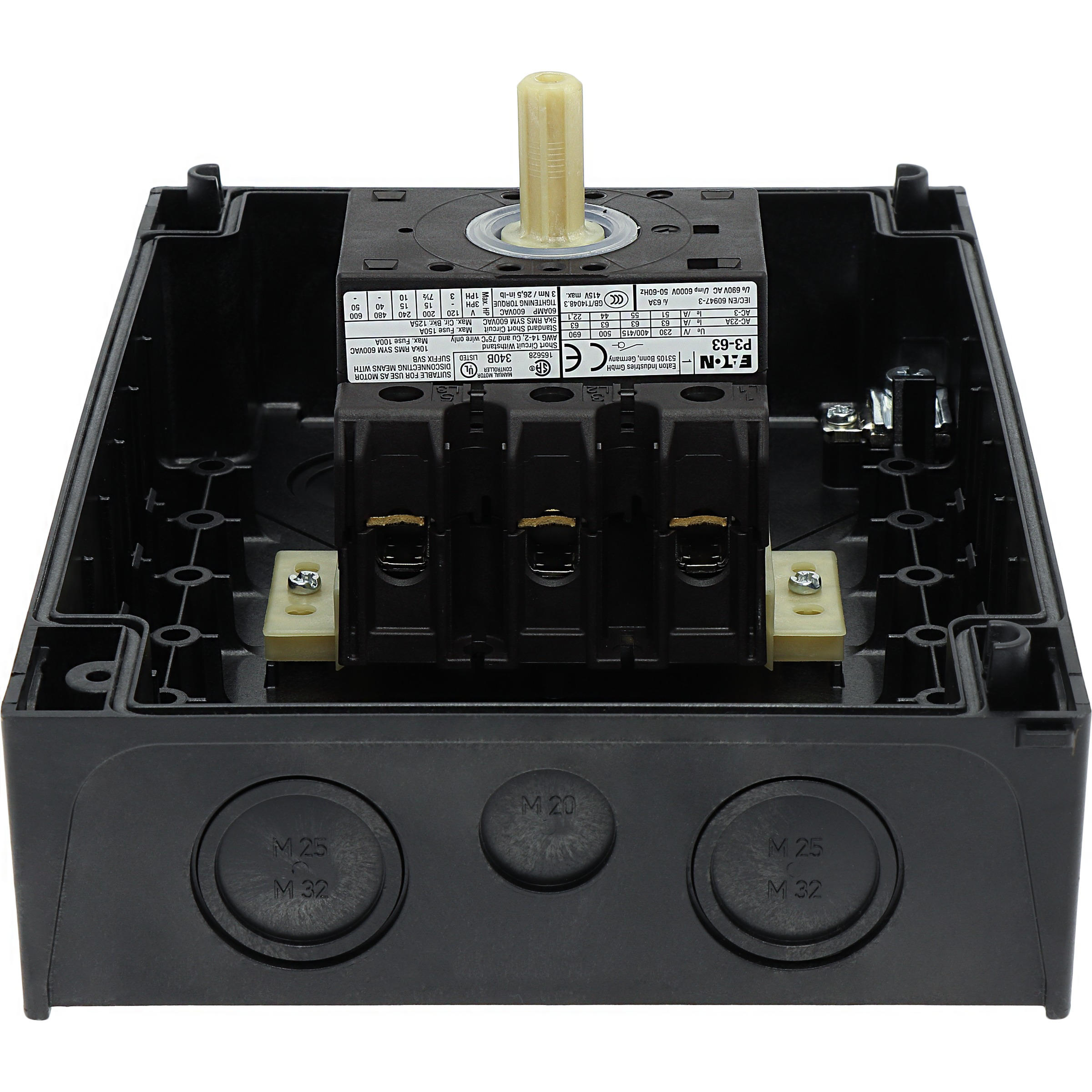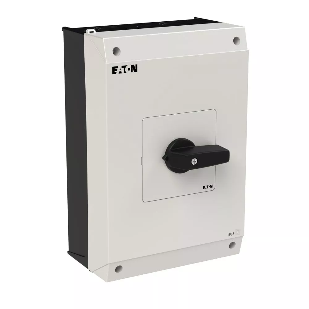 Przełącznik wł.-wył., Zacisk śrubowy: Przełącznik wł.-wył., Odniesienie do grupy części: P3, z czarnym pokrętłem z tabliczką czołową, Informacje dotyczące dostarczonego sprzętu: Styk pomocniczy lub przewód neutralny montowany przez użytkownika., 3-biegunowy, Stopień ochrony: IP65, Projekt: montaż powierzchniowy, Moc znamionowa AC-23A, 50 - 60 Hz 400 V: P = 30 kW, Znamionowy prąd ciągły: Iu = 63 A, Normy: IEC/EN 60947, VDE 0660, IEC/EN 60204, CSA, UL, Rozłącznik izolacyjny zgodnie z normą IEC/EN 60947-3
