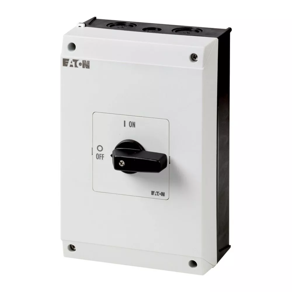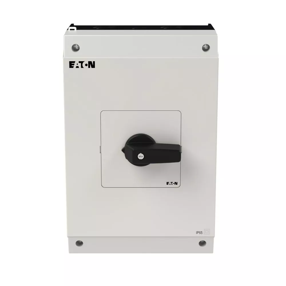 Przełącznik wł.-wył., Zacisk śrubowy: Przełącznik wł.-wył., Odniesienie grupy części P3, z czarnym pokrętłem z tabliczką czołową, Informacje dotyczące dostarczonego sprzętu: styk pomocniczy montowany przez użytkownika., 3-biegunowy + N, Stopień ochrony: IP65, Projekt: montaż powierzchniowy, Moc znamionowa AC-23A, 50 - 60 Hz 400 V: P = 30 kW, Znamionowy prąd ciągły: Iu = 63 A, Normy: IEC/EN 60947, VDE 0660, IEC/EN 60204, CSA, UL, Rozłącznik izolacyjny zgodnie z normą IEC/EN 60947-3
