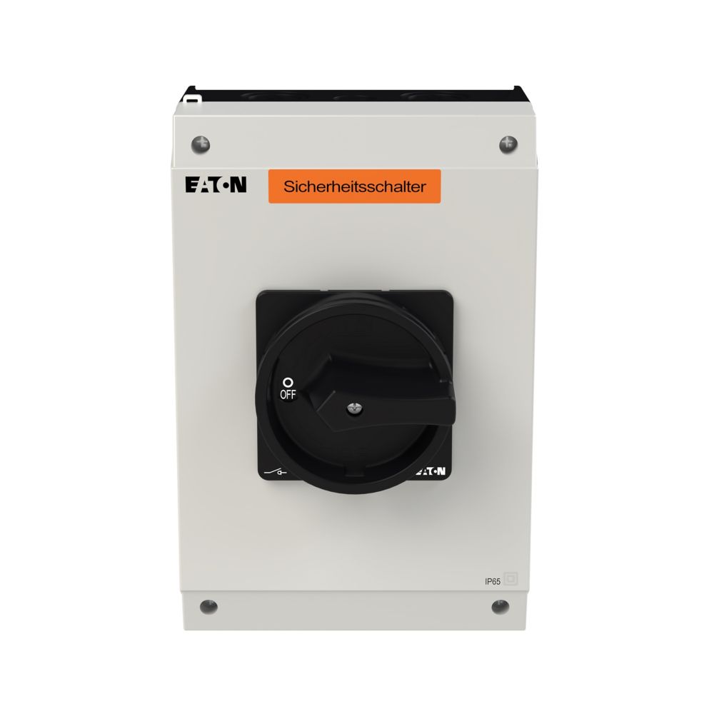 P3-63/I4-SI/HI11-SW Rozłącznik bezpieczeństwa, 3 bieg.+1NO+1NC, 63 A, funkcja awaryjnego zatrzymania, Blok. w pozycji 0 z osłoną blokady, z tabliczką ostrzegawczą "rozłącznik bezpieczeństwa", w obudowie IP65, pokrętło czarne z blokadą na kłódkę