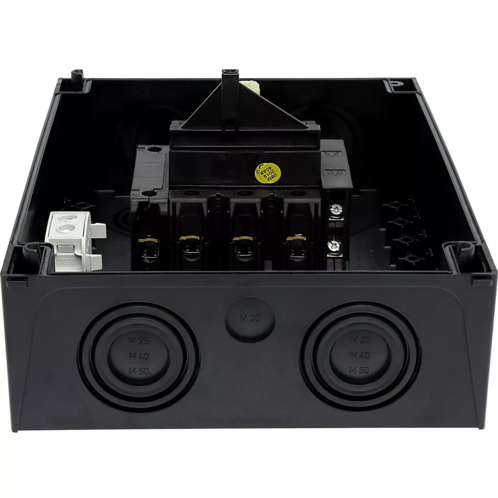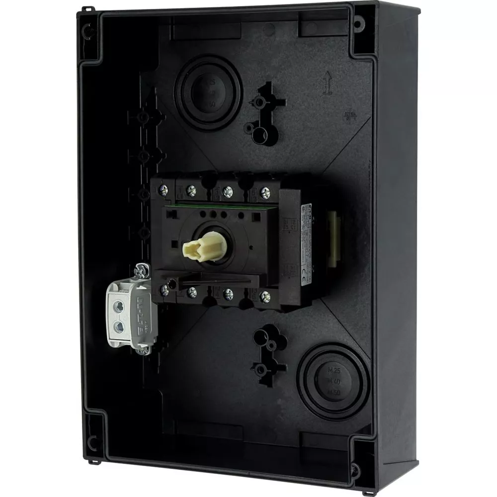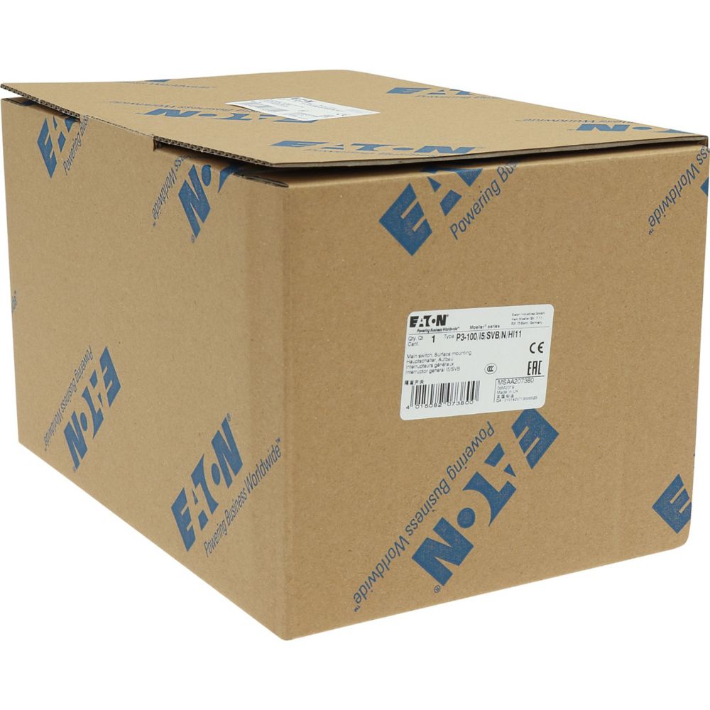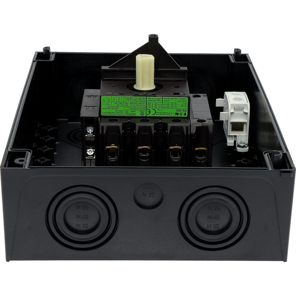 Wyłącznik główny, Zacisk śrubowy: Wyłącznik główny, wyłącznik serwisowy, Odniesienie grupy części: P3, Funkcja zatrzymania: Funkcja wyłączania awaryjnego, z czerwonym uchwytem obrotowym i żółtym pierścieniem blokującym, 3-biegunowy + N, Element blokujący: Możliwość zablokowania w położeniu 0 (Wył.), Stopień ochrony: IP65, Projekt: montaż powierzchniowy, Moc znamionowa AC-23A, 50 - 60 Hz 400 V: P = 55 kW, Znamionowy prąd ciągły: Iu = 100 A, Normy: IEC/EN 60947, VDE 0660, IEC/EN 60204, CSA, UL, Rozłącznik izolacyjny zgodnie z normą IEC/EN 60947-3