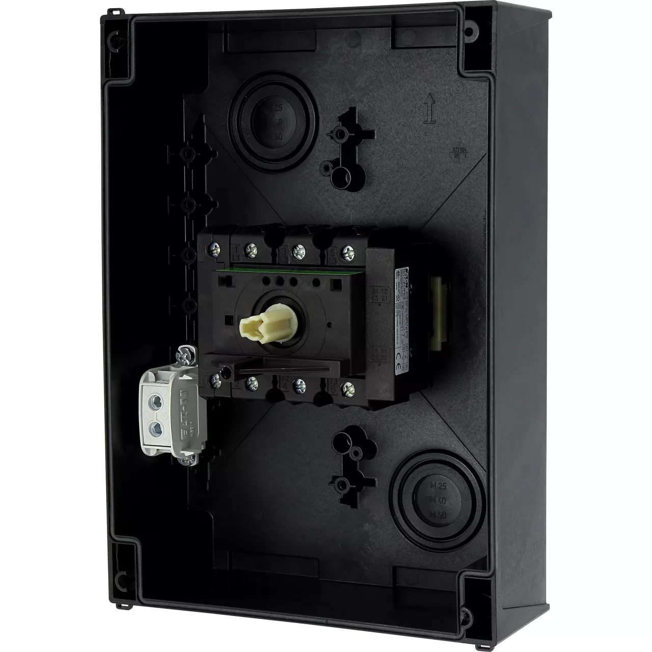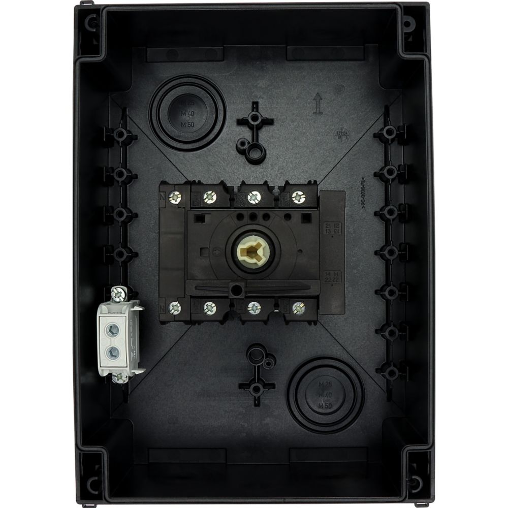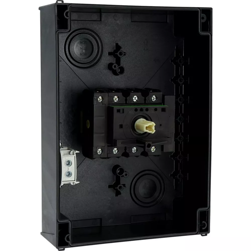 Wyłącznik główny, Zacisk śrubowy: Wyłącznik główny, wyłącznik serwisowy, Odniesienie grupy części: P3, Funkcja zatrzymania: Funkcja wyłączania awaryjnego, z czerwonym uchwytem obrotowym i żółtym pierścieniem blokującym, 3-biegunowy + N, Element blokujący: Możliwość zablokowania w położeniu 0 (Wył.), Stopień ochrony: IP65, Projekt: montaż powierzchniowy, Moc znamionowa AC-23A, 50 - 60 Hz 400 V: P = 55 kW, Znamionowy prąd ciągły: Iu = 100 A, Normy: IEC/EN 60947, VDE 0660, IEC/EN 60204, CSA, UL, Rozłącznik izolacyjny zgodnie z normą IEC/EN 60947-3