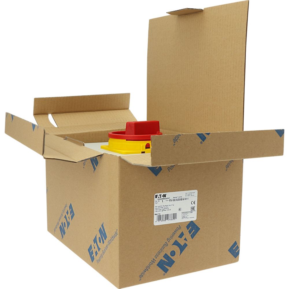 P3-100/I5/SVB/N/HI11 Rozłącznik główny, 3 bieg.+N+1NO+1NC, 100 A, w obudowie IP65, pokrętło czerwono-żółte z blokadą na kłódkę