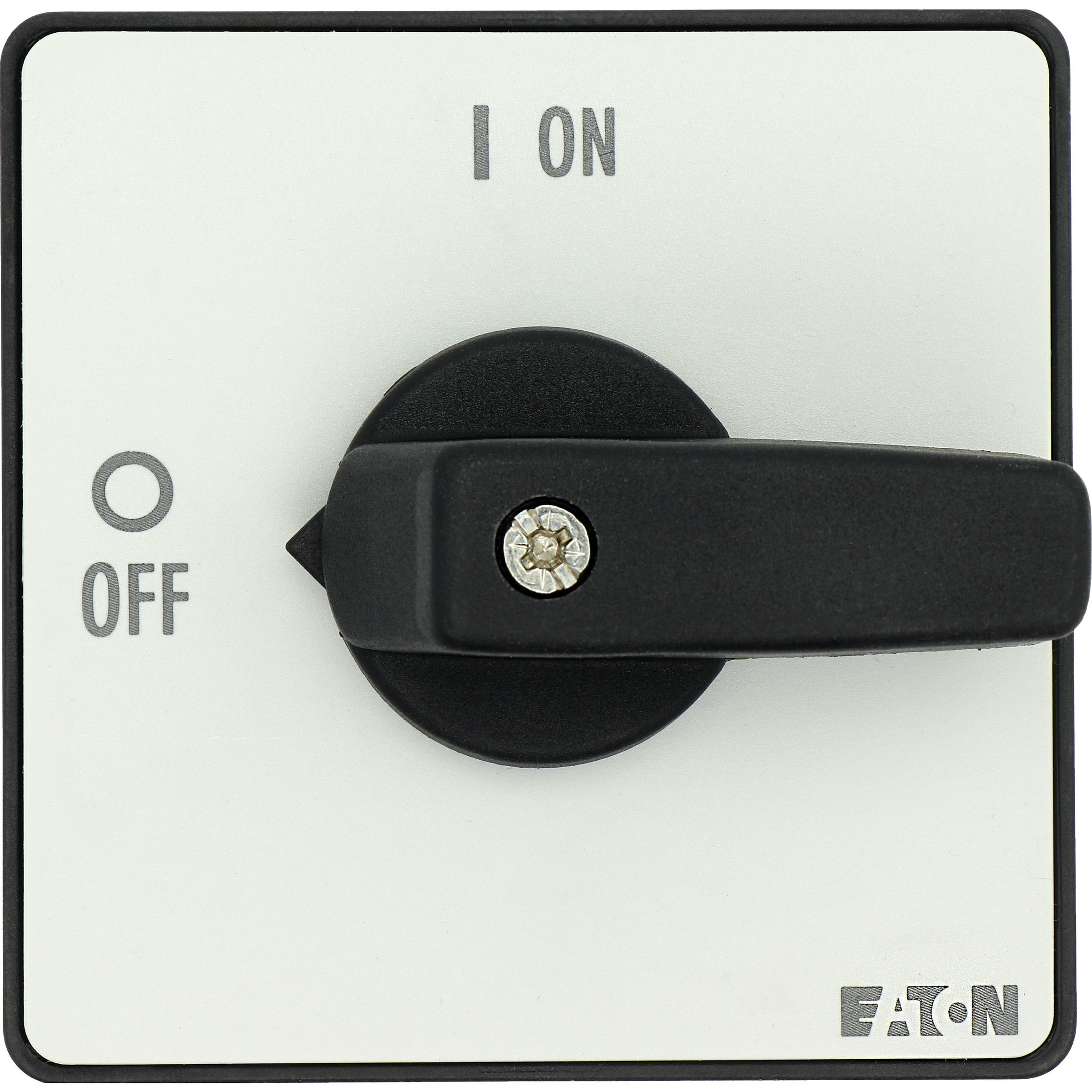 Przełącznik wł.-wył., Zacisk śrubowy: Przełącznik wł.-wył., Odniesienie grupy części T5, z czarnym pokrętłem z tabliczką czołową, 6-biegunowy, Stopień ochrony: Przód IP65, Projekt: montaż podtynkowy, Kąt przełączania: 90°, Przebieg łączenia: bez samopowrotu, tabliczka czołowa: 0-1, Moc znamionowa AC-23A, 50 - 60 Hz 400 V: P = 55 kW, Znamionowy prąd ciągły: Iu = 100 A, 4 zespoł montażowy, Normy: IEC/EN 60947, VDE 0660, IEC/EN 60204, Rozłącznik izolacyjny zgodnie z normą IEC/EN 60947-3