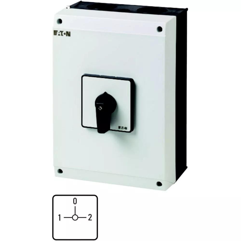 T5-4-8294/I5 Przełącznik zasilania, Styki: 8, 100 A, tabliczka: 1-0-2, 90 °, bez samopowrotu, w obudowie IP65, pokrętło czarne bez możliwości blokady