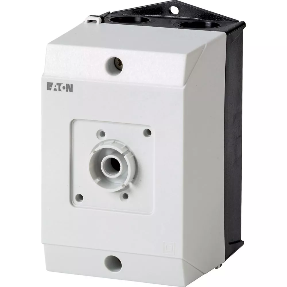 Mała obudowa, stopień ochrony IP65, poliwęglan wzmocniony włóknem szklanym, dolna część obudowy RAL 9005, czarny/tylko górna część obudowy RAL 7035, kolor jasnoszary, przebicie na wprowadzenie kabli metrycznych na górze, płyta podstawy i płyta tylna, membranowy przepust kablowy, 2 nasadki ochronne chroniące membranę do przeciągnięcia przewodów, lampka sygnalizacyjna L-. montowana w przepuście w podstawie M20/M25, do przełączników T0-../XZ, 3-4 zespoły montażowe