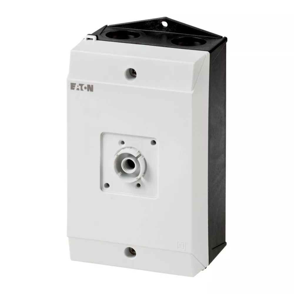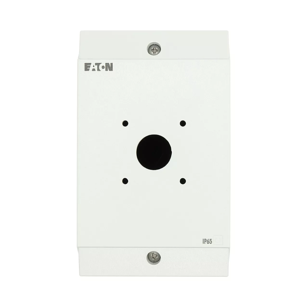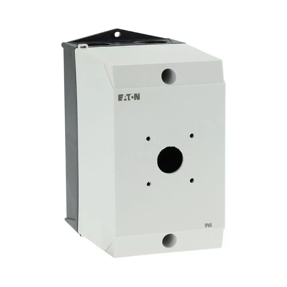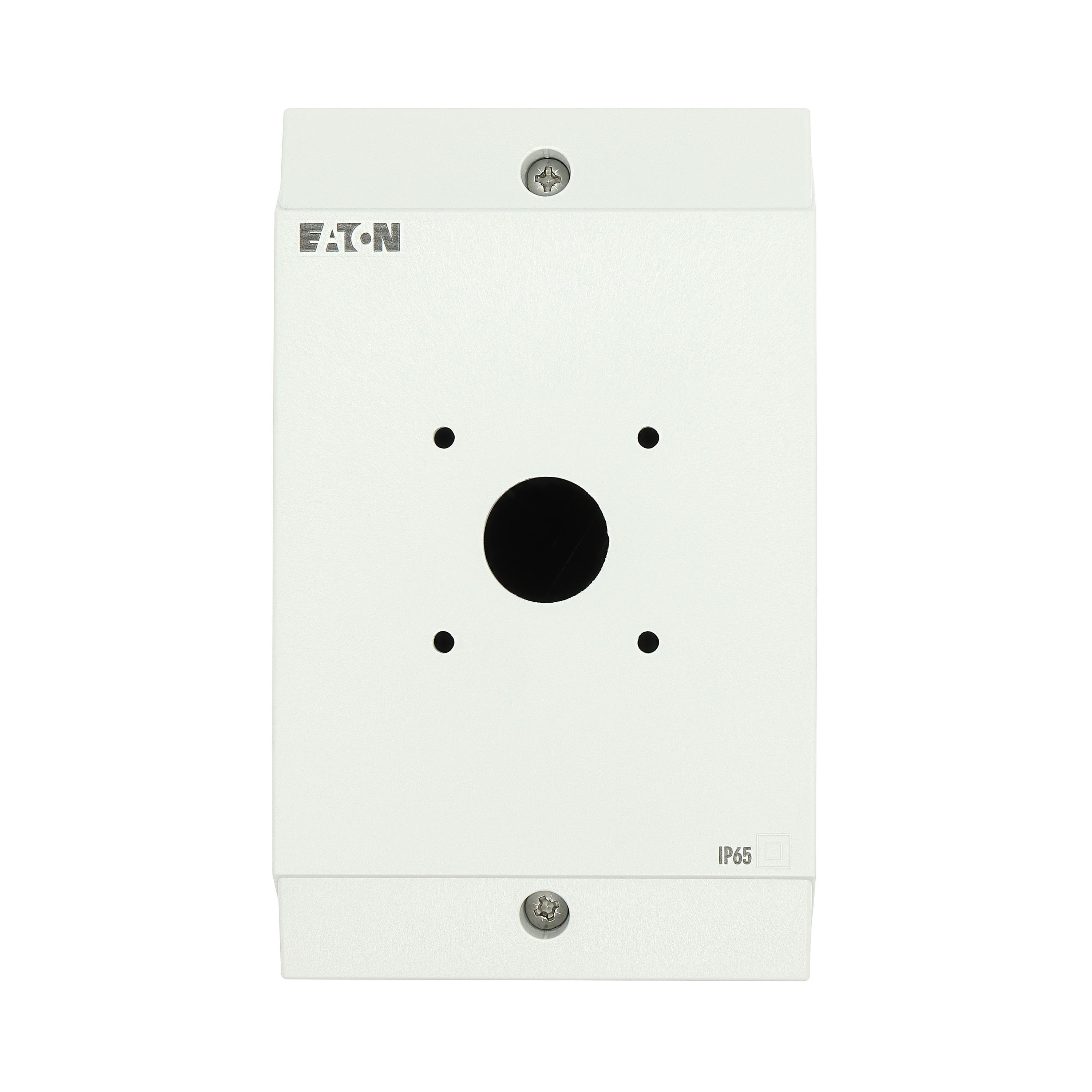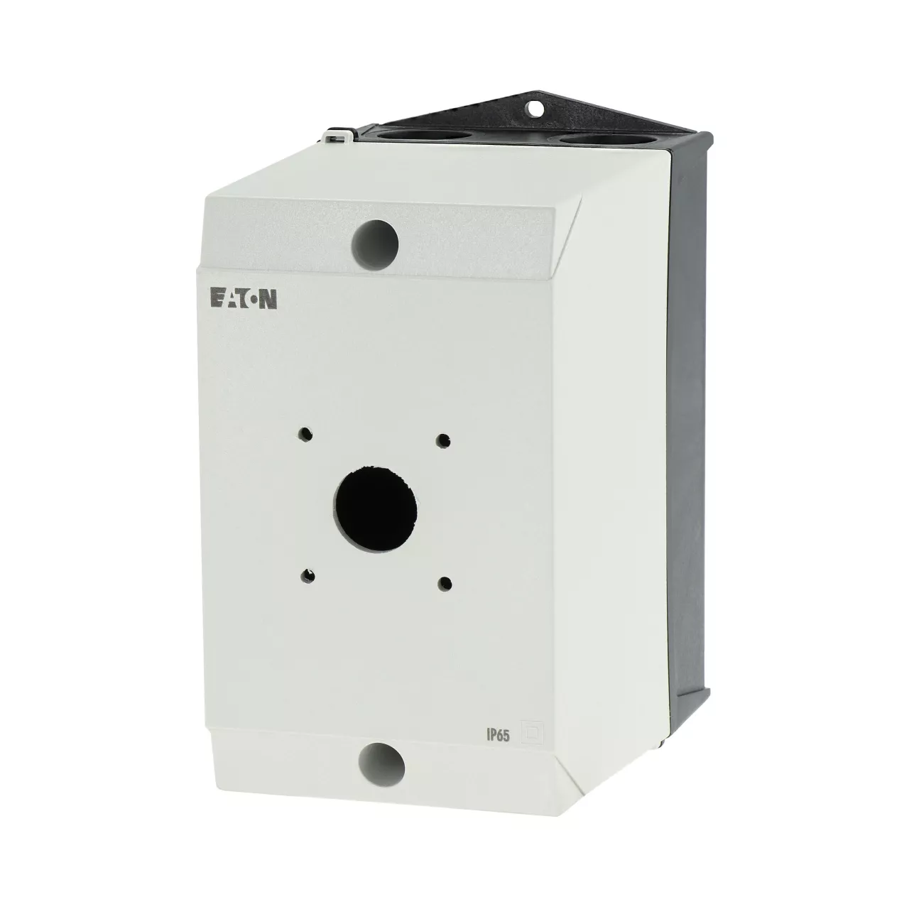 Mała obudowa, stopień ochrony IP65, poliwęglan wzmocniony włóknem szklanym, dolna część obudowy RAL 9005, czarny/tylko górna część obudowy RAL 7035, kolor jasnoszary, przebicie na wprowadzenie kabli metrycznych na górze, płyta podstawy i płyta tylna, membranowy przepust kablowy, 2 nasadki ochronne chroniące membranę do przeciągnięcia przewodów, lampka sygnalizacyjna L-. montowana w przepuście w podstawie M20/M25, do przełączników T3-../Z, 5 zespoły montażowe