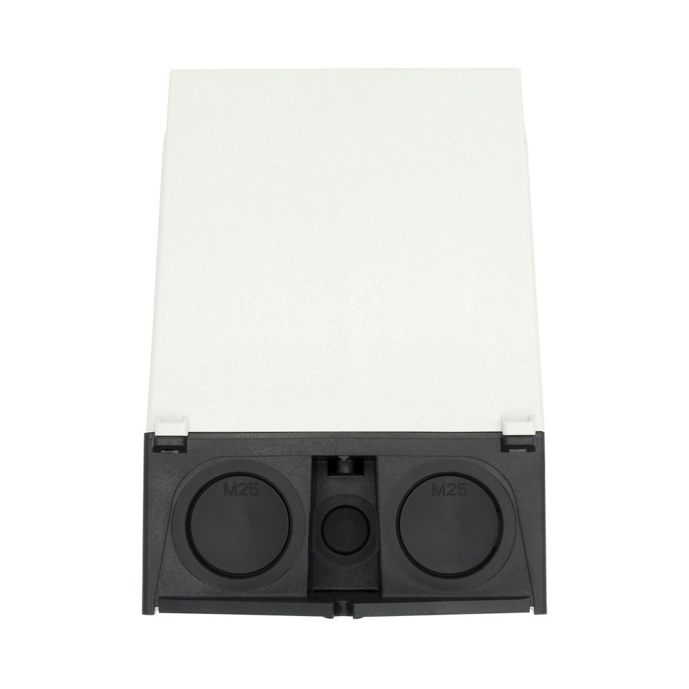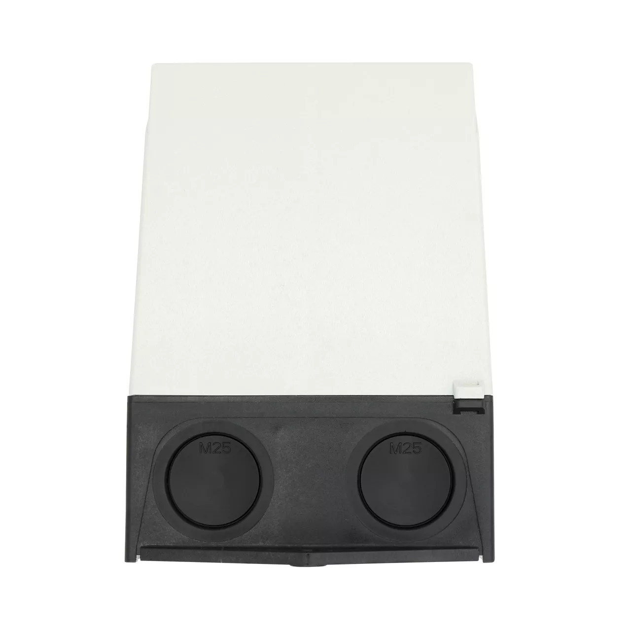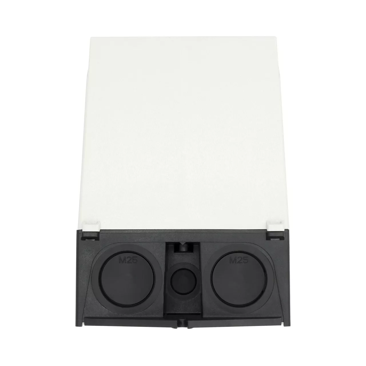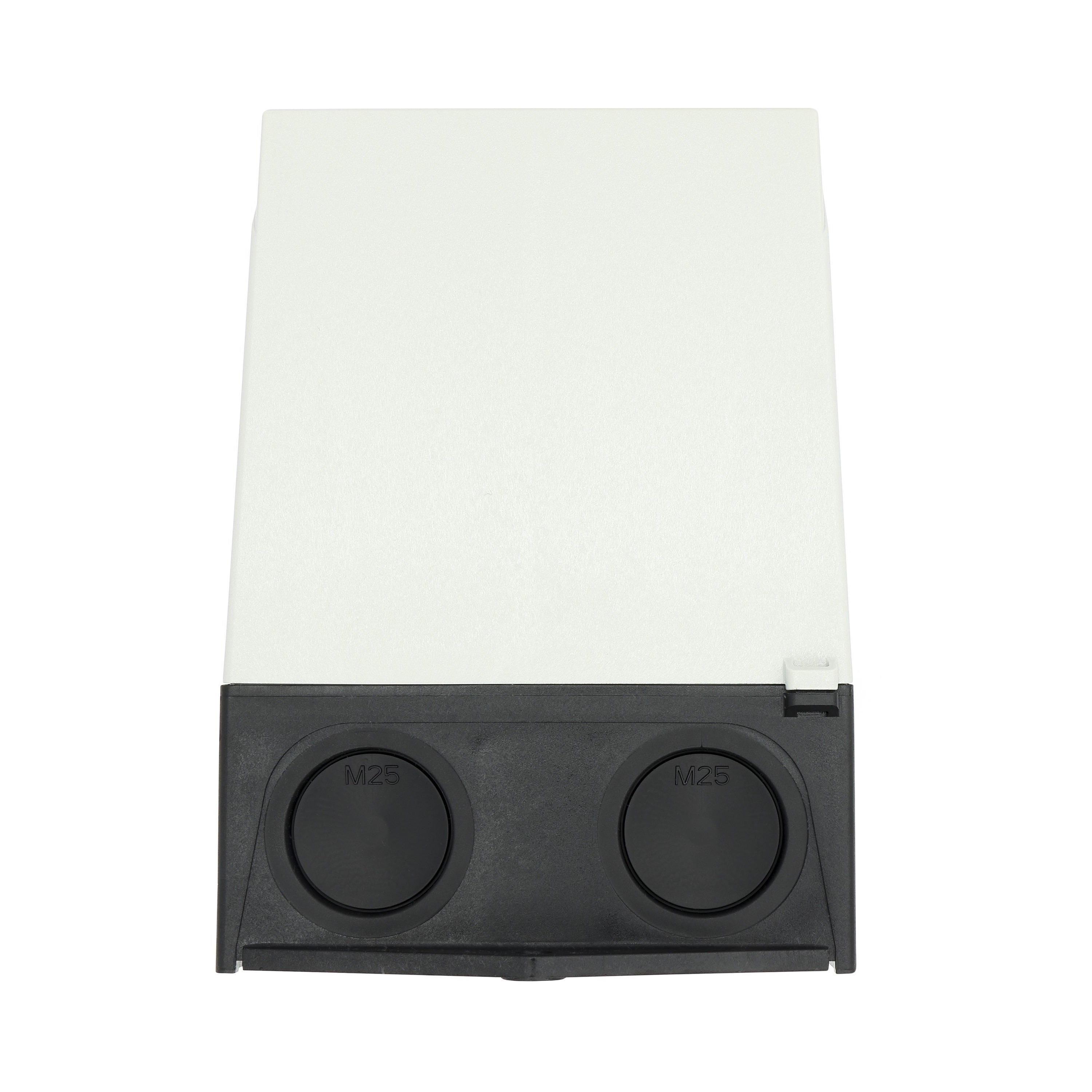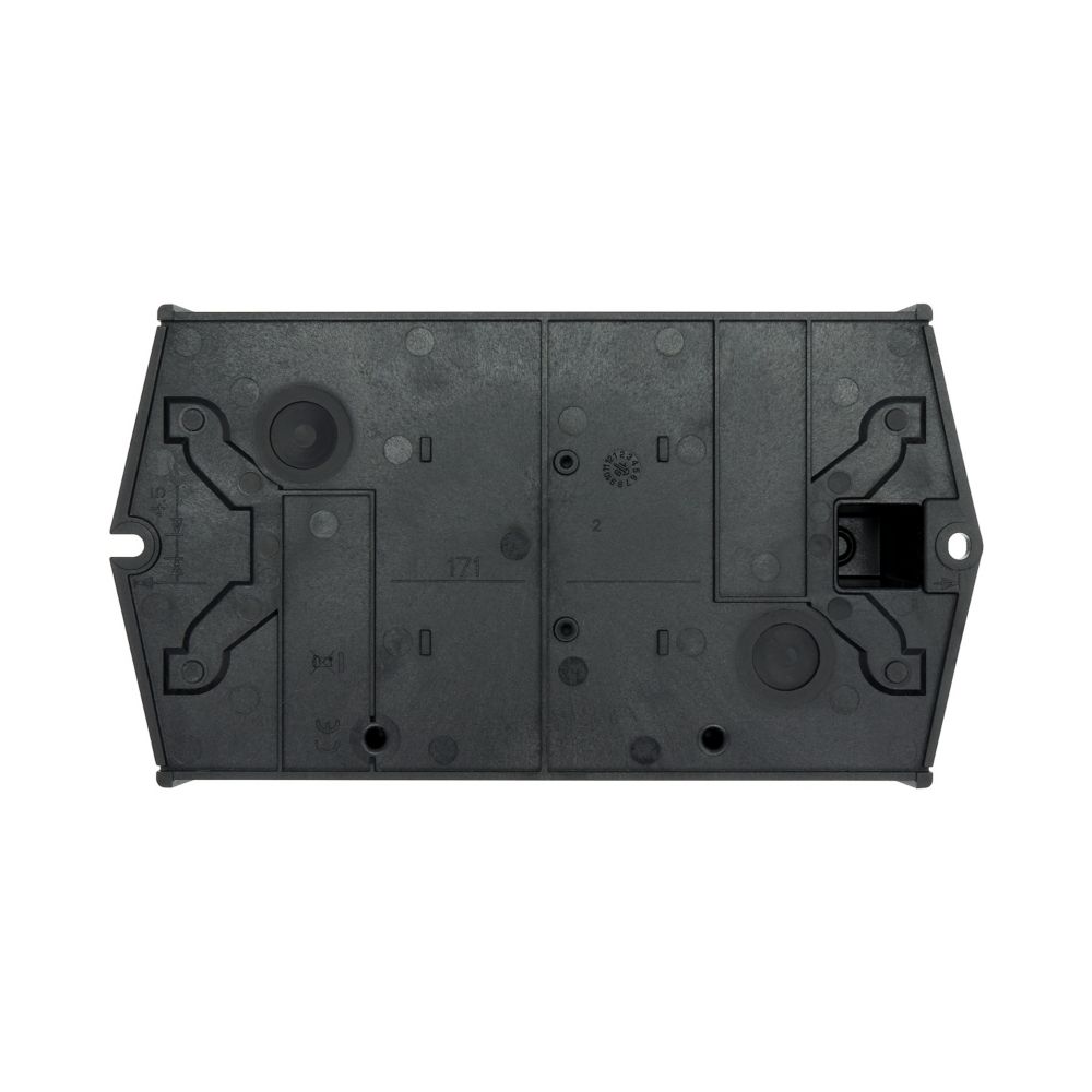 Mała obudowa, stopień ochrony IP65, poliwęglan wzmocniony włóknem szklanym, dolna część obudowy RAL 9005, czarny/tylko górna część obudowy RAL 7035, kolor jasnoszary, przebicie na wprowadzenie kabli metrycznych na górze, płyta podstawy i płyta tylna, membranowy przepust kablowy, 2 nasadki ochronne chroniące membranę do przeciągnięcia przewodów, lampka sygnalizacyjna L-. montowana w przepuście w podstawie M20/M25, do przełączników T3-../Z, 5 zespoły montażowe
