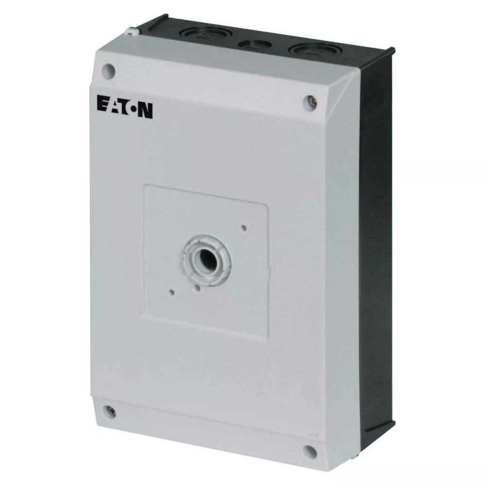 Mała obudowa, stopień ochrony IP65, poliwęglan wzmocniony włóknem szklanym, dolna część obudowy RAL 9005, czarny/tylko górna część obudowy RAL 7035, kolor jasnoszary, przebicie na wprowadzenie kabli metrycznych na górze, płyta podstawy i płyta tylna, metryczne wyłamywane otwory na przepusty kablowe, wprowadzenie przewodu sterowniczego, lampka sygnalizacyjna L-. montowana w przepuście w podstawie M20/M25, do przełączników T5-../Z, 3-4 zespoły montażowe
