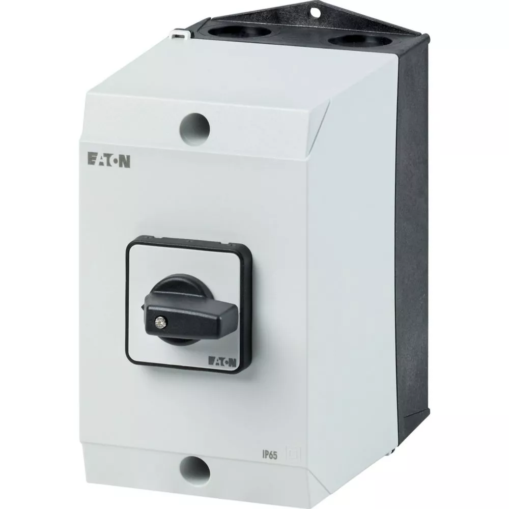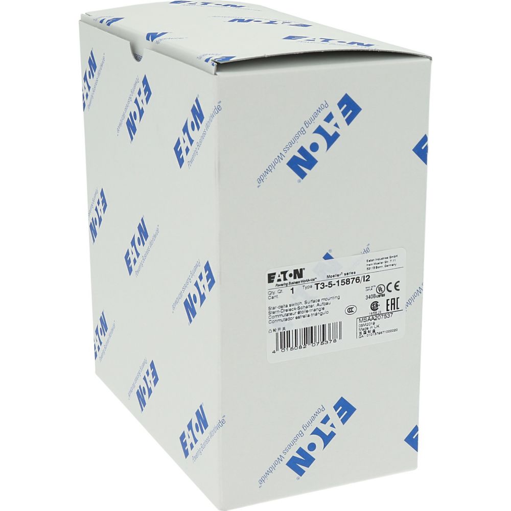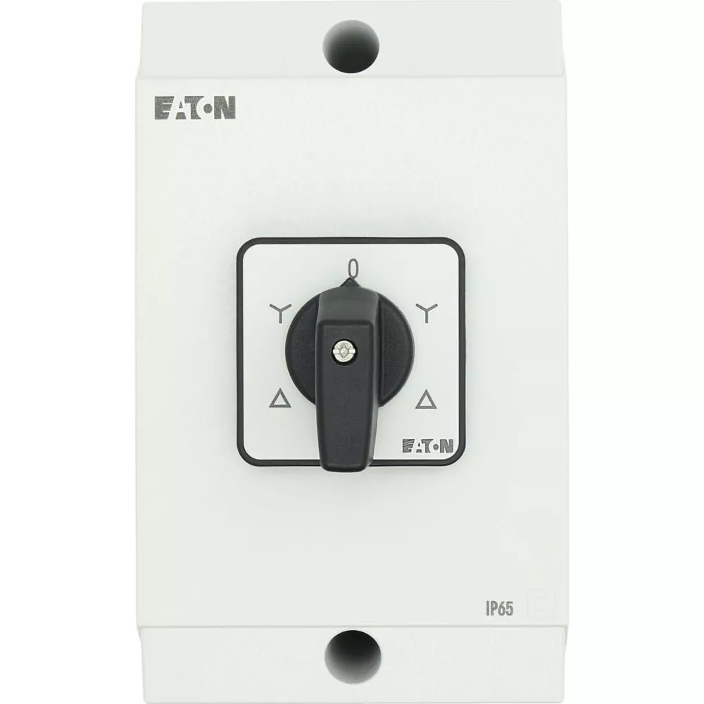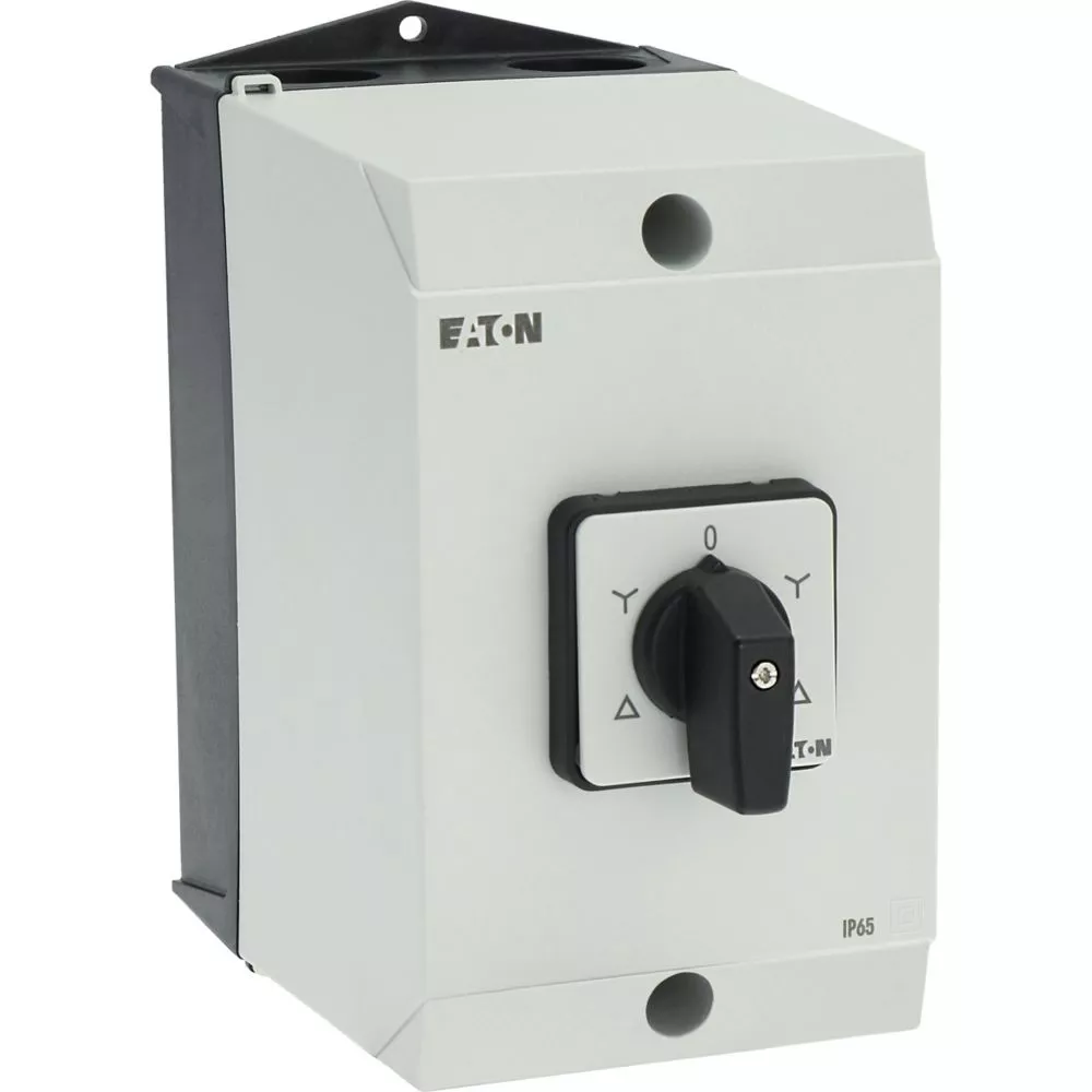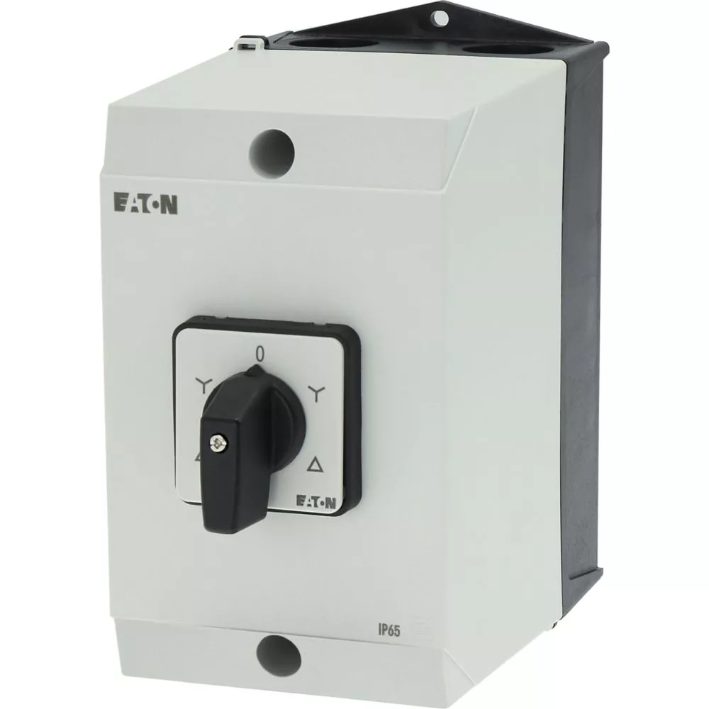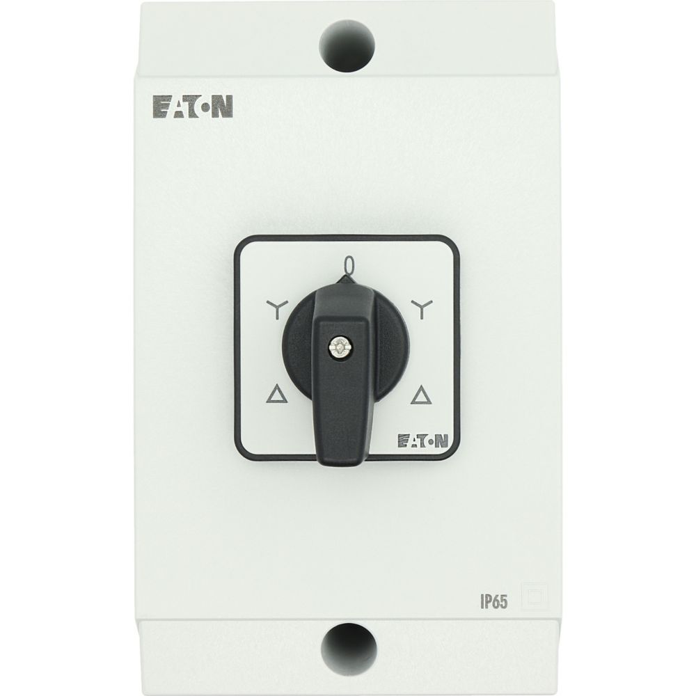 Nawrotny przełącznik gwiazda-trójkąt, Zacisk śrubowy: Łączniki sterownicze, Odniesienie grupy części T3, z czarnym pokrętłem z tabliczką czołową, Zestyki: 10, Stopień ochrony: IP65, Projekt: montaż powierzchniowy, Kąt przełączania: 60°, Przebieg łączenia: bez samopowrotu, Z pozycją 0 (wył.), tabliczka czołowa: D-Y-0-Y-D, Moc znamionowa AC-23A, 50 - 60 Hz 400 V: P = 15 kW, Znamionowy prąd ciągły: Iu = 32 A, 5 zespoł montażowy, Normy: IEC/EN 60947, VDE 0660, IEC/EN 60204, CSA, UL, Rozłącznik izolacyjny zgodnie z normą IEC/EN 60947-3