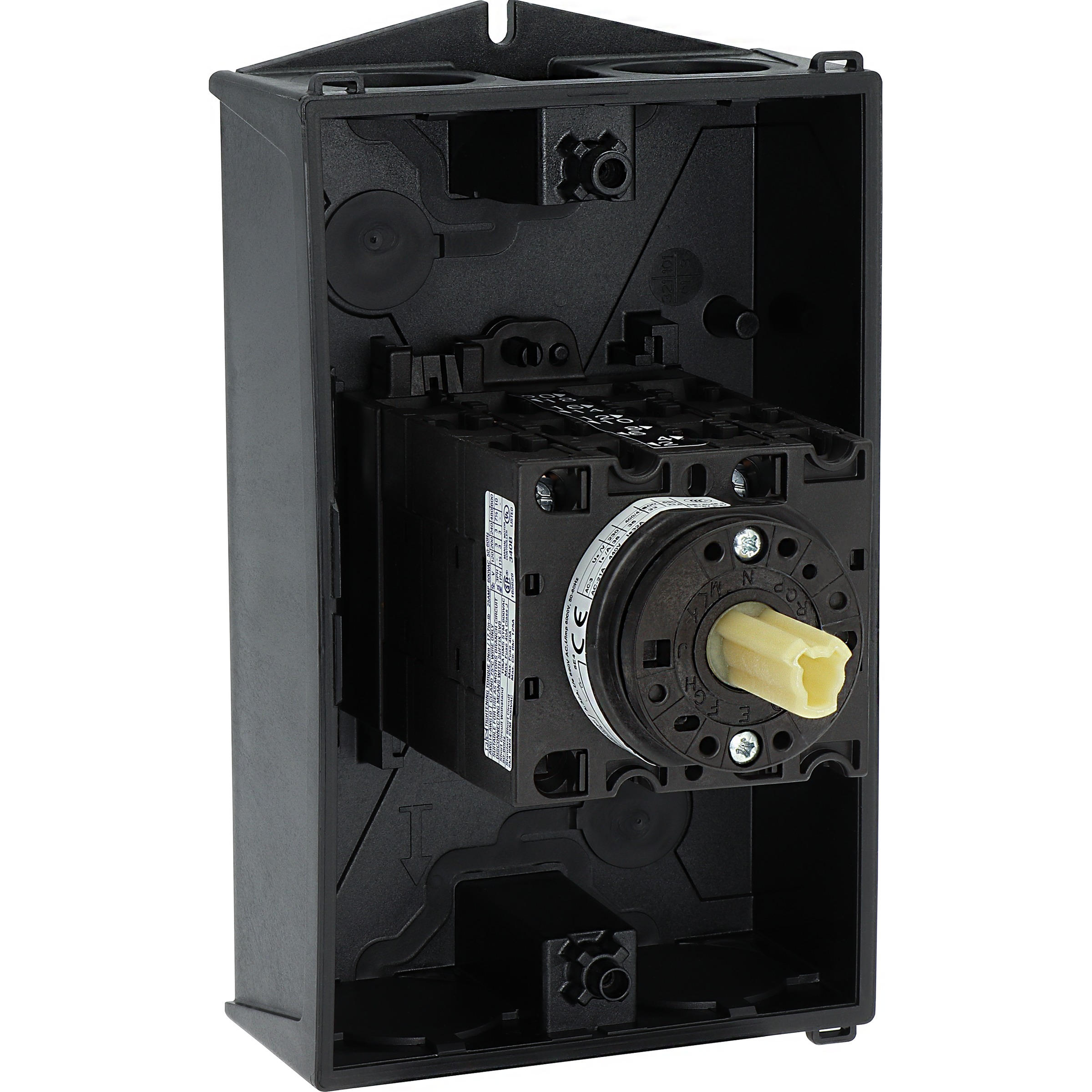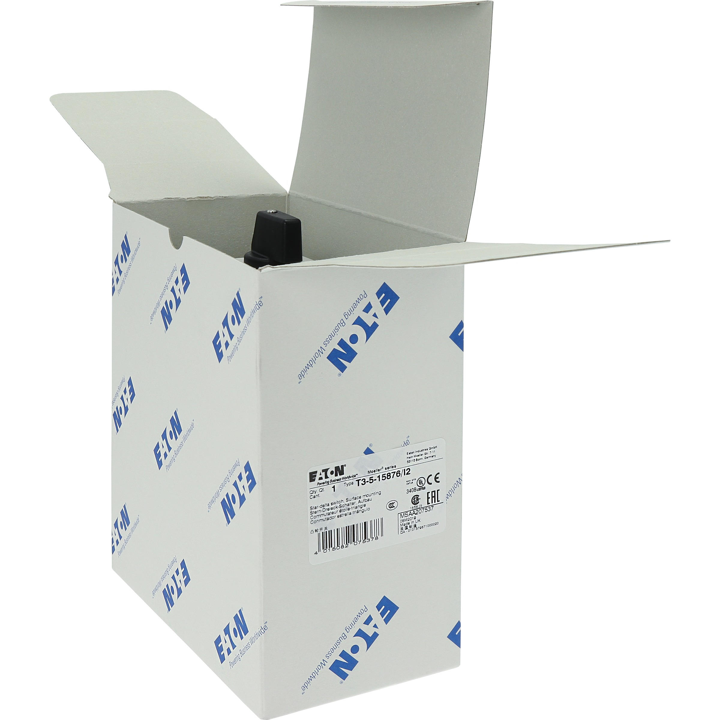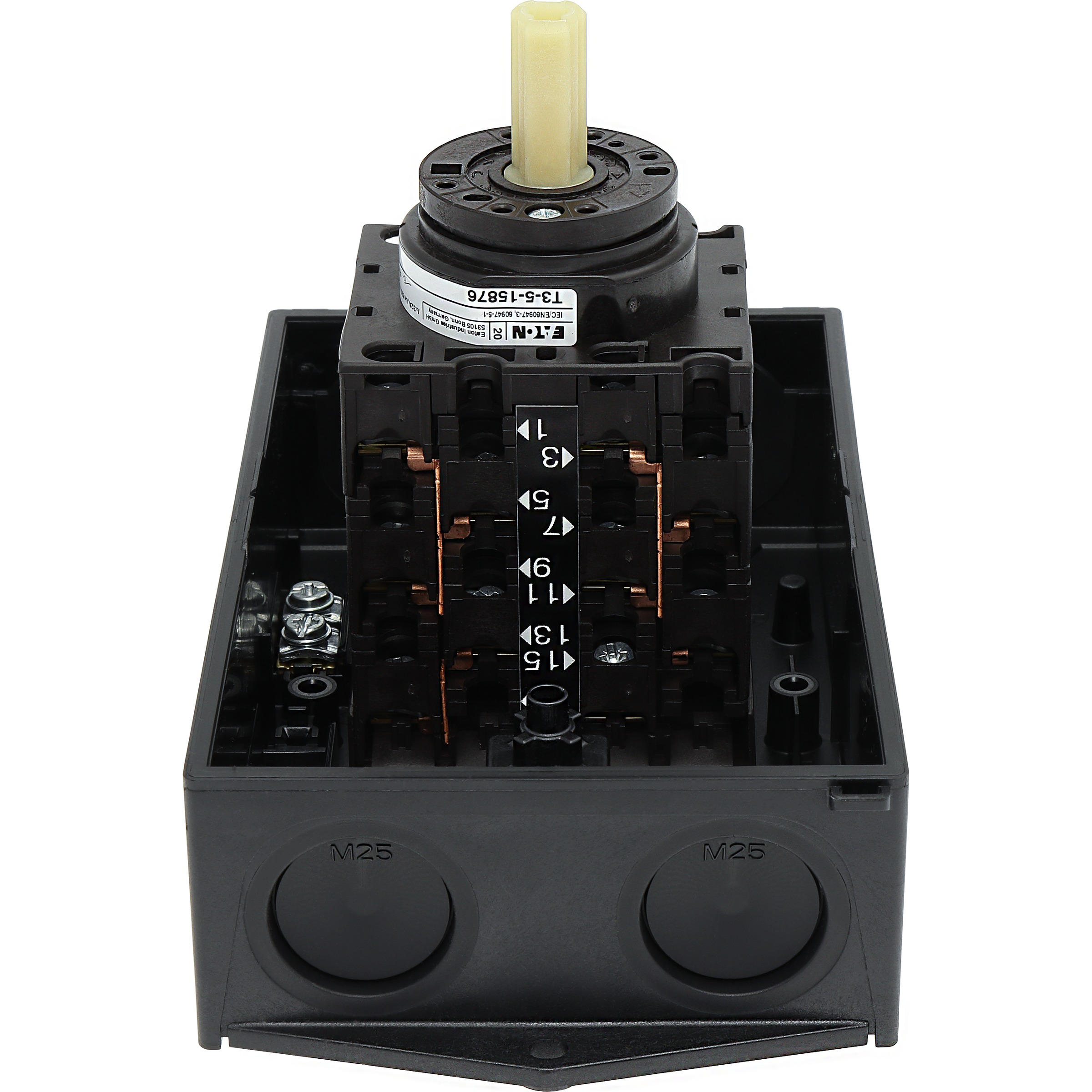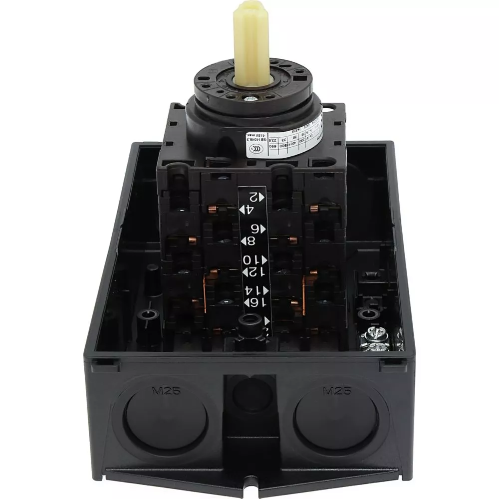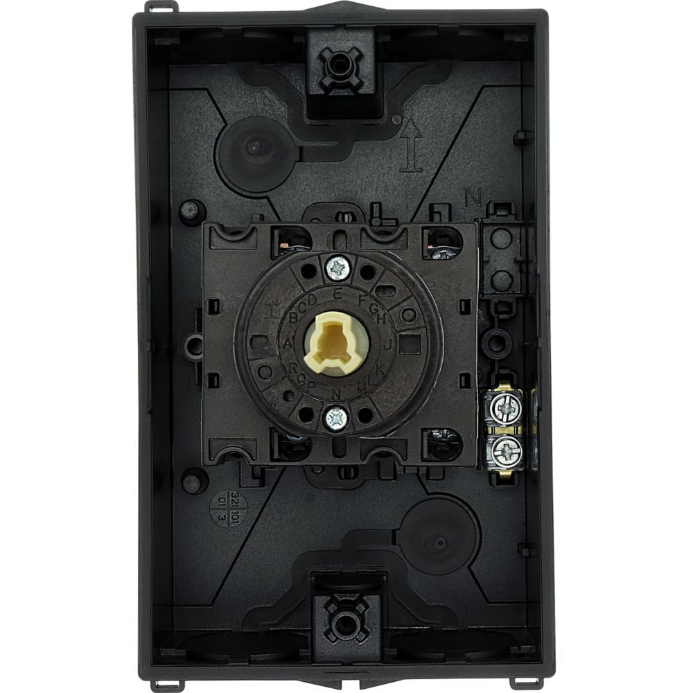 Nawrotny przełącznik gwiazda-trójkąt, Zacisk śrubowy: Łączniki sterownicze, Odniesienie grupy części T3, z czarnym pokrętłem z tabliczką czołową, Zestyki: 10, Stopień ochrony: IP65, Projekt: montaż powierzchniowy, Kąt przełączania: 60°, Przebieg łączenia: bez samopowrotu, Z pozycją 0 (wył.), tabliczka czołowa: D-Y-0-Y-D, Moc znamionowa AC-23A, 50 - 60 Hz 400 V: P = 15 kW, Znamionowy prąd ciągły: Iu = 32 A, 5 zespoł montażowy, Normy: IEC/EN 60947, VDE 0660, IEC/EN 60204, CSA, UL, Rozłącznik izolacyjny zgodnie z normą IEC/EN 60947-3