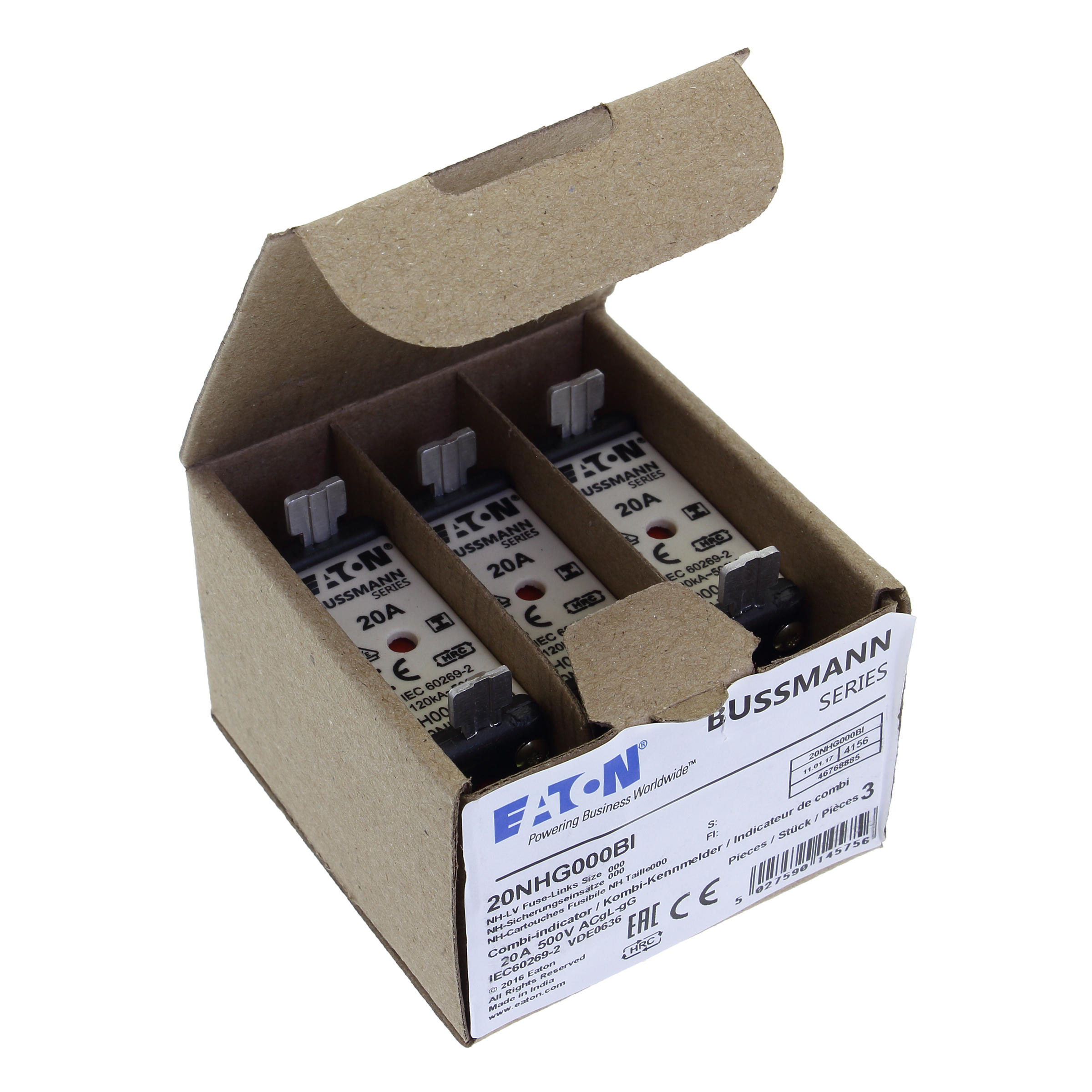 zekering, zekeringelement, Lage spanning, 20 A, AC 500 V, NH000, gL/gG, IEC, dubbel (combinatie-) meldersysteem, vierkant huis met mescontacten, geïsoleerde grepen, IEC 60269-2 zekeringsysteem A, DIN 43620, VDE 0636-2, uitschakelvermogen 120 kA
