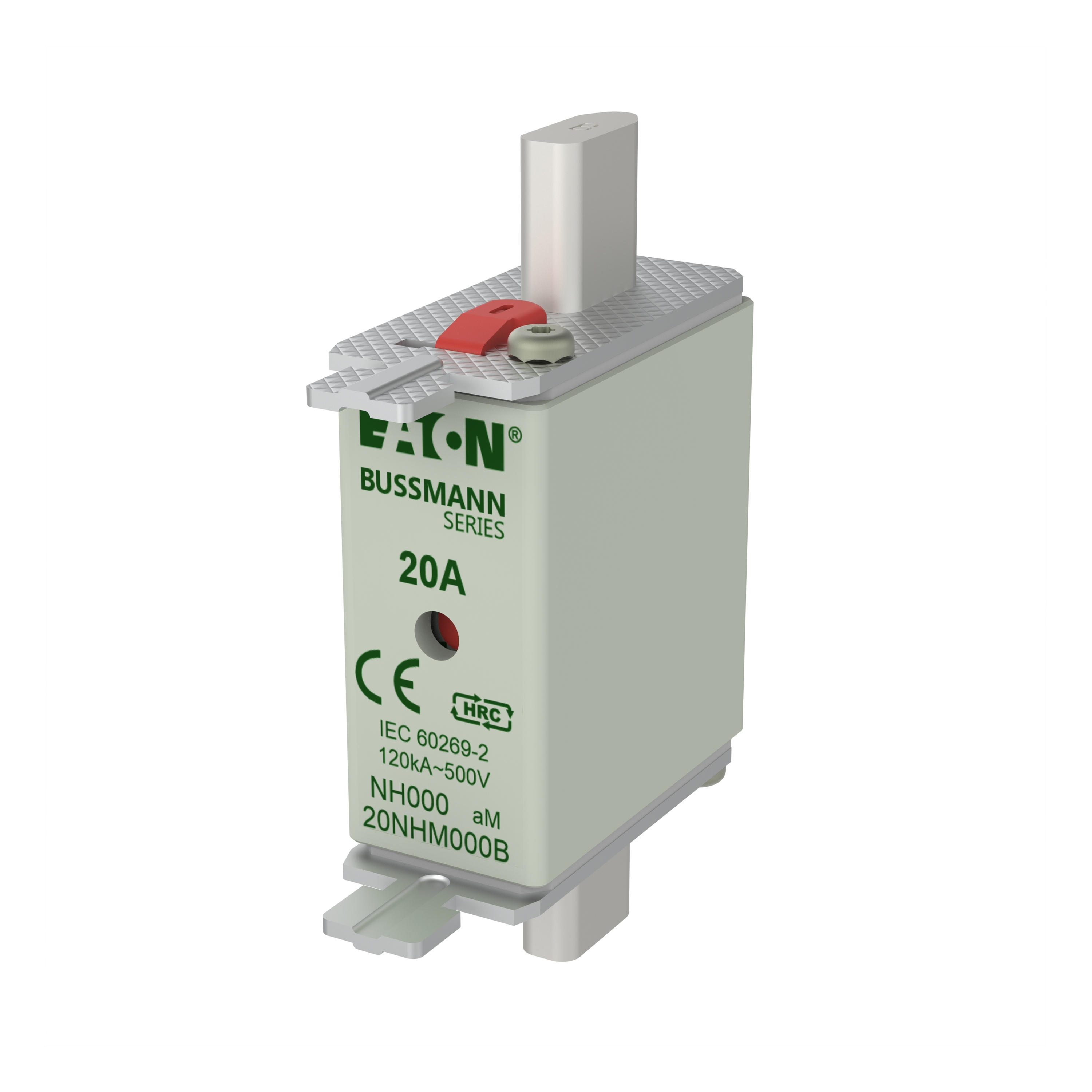 Bezpiecznik, Wkładka bezpiecznikowa, Niskie napięcie, 20 A, AC 500 V, NH000, aM, IEC, sygnalizator podwójny, korpus kwadratowy ze stykami nożowymi, ruchome uchwyty, IEC 60269-2 układ bezpiecznikowy A, DIN 43620, VDE 0636-2, Zdolność wyłączania 120 kA