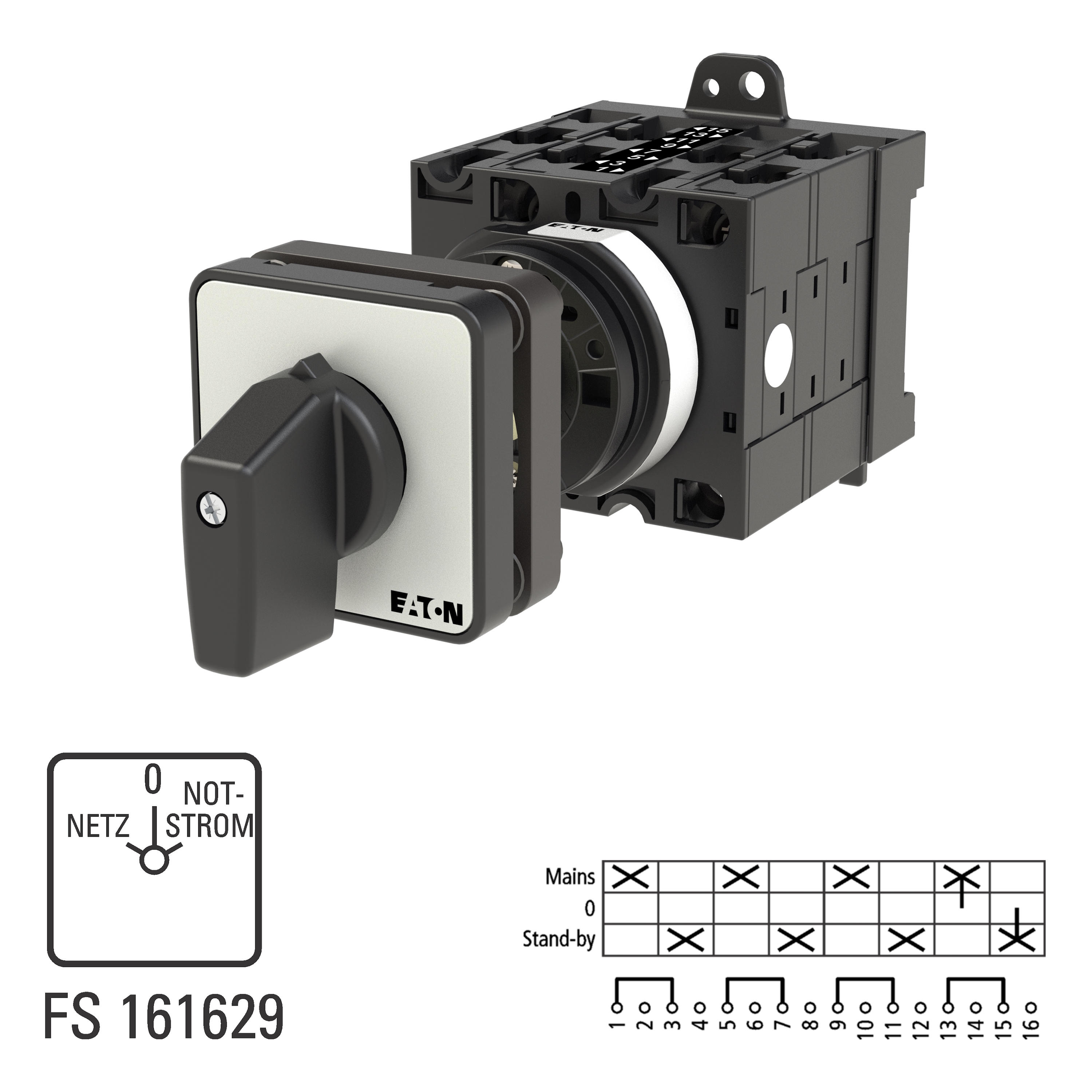 Przełącznik, Zacisk śrubowy: Łączniki sterownicze, Odniesienie grupy części T3, z czarnym pokrętłem z tabliczką czołową, Zestyki: 8, Stopień ochrony: Przód IP65, Projekt: montaż na panelu tylnym, Kąt przełączania: 60°, Przebieg łączenia: bez samopowrotu, Z pozycją 0 (wył.), tabliczka czołowa: Netz-0-Notstrom, Moc znamionowa AC-23A, 50 - 60 Hz 400 V: P = 15 kW, Znamionowy prąd ciągły: Iu = 32 A, 4 zespoł montażowy, Normy: IEC/EN 60947, VDE 0660, IEC/EN 60204, CSA, UL, Rozłącznik izolacyjny zgodnie z normą IEC/EN 60947-3
