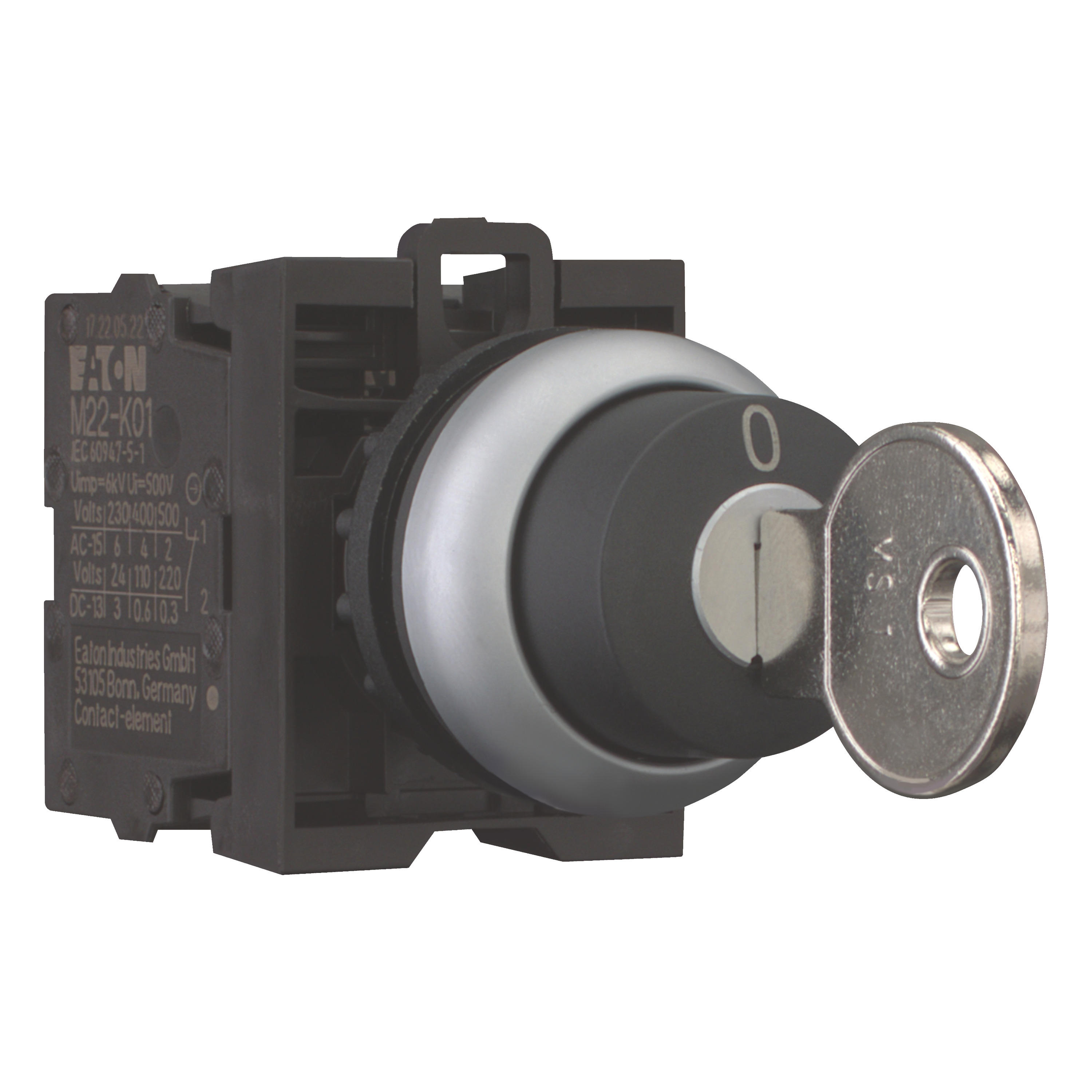 Element uruchamiający z kluczem, RMQ-Titan, Kompletna jednostka, bez samopowrotu, Funkcja: 60°, Typ połączenia: Podłączenie na śrubę, I, Stopień ochrony: IP66, Pierścień czołowy: tytan, Podłączanie do SmartWire-DT: nie, Styki N/C (R) = rozwierne: 1 R, Z = Zwierny: 1 Z, Styki Uwagi: = funkcja bezpieczeństwa, przez wymuszone otwarcie do IEC/EN 60947-5-1, Skok elementu uruchamiającego i siła załączania zgodnie z DIN EN 60947-5-1, K.5.4.1: mm 4,8, Maksymalny skok: mm 5,7, Minimalna siła do wymuszonego otwarcia: 20 N, Wymiary przedniej części: 29,7, Instrukcje: Funkcja zatrzymania / powracania przycisku, może zostać zmieniony za pomocą elementów kodujących M22-XC-Y, Konfigurowalny kluczyk wysuwny z adapterami kodującymi M22-XC-…